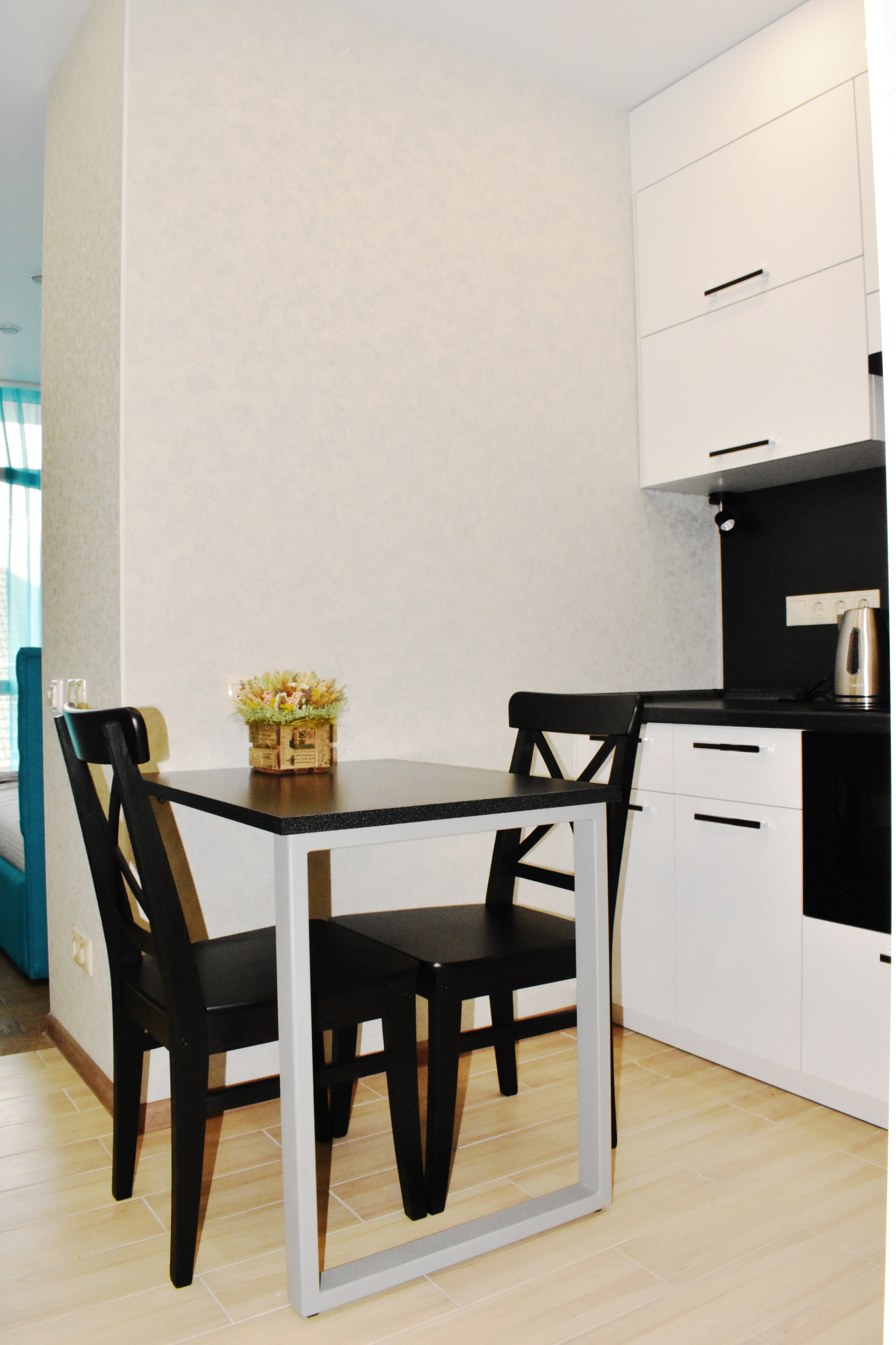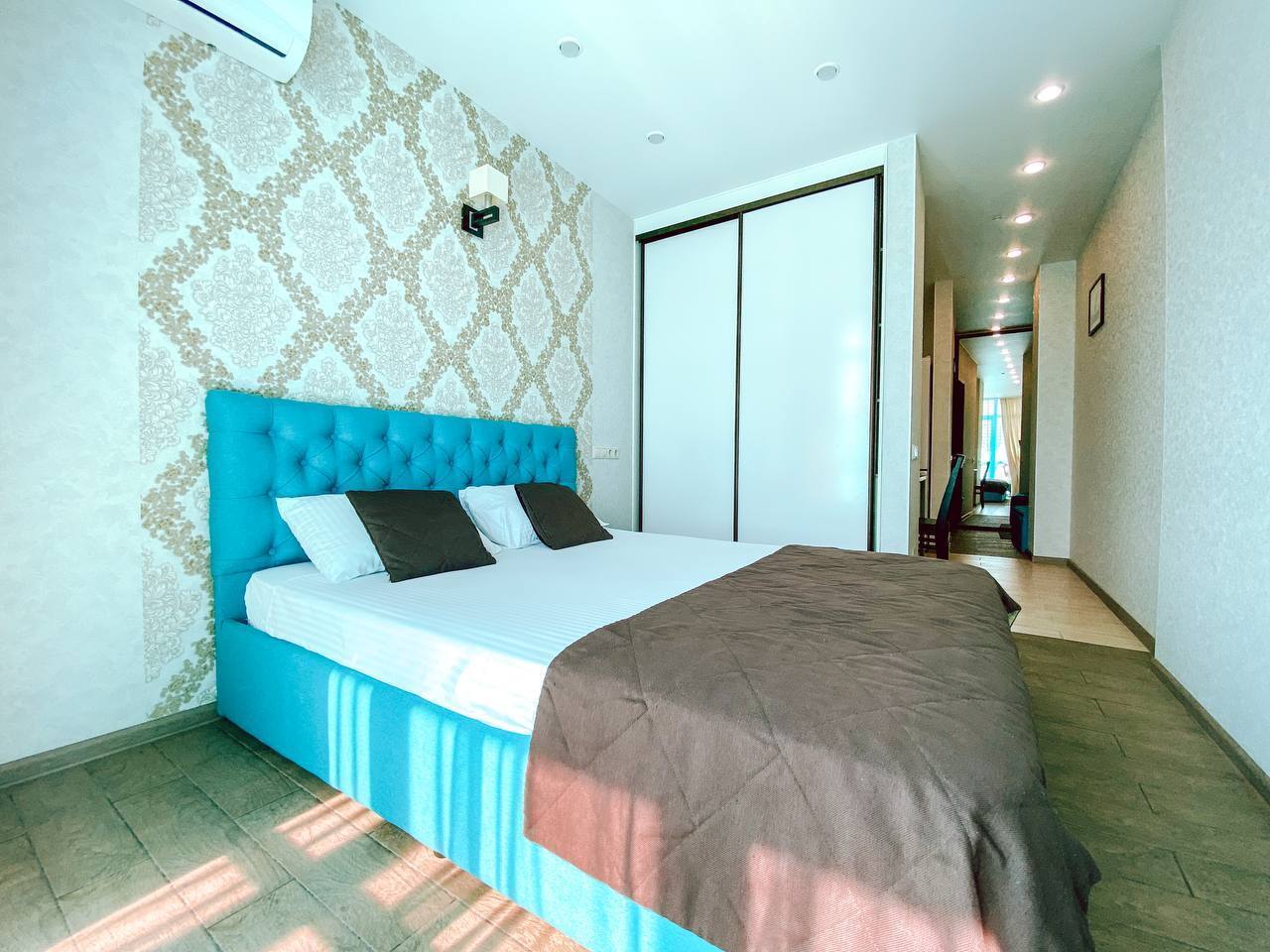 В номере: вешалка, зеркало, кровать двуспальная, стол, стулья, шкаф, кондиционер, микроволновая печь, набор посуды, плита электрическая, посудомоечная машина, стиральная машина, телевизор, холодильник, электрочайник