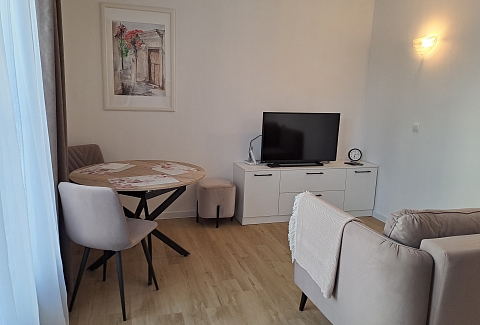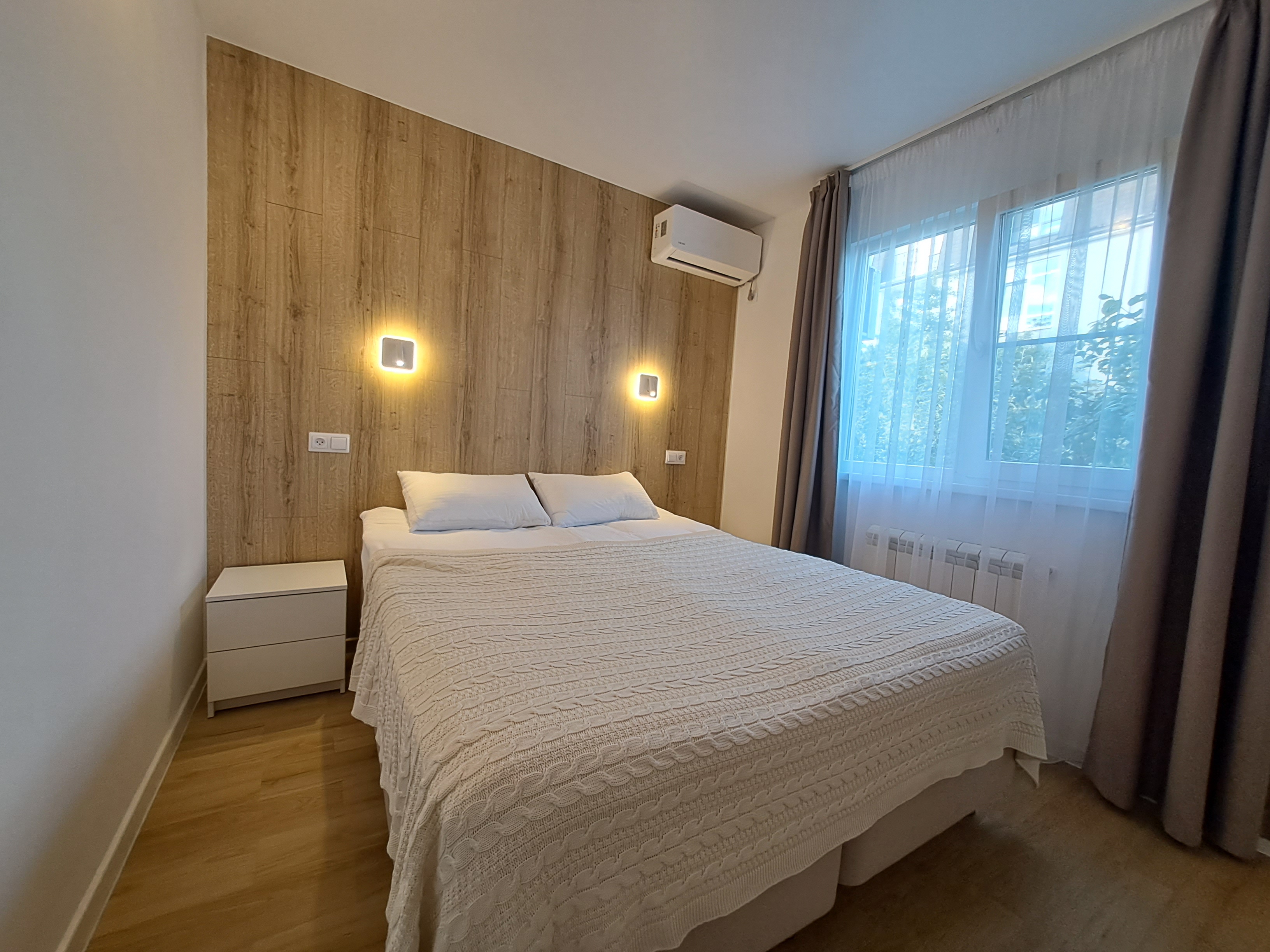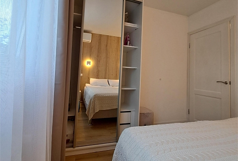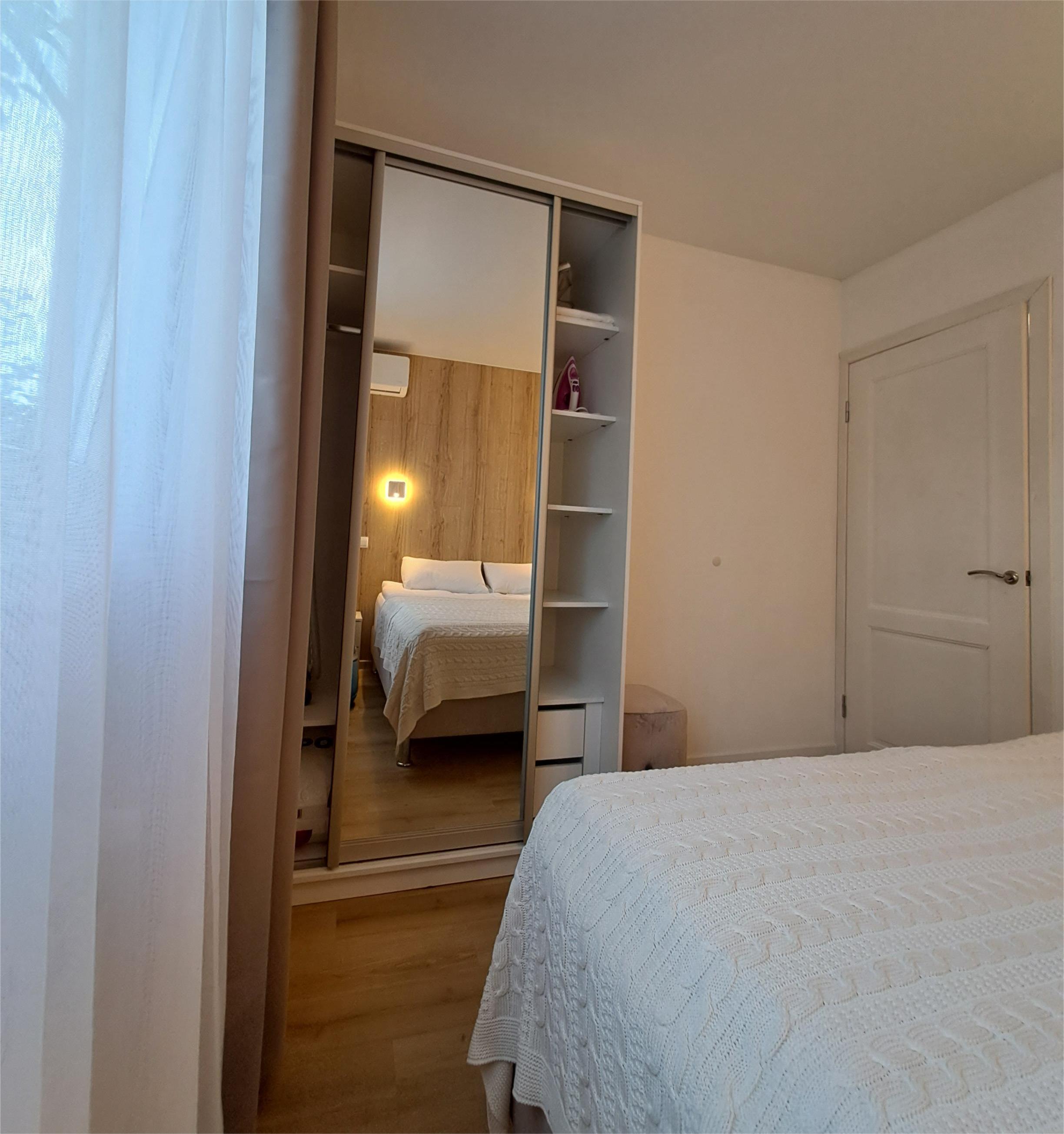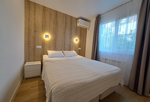 В спальне двухспальная кровать, либо две односпальные, спальные принадлежности, шкаф, прикроватная тумбочка, светильники. Есть утюг, гладильная доска, кондиционер. В комнате раскладной диван, стол, стулья, пуфики, комод, ТВ, WiFi, кухонный гарнитур, набор посуды для готовки и сервировки, СВЧ, холодильник, варочная панель, вытяжка, чайник. В санузле душ, туалет, раковина, стиральная машина, полотенцесушитель, фен, зеркало, набор санитарно- гигиенических принадлежностей. В саду есть патио. В 790 метрах находится оборудованный галечный пляж.