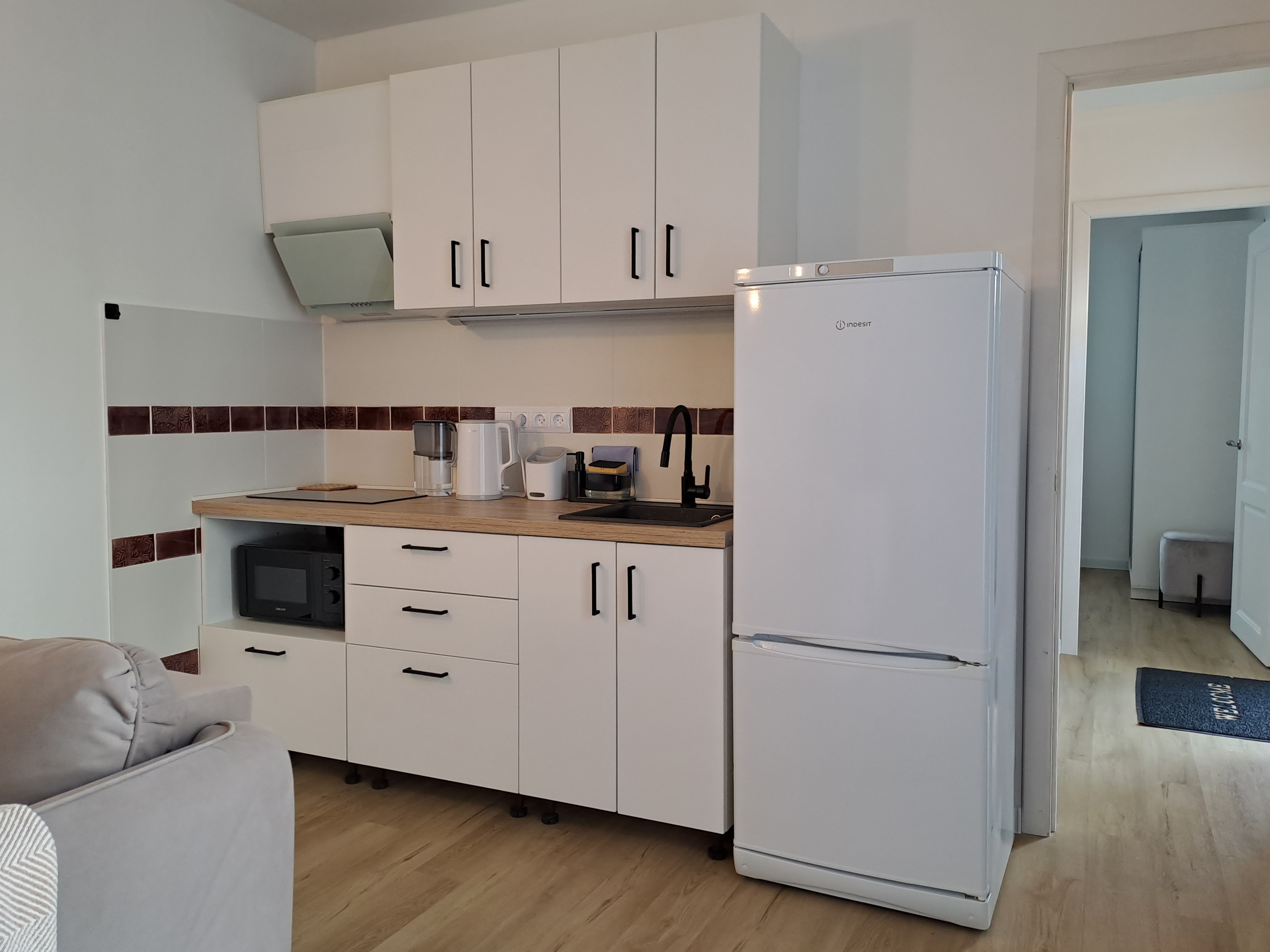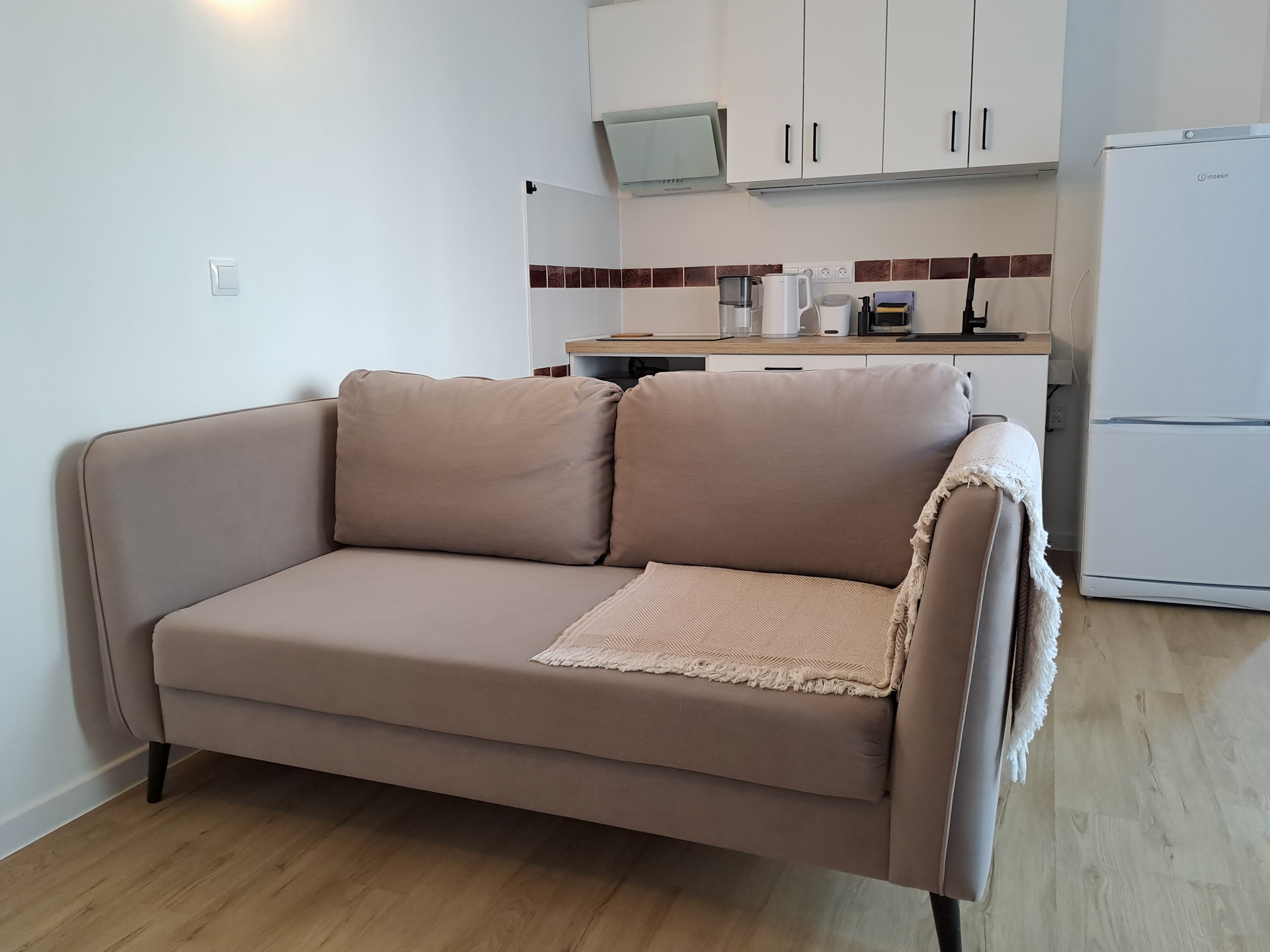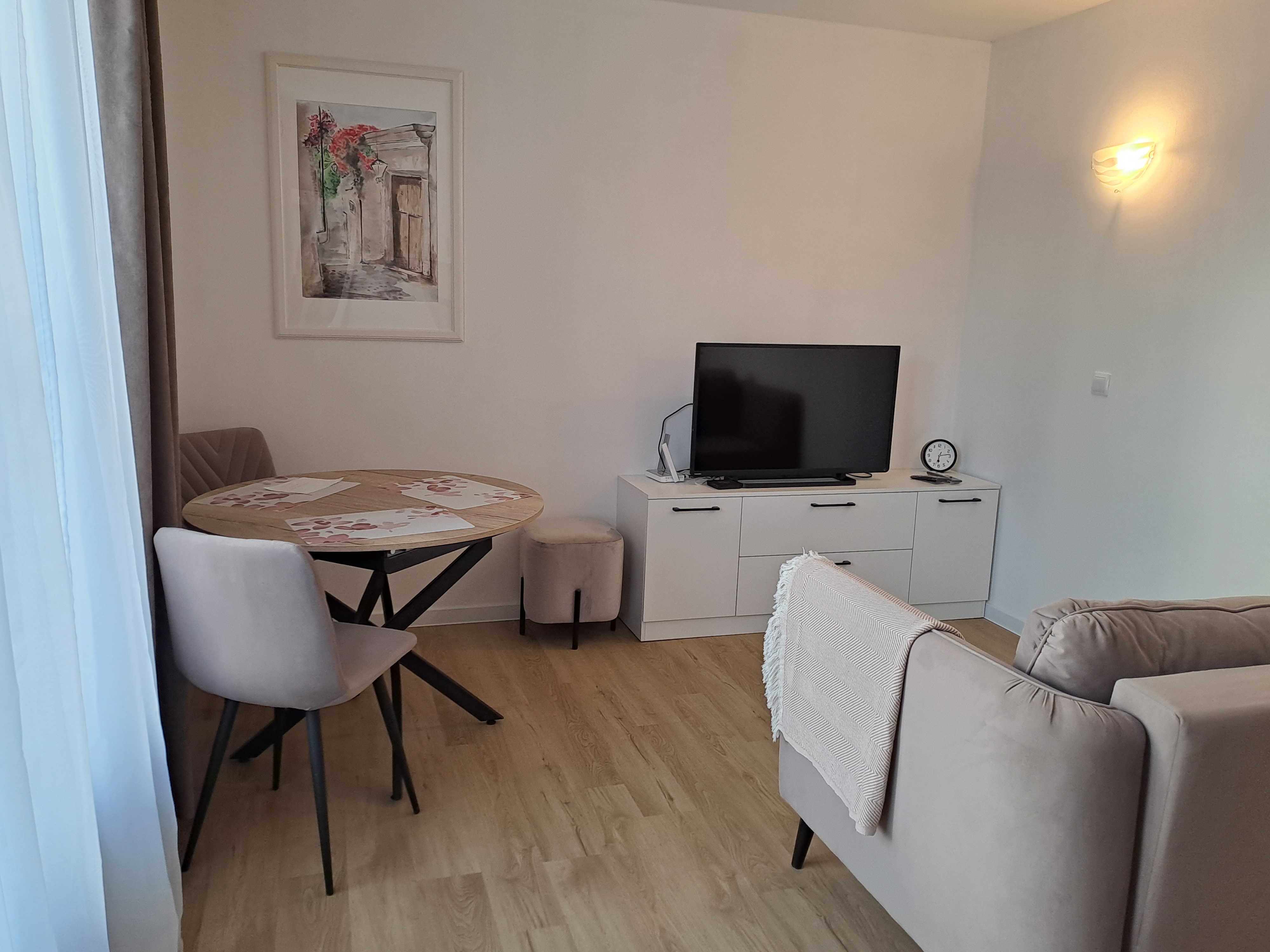 В спальне двухспальная кровать, либо две односпальные, спальные принадлежности, шкаф, прикроватная тумбочка, светильники. Есть утюг, гладильная доска, кондиционер. В комнате раскладной диван, стол, стулья, пуфики, комод, ТВ, WiFi, кухонный гарнитур, набор посуды для готовки и сервировки, СВЧ, холодильник, варочная панель, вытяжка, чайник. В санузле душ, туалет, раковина, стиральная машина, полотенцесушитель, фен, зеркало, набор санитарно- гигиенических принадлежностей. В саду есть патио. В 790 метрах находится оборудованный галечный пляж.