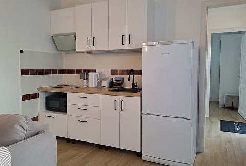 В номере: вешалка, зеркало, кровати односпальные /одна двуспальная кровать, стол, стулья, шкаф, кондиционер, набор посуды, плита электрическая, стиральная машина, телевизор, утюг, холодильник, чайник
