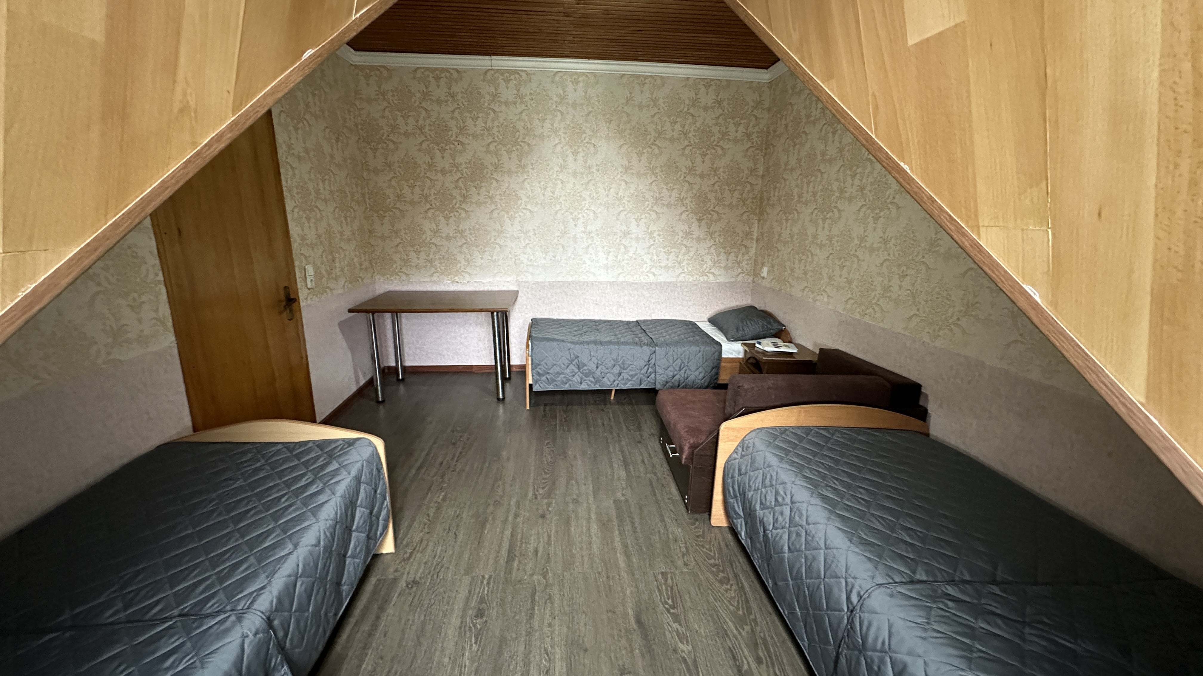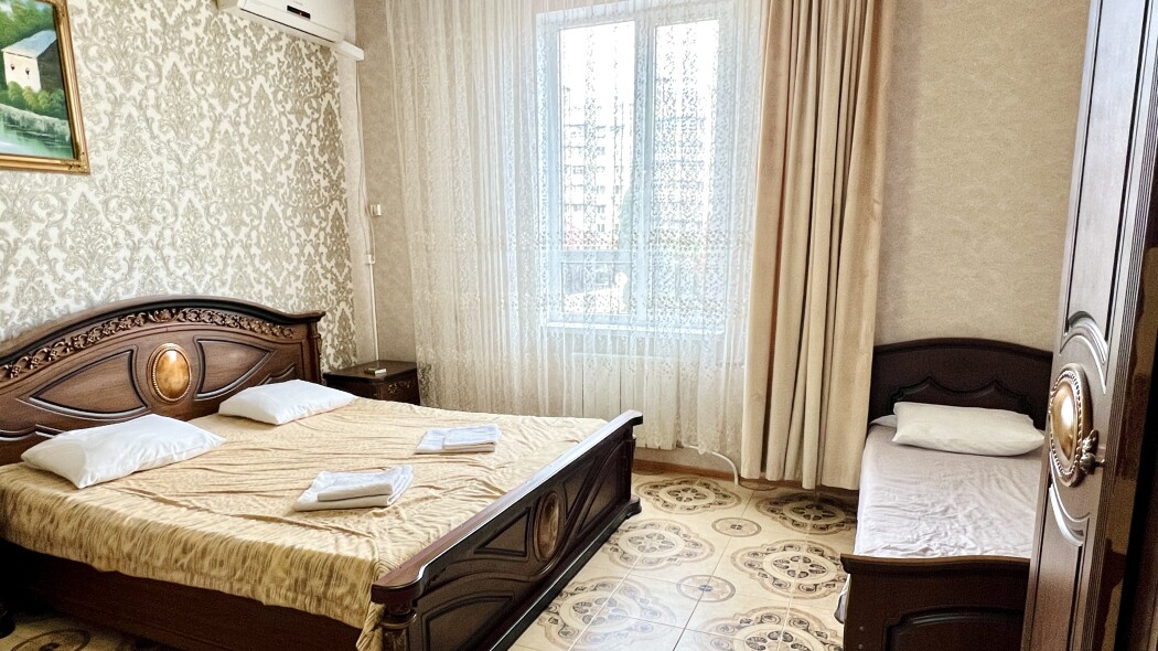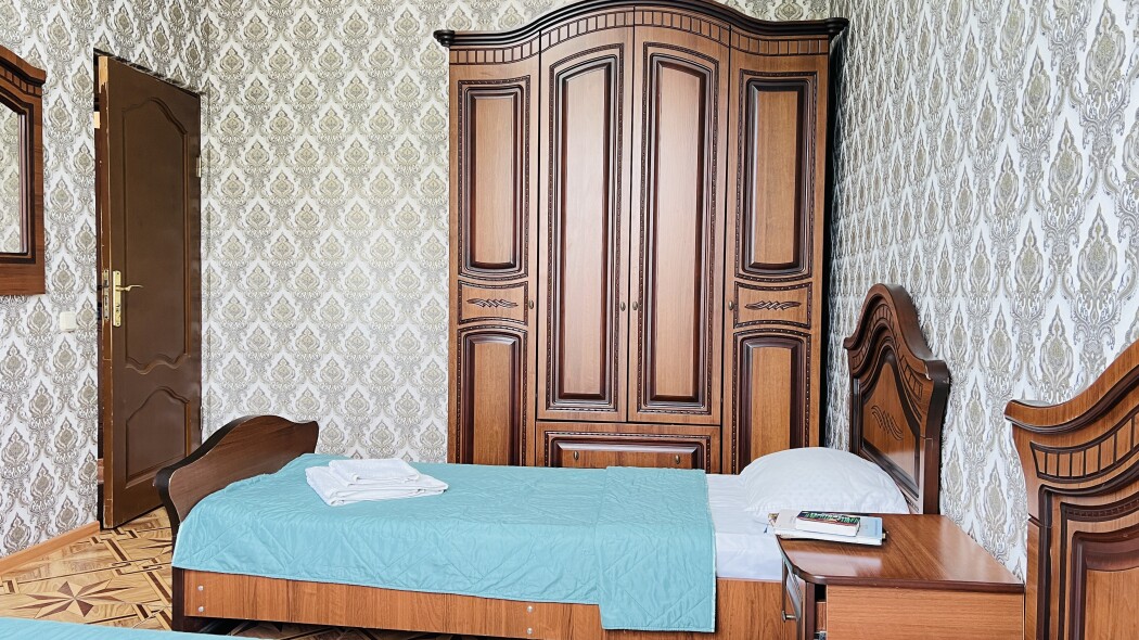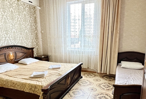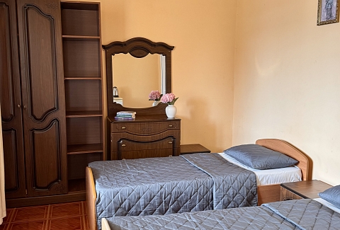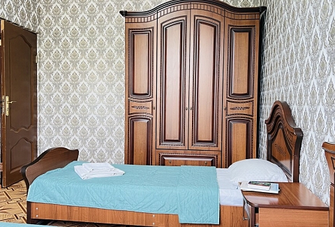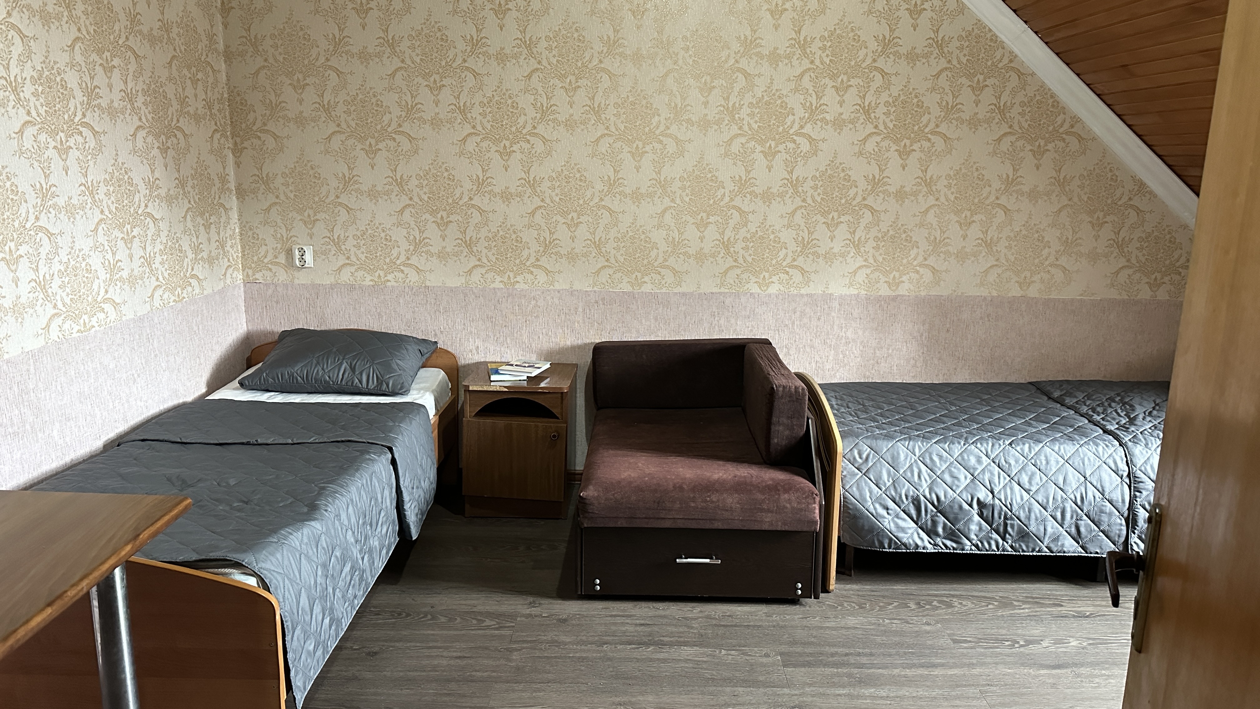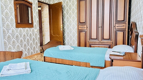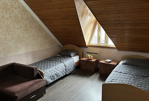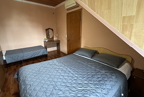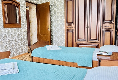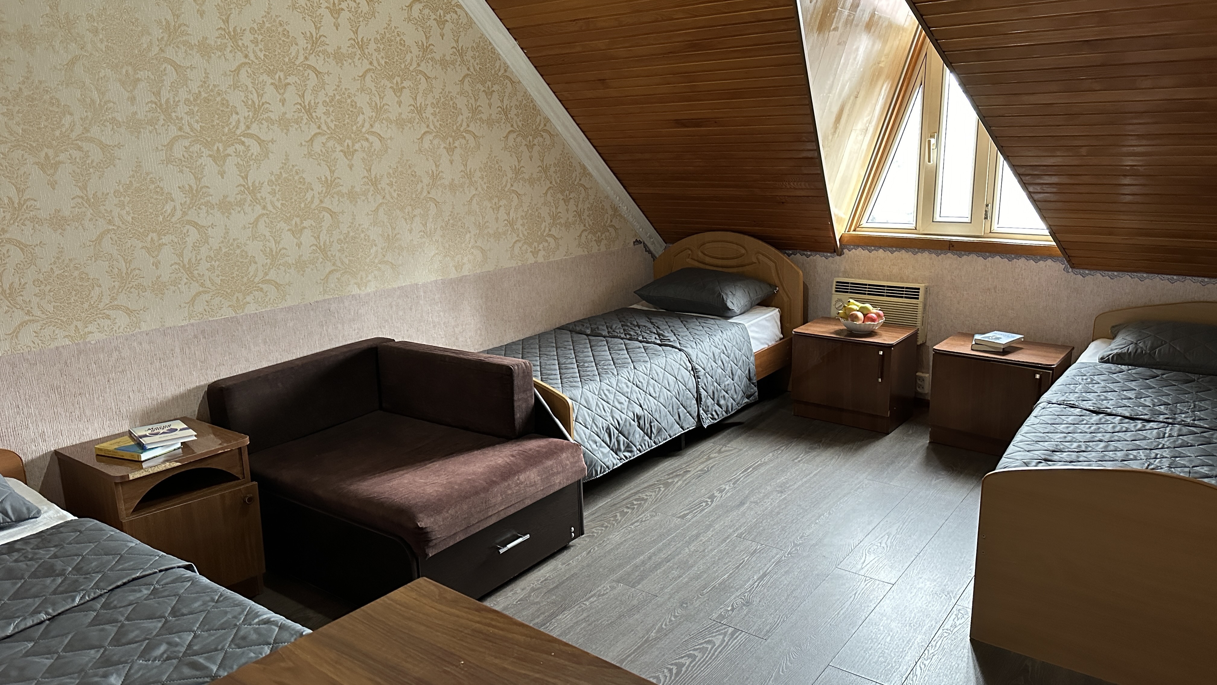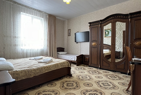 В номере: кровать двуспальная, кровать односпальная, прикроватная тумбочка, стол, стулья, шкаф, мини-холодильник, сейф, сплит-система, телевизор, чайный набор посуды, электрочайник