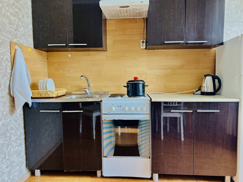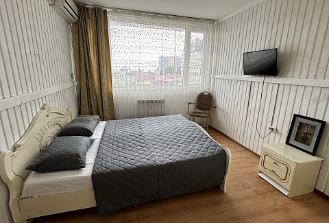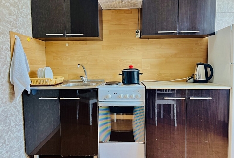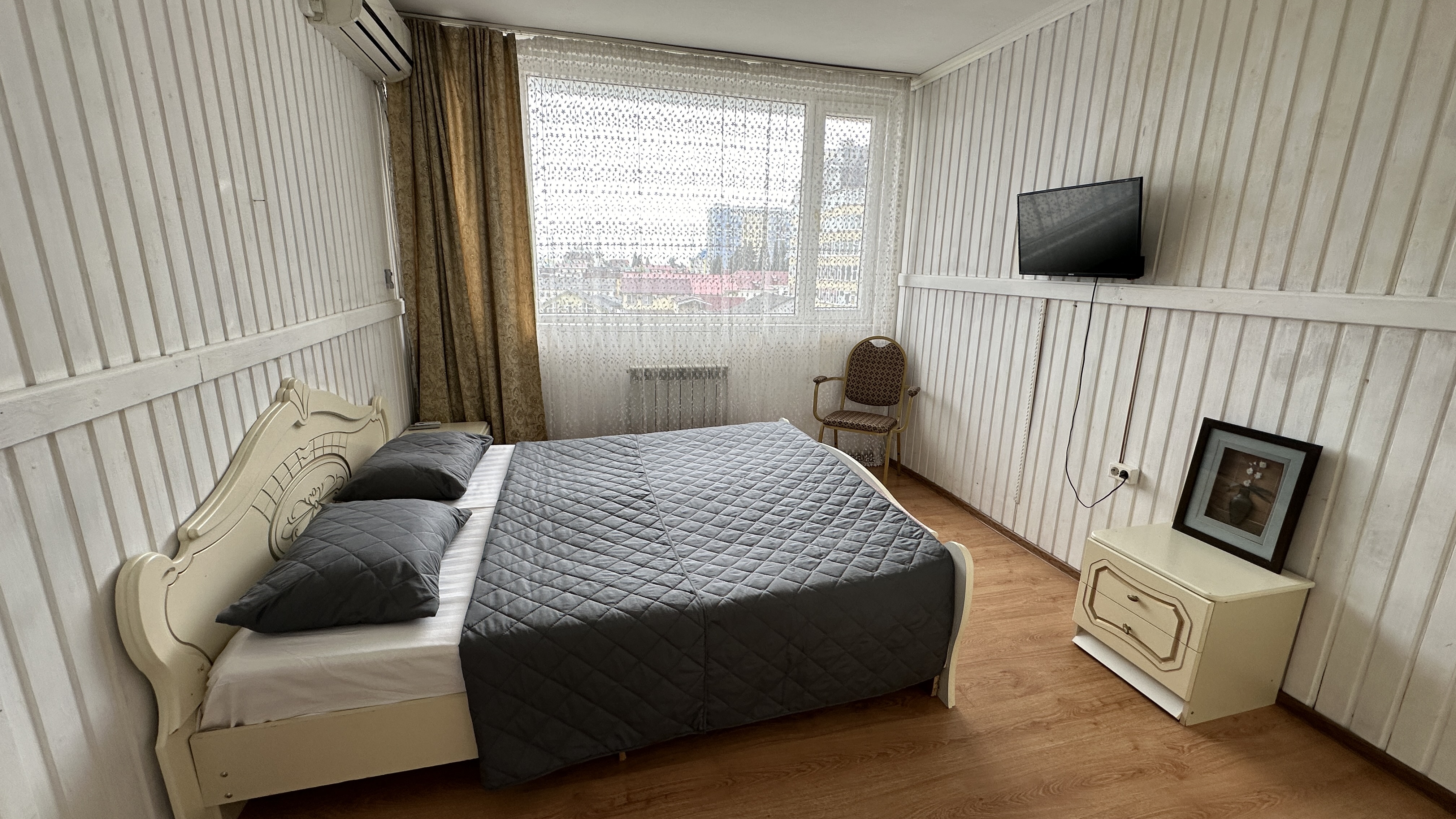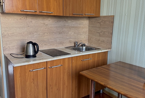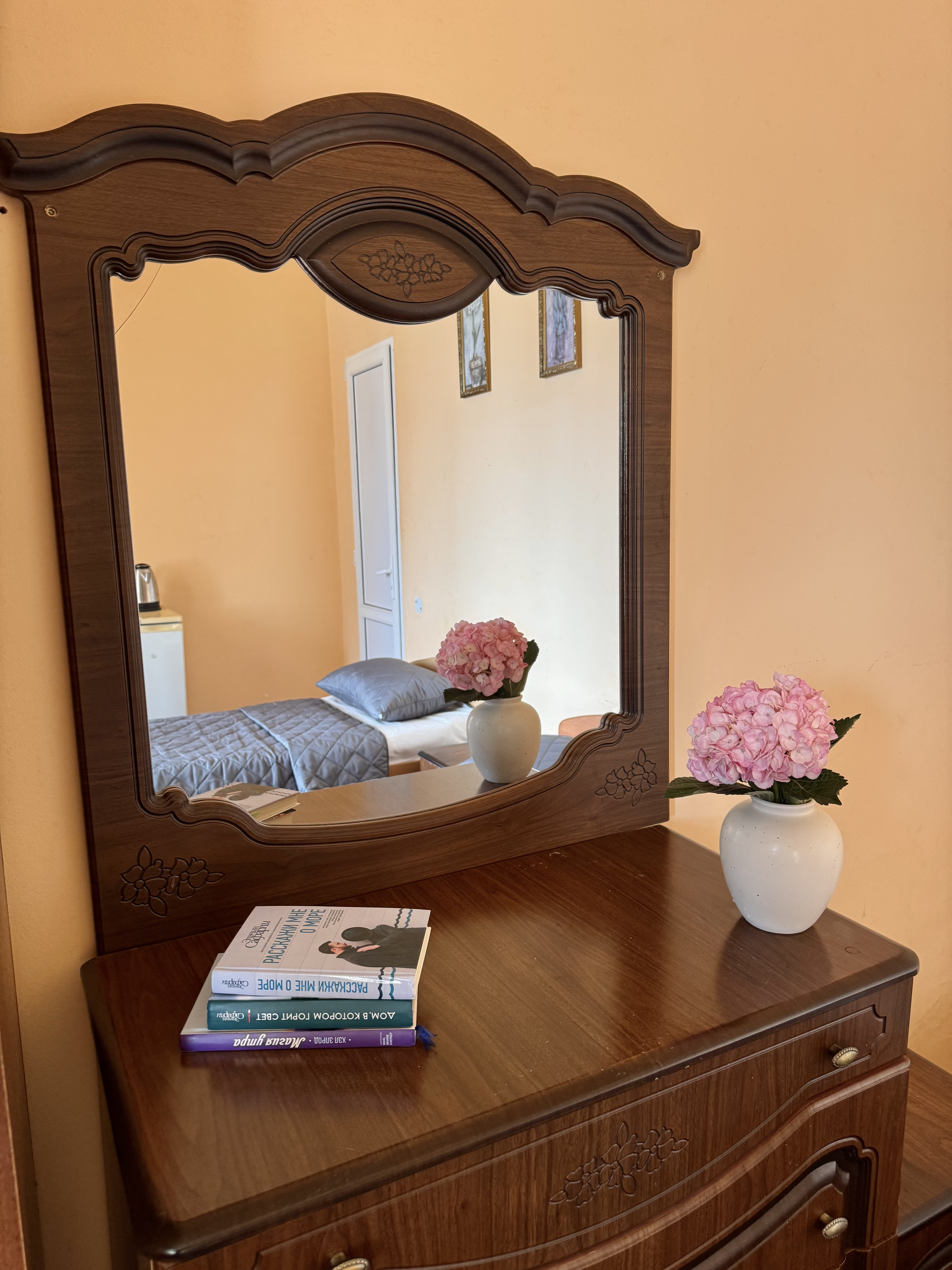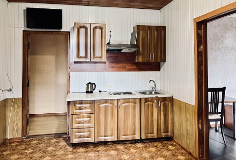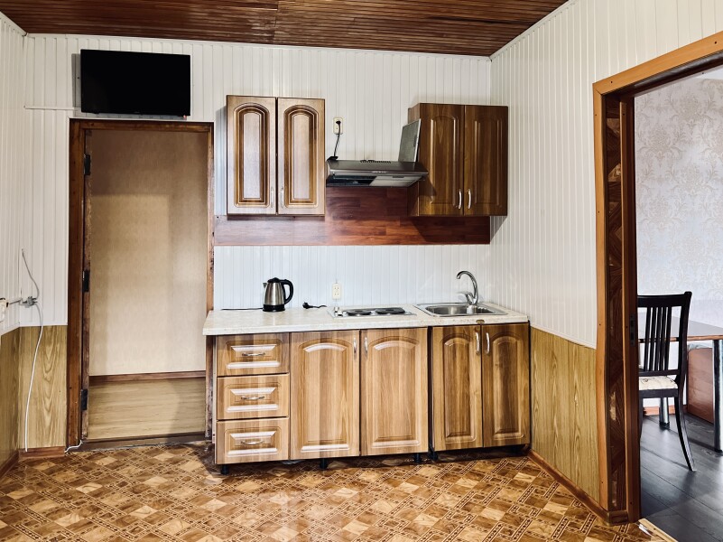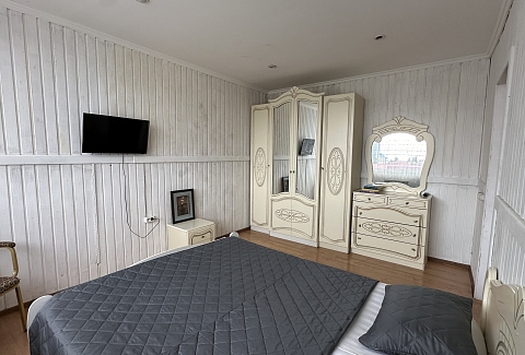 В номере: зеркало, кровать двуспальная, кровать односпальная, прикроватные тумбочки, стол, стулья, шкаф, мини-холодильник, плита электрическая, сейф, сплит-система, стиральная машина, телевизор, чайный набор посуды, электрочайник