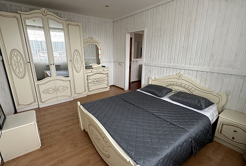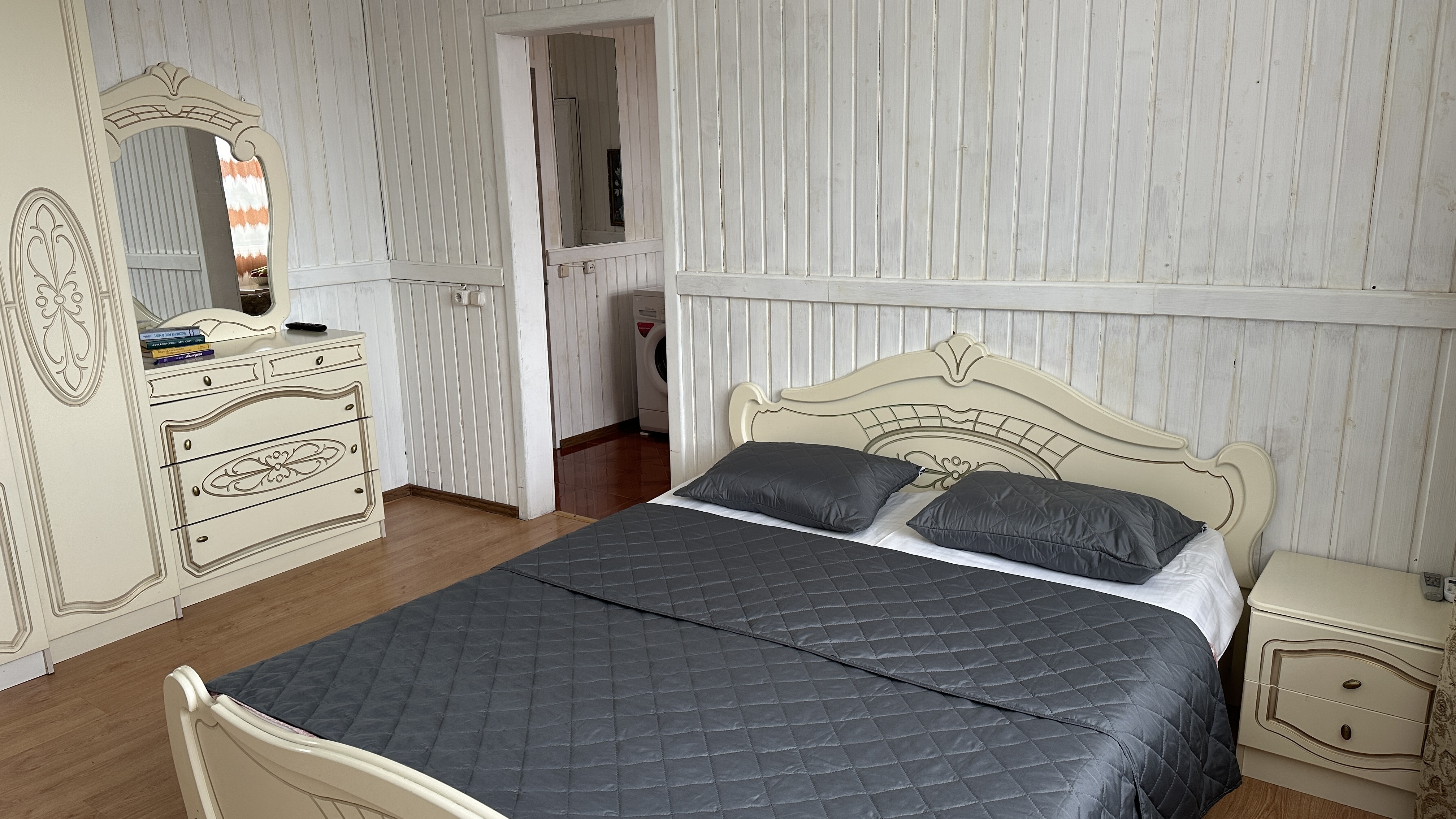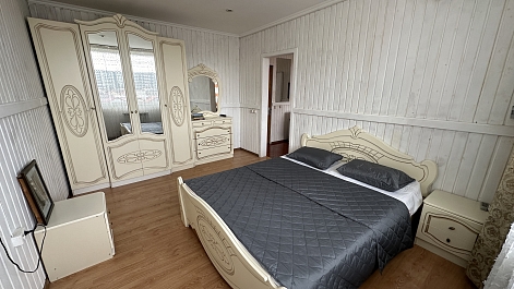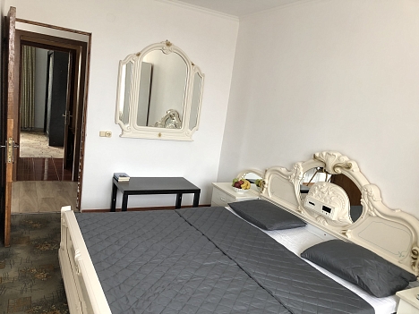 В номере: диван, зеркало, кресло-кровать, кровати односпальные, кровать двуспальная, прикроватные тумбочки, стол, стулья, шкаф, плита электрическая, сейф, сплит-система, стиральная машина, телевизор, холодильник, чайный набор посуды, электрочайник