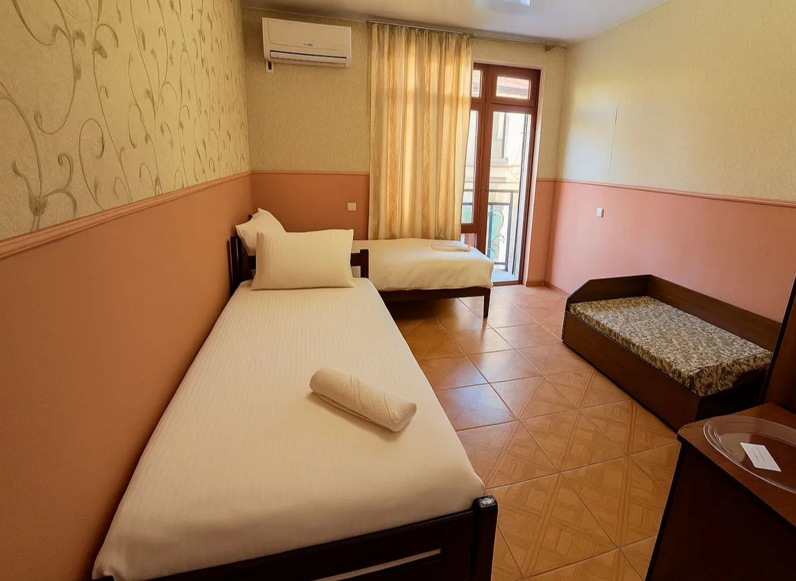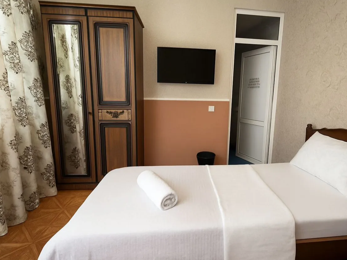 В номере: вешалка, зеркало, кресло-кровать, кровати односпальные /одна двуспальная кровать, прикроватные тумбочки, стол, стулья, шкаф, сплит-система, телевизор