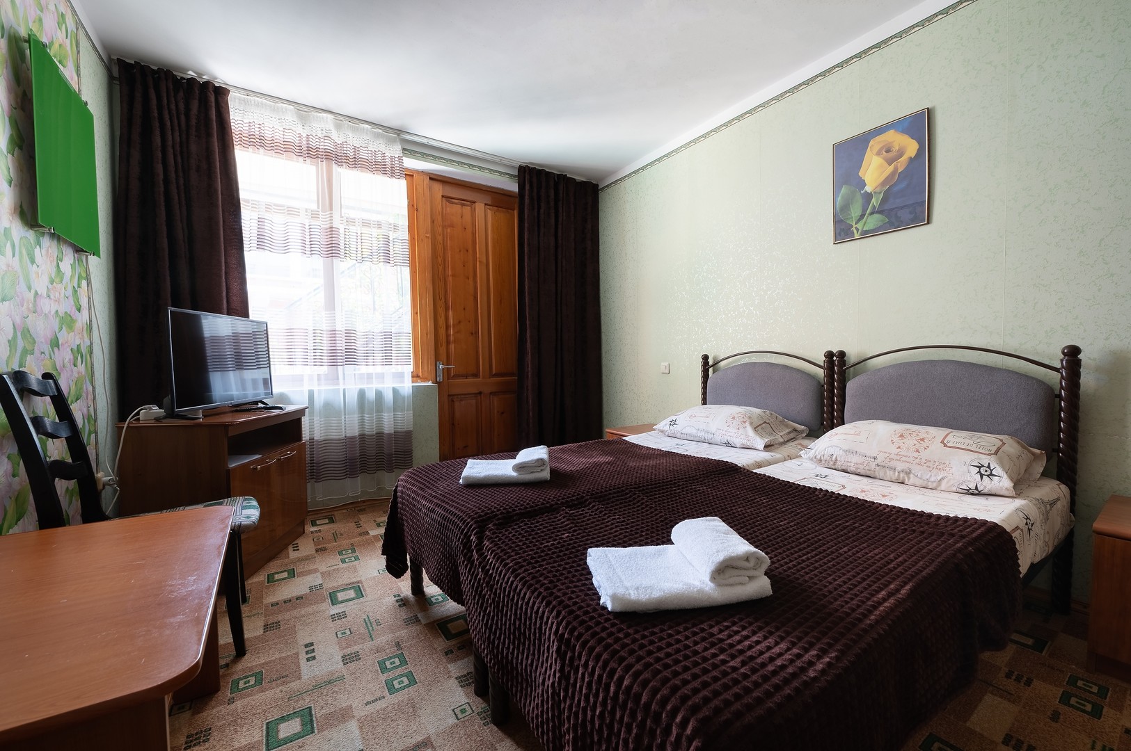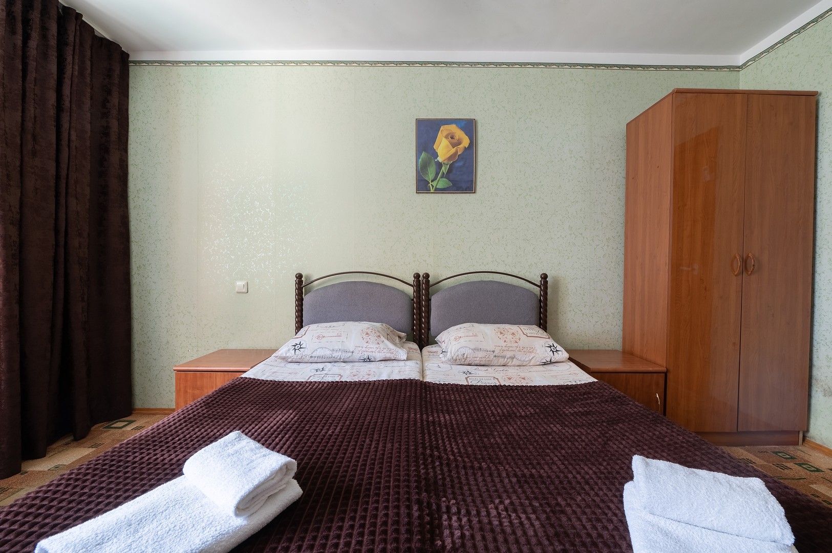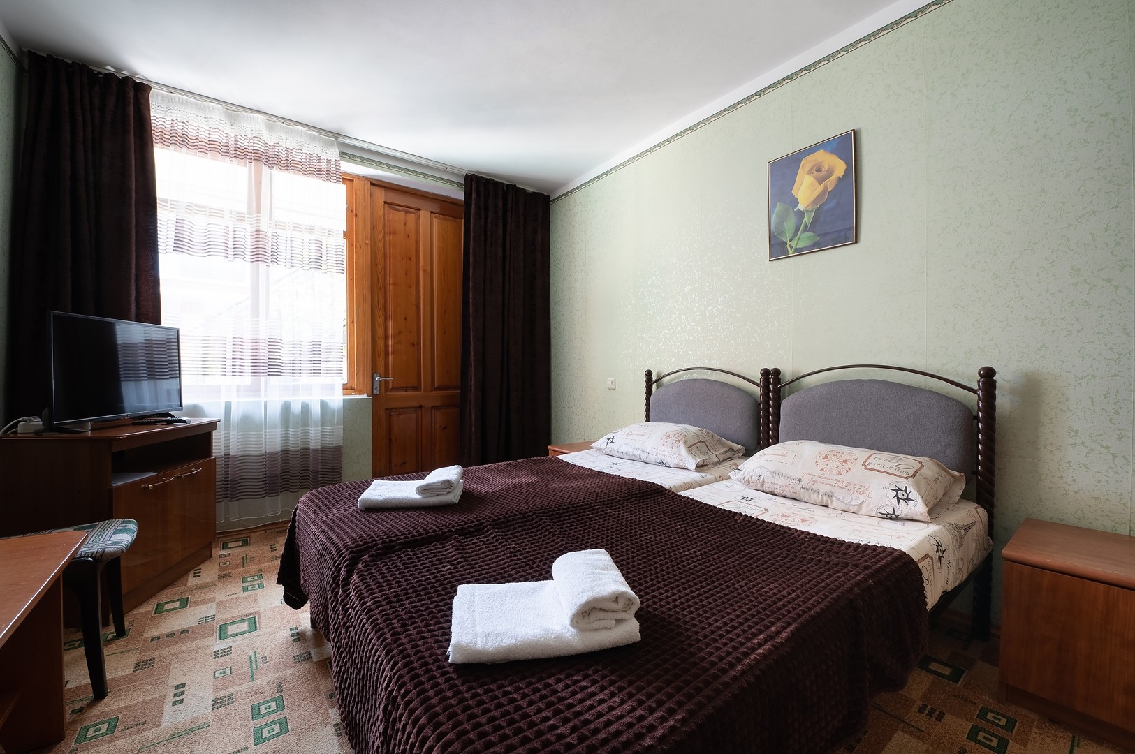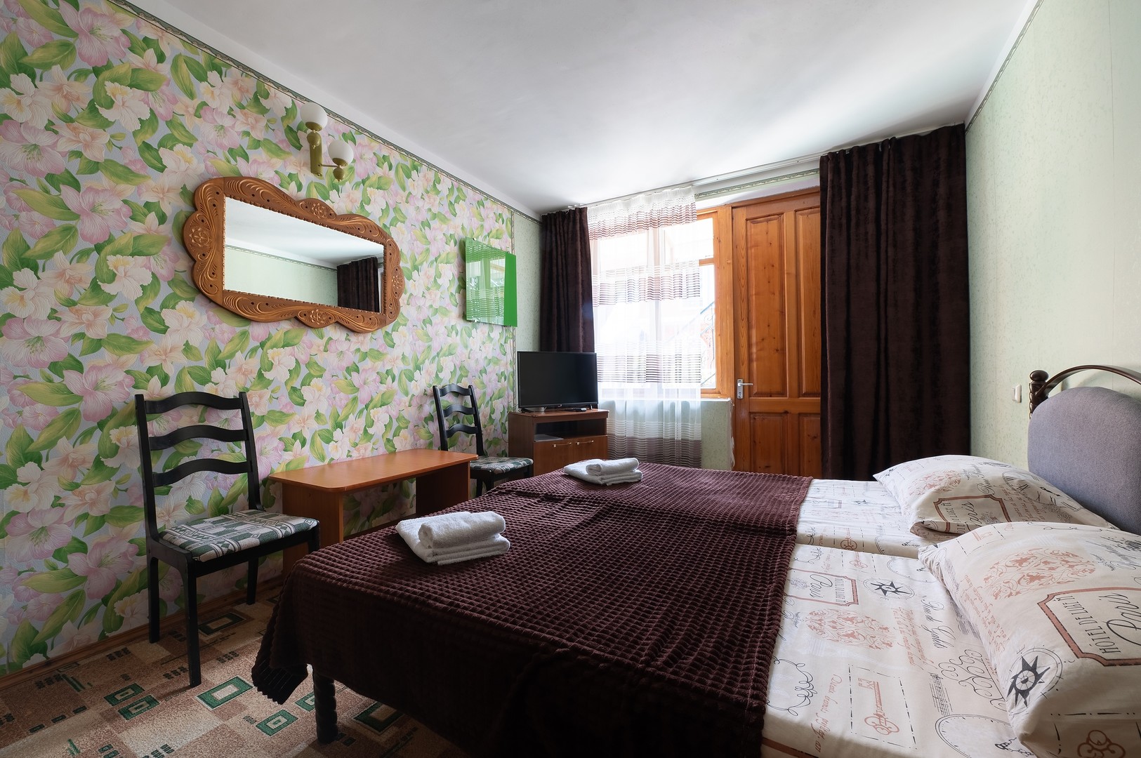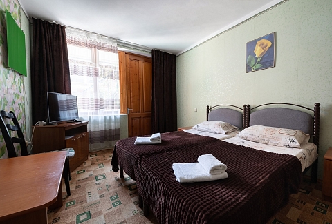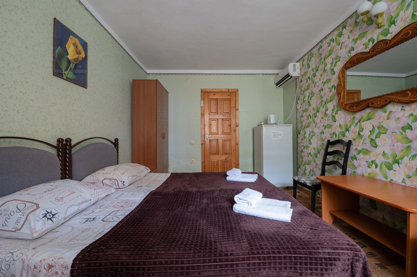В номере: вешалка, зеркало, кровати односпальные /одна двуспальная кровать, тумба, шкаф, кондиционер, телевизор, холодильник, электрочайник