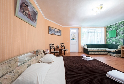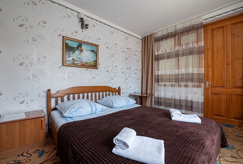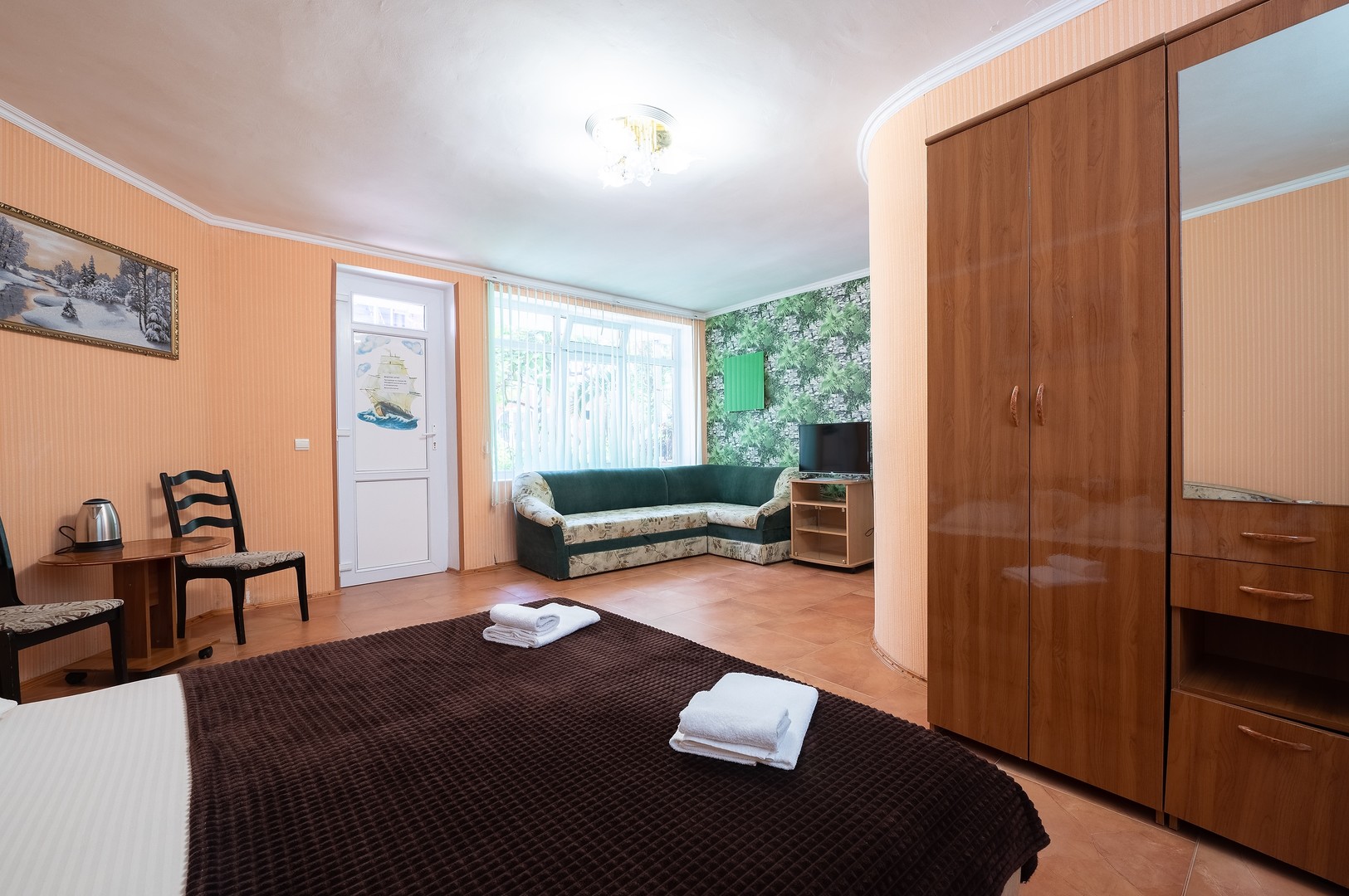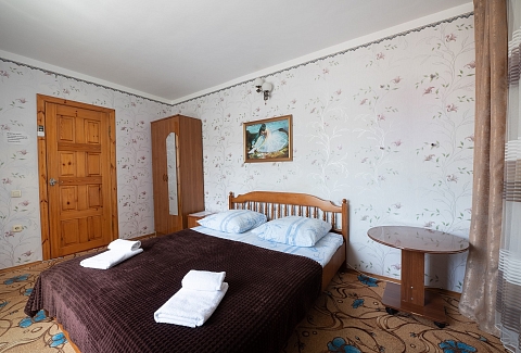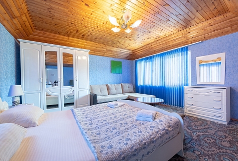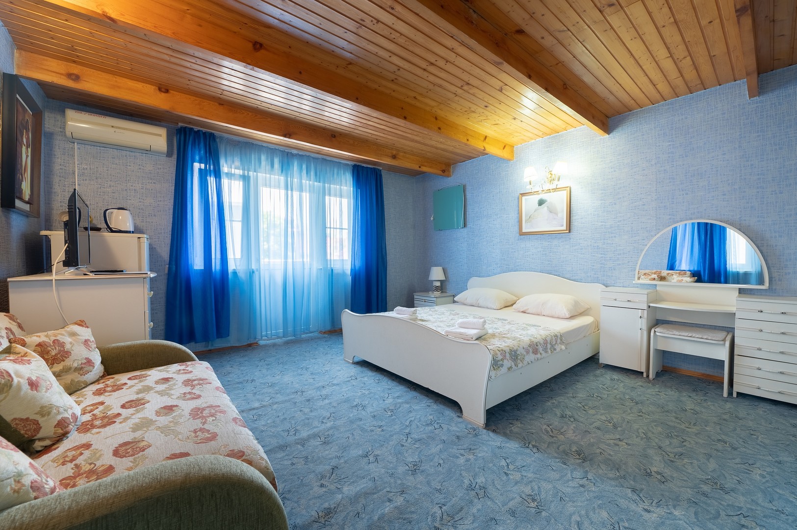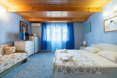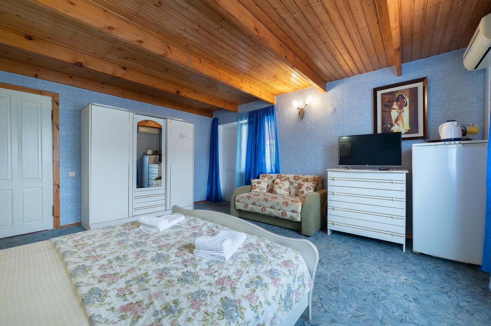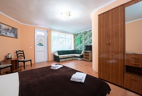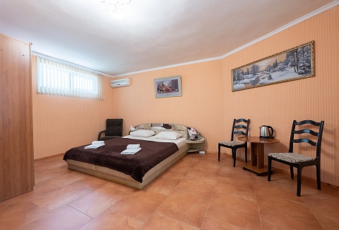 В номере: вешалка, диван раскладной, зеркало, кровать двуспальная, стол, столик журнальный, тумба, шкаф, кондиционер, телевизор, холодильник, электрочайник