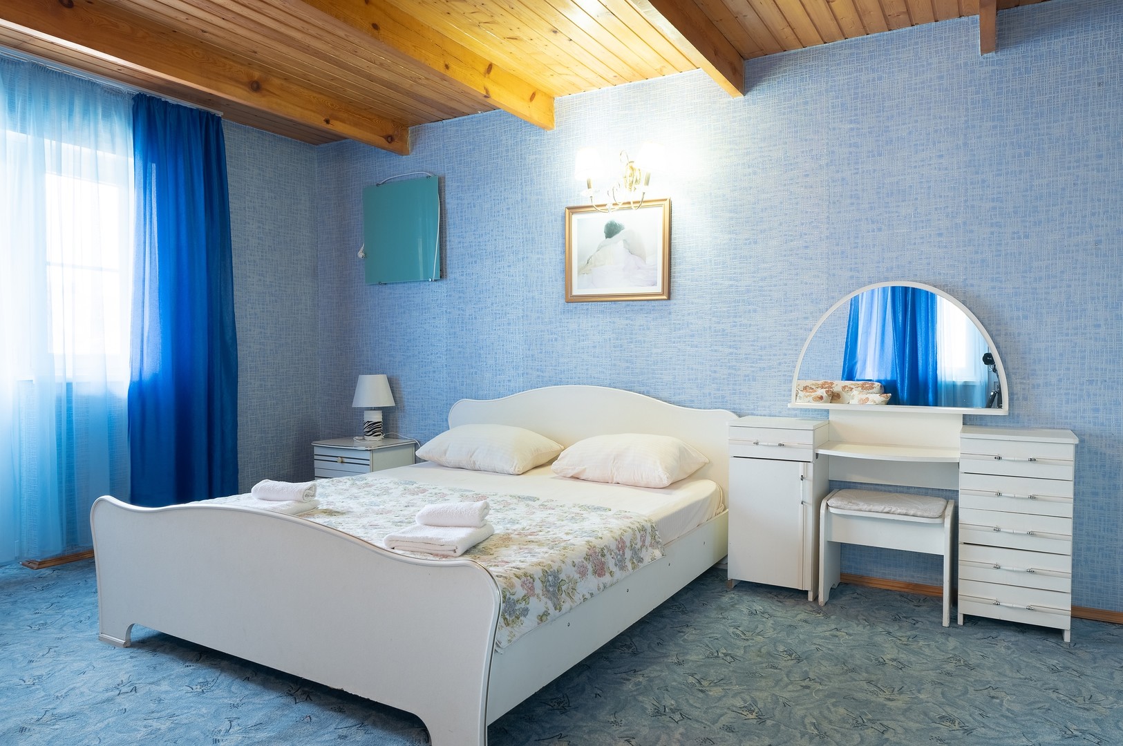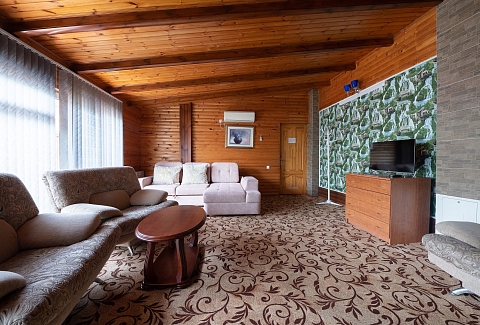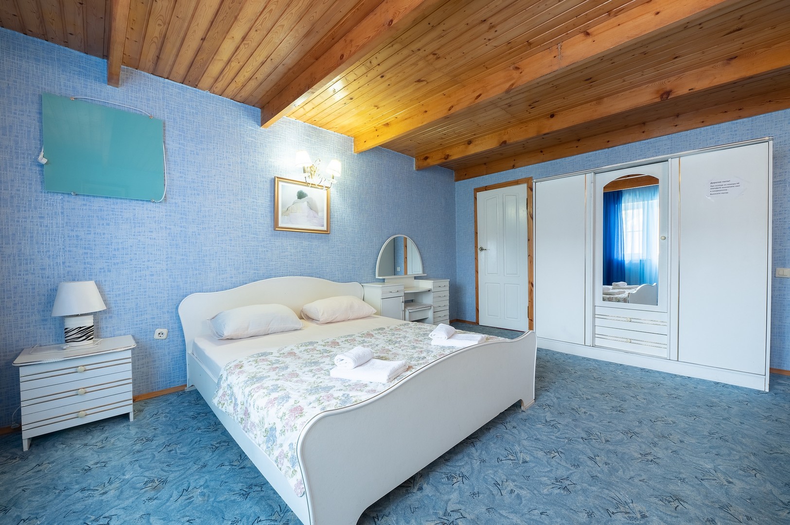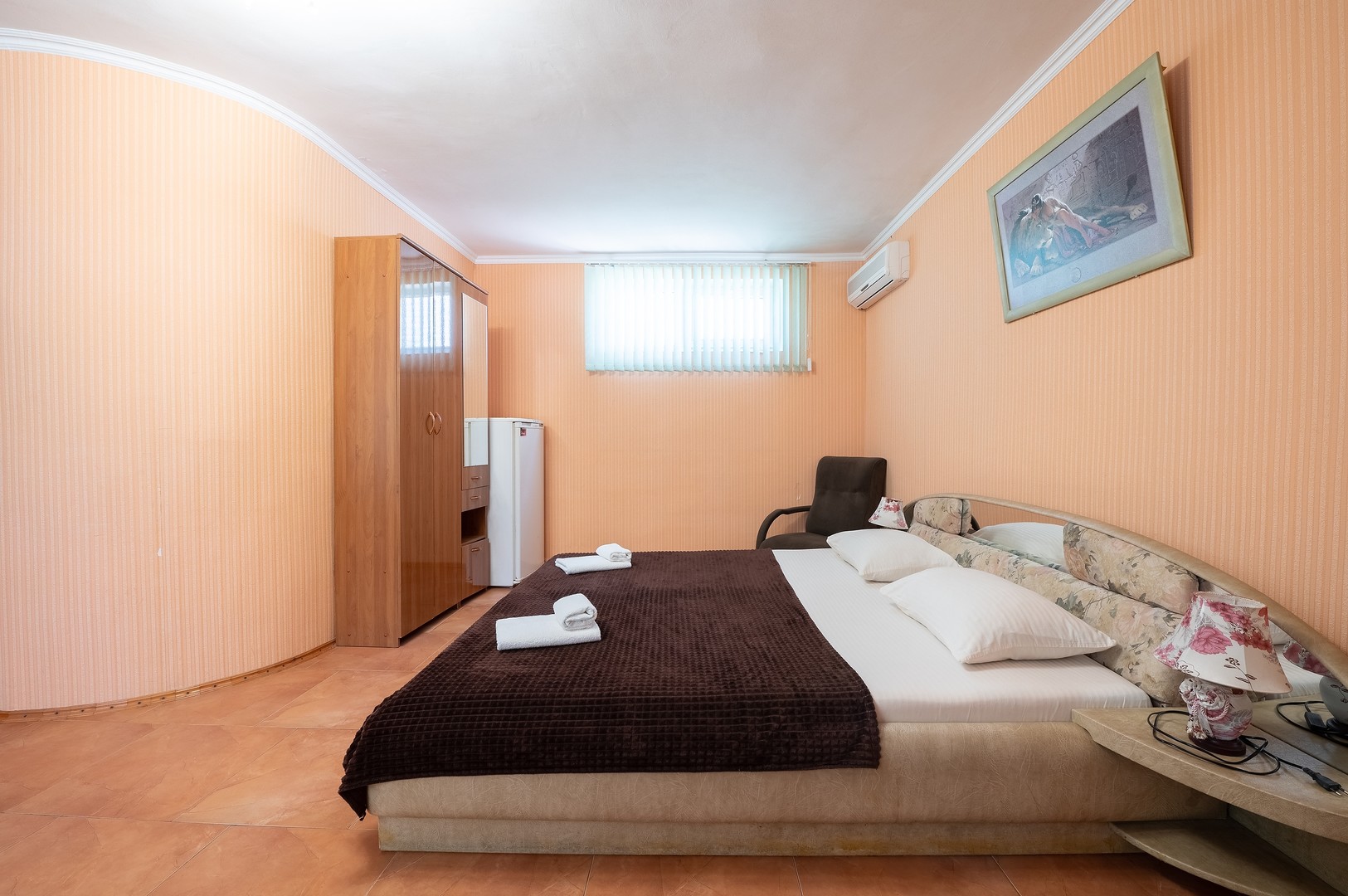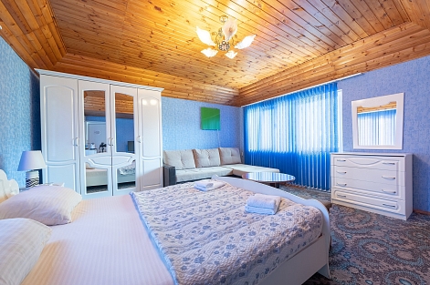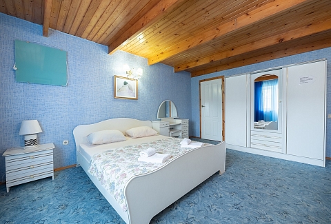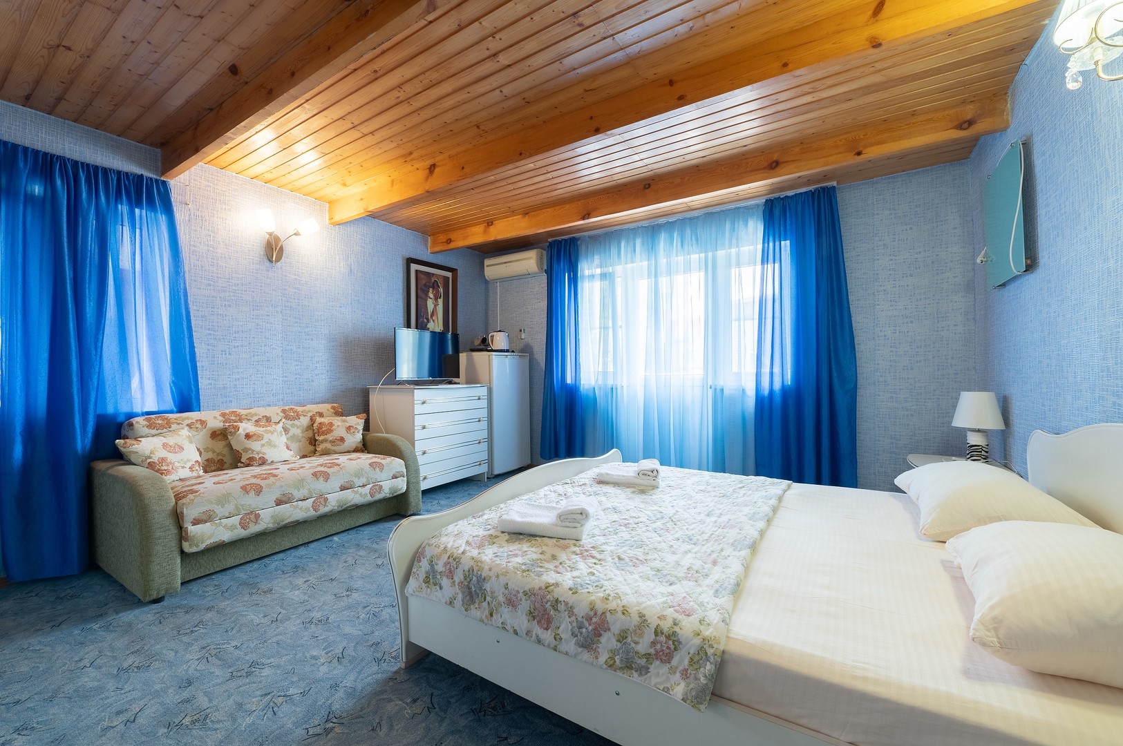 В номере: вешалка, диван раскладной, зеркало, кровать двуспальная, стол, столик журнальный, тумба, шкаф, кондиционер, телевизор, холодильник, электрочайник