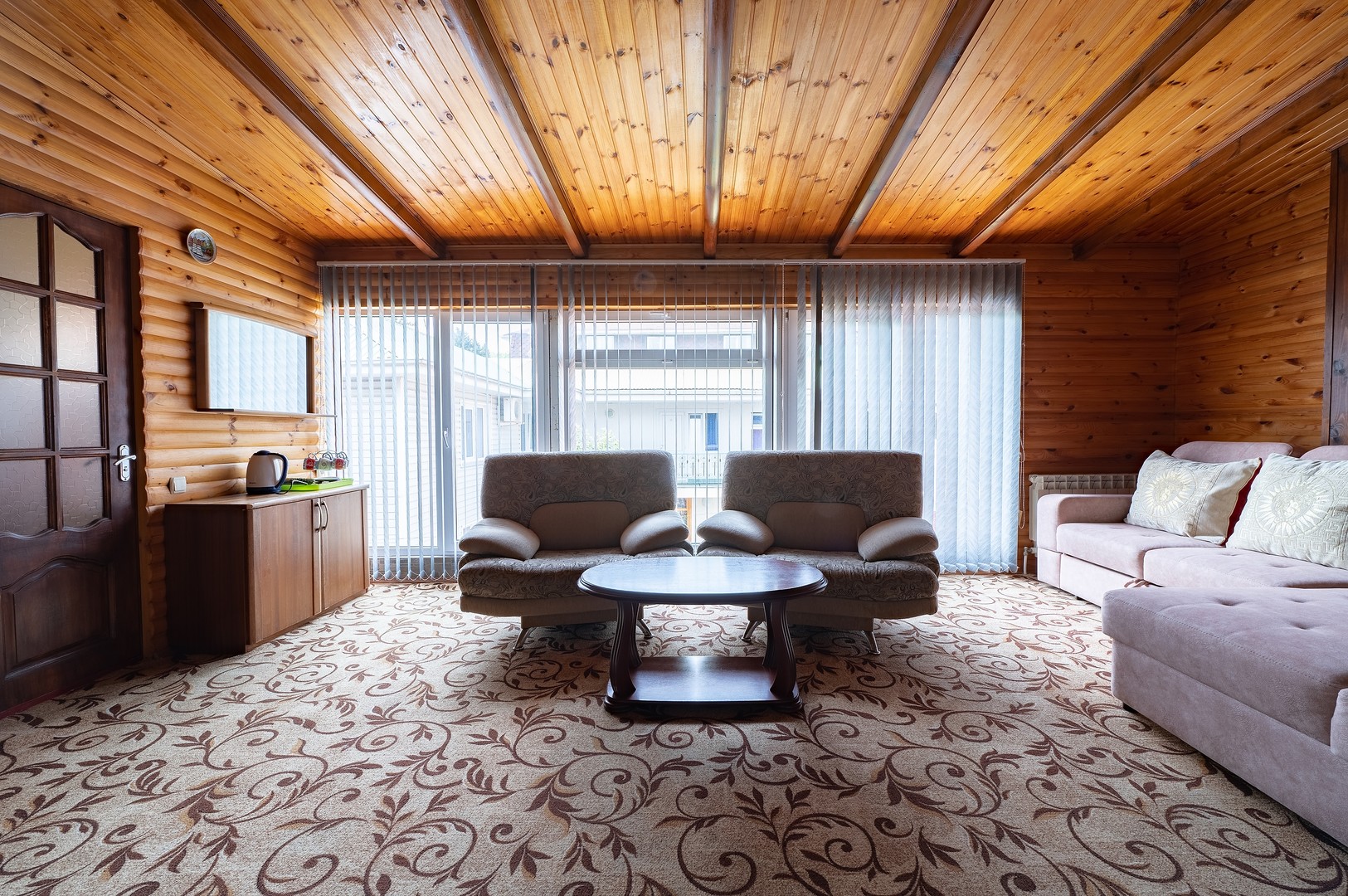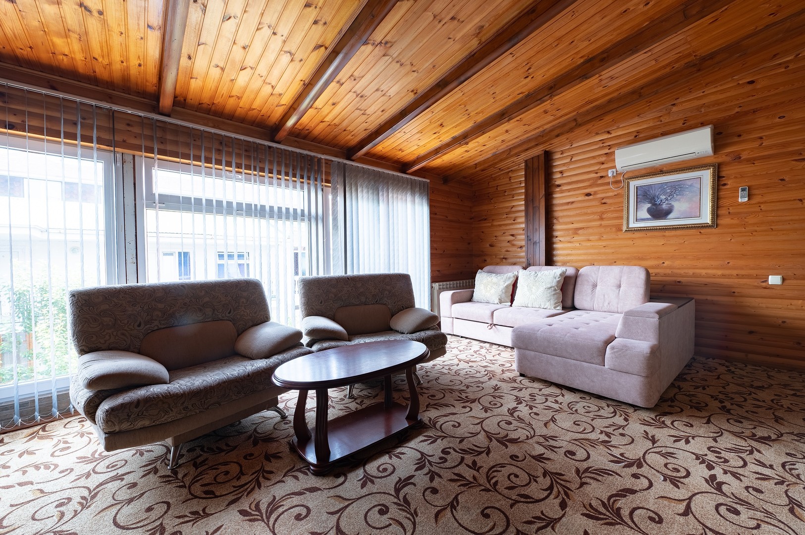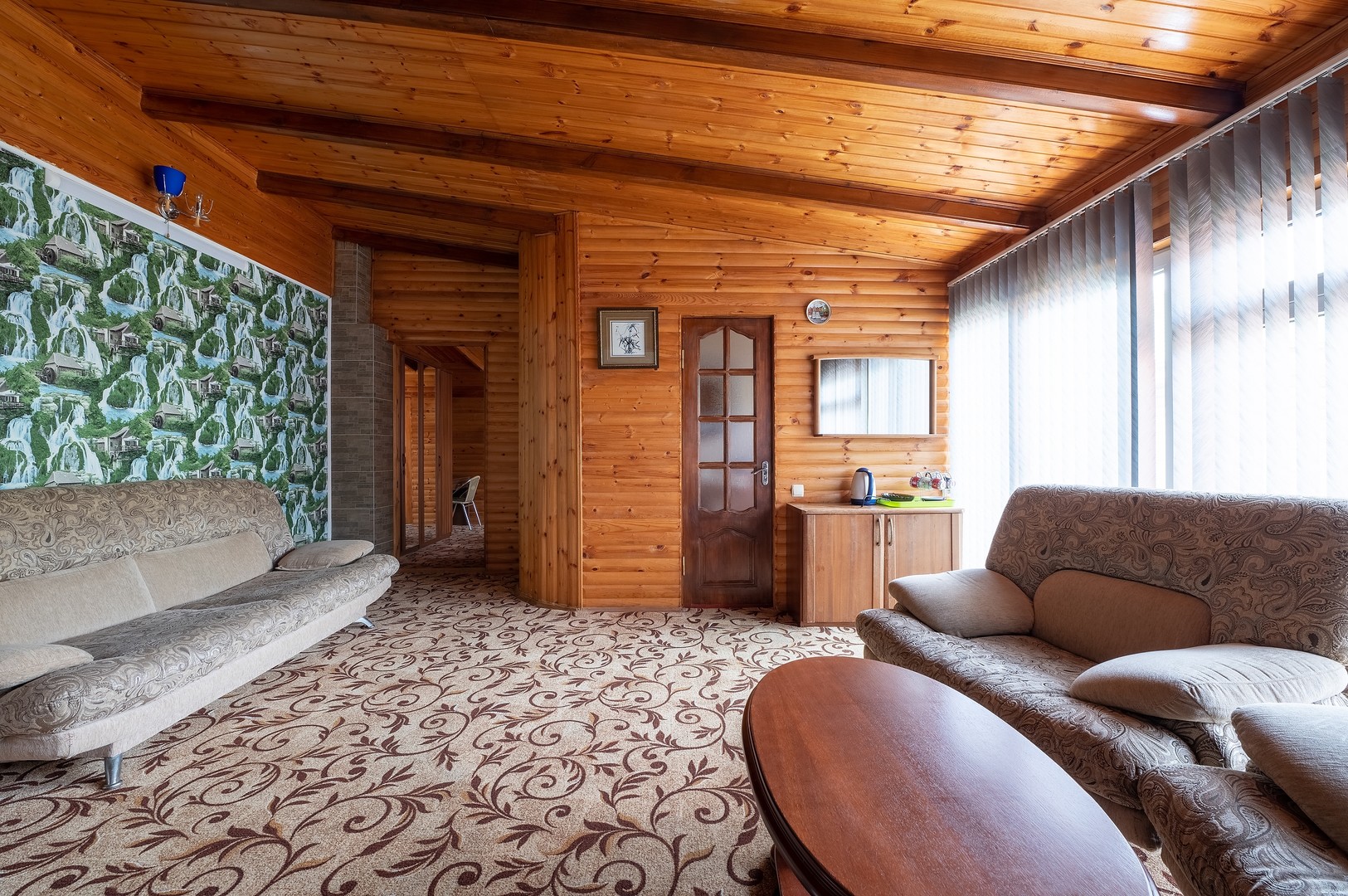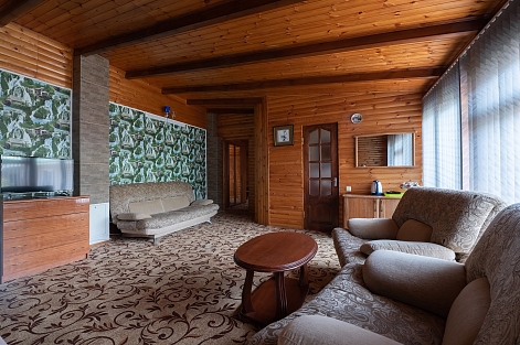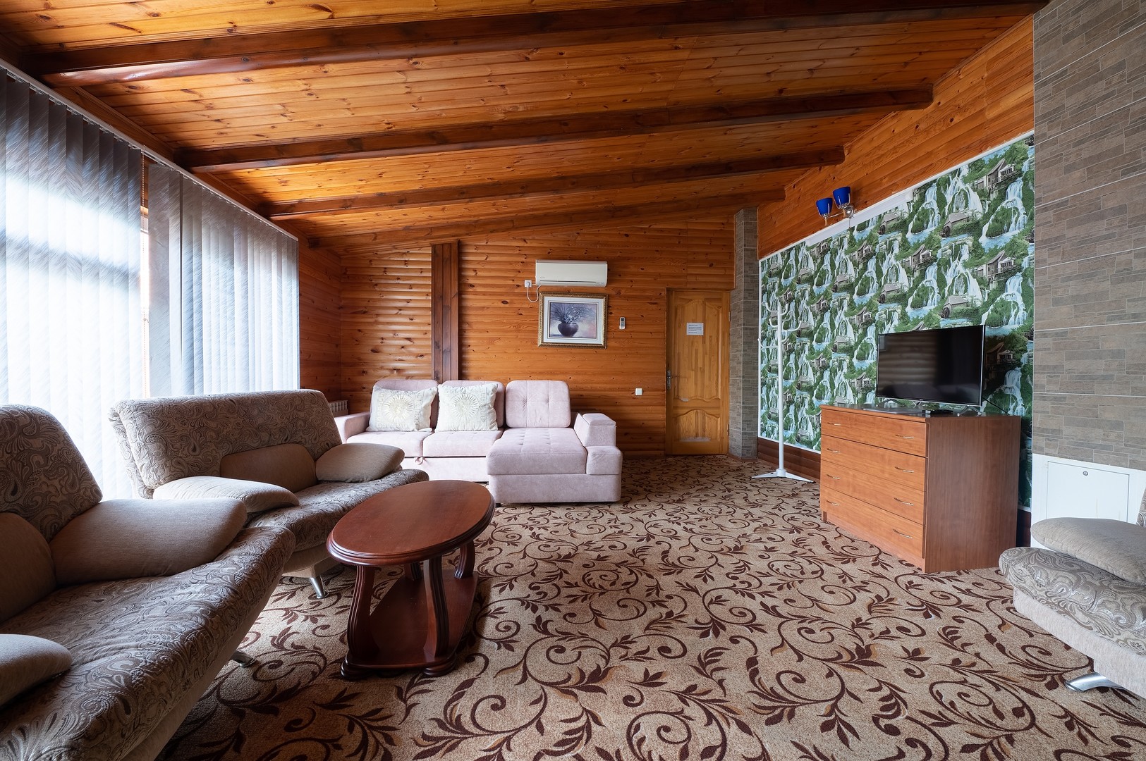 В номере: вешалка, диван раскладной, зеркало, кровать двуспальная, стол, столик журнальный, тумба, шкаф, кондиционер, телевизор, холодильник, электрочайник