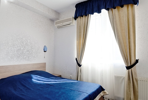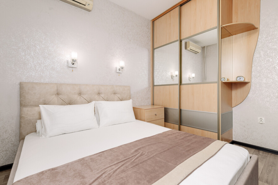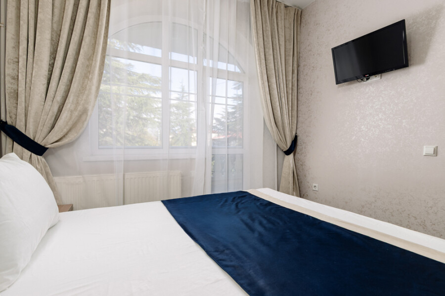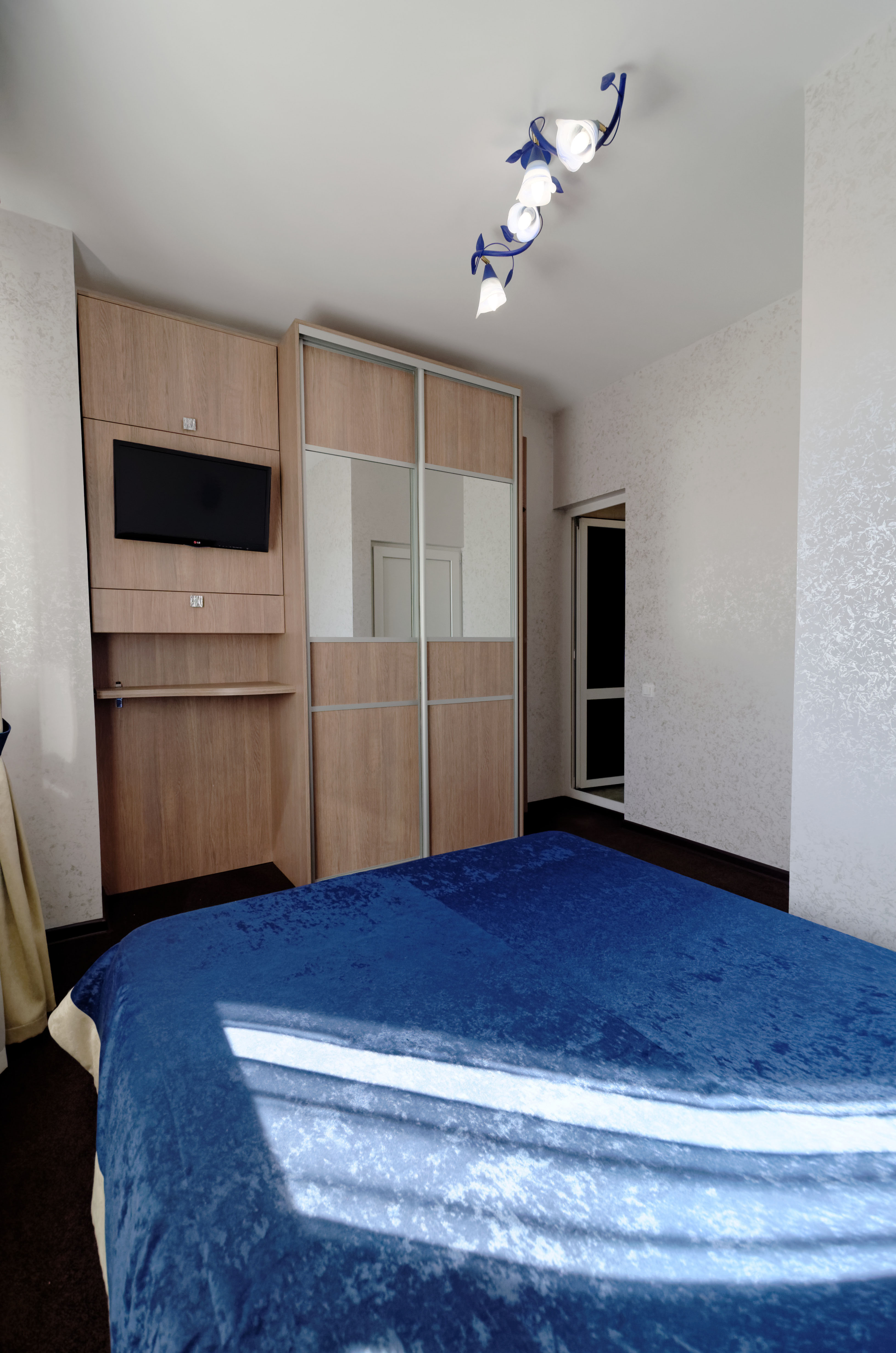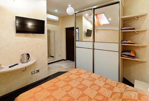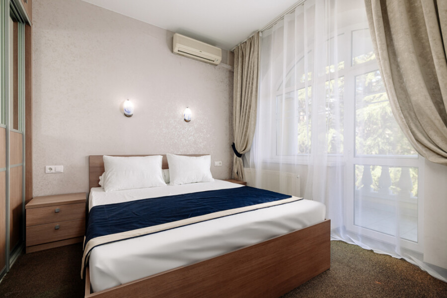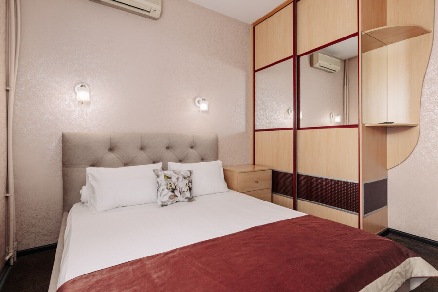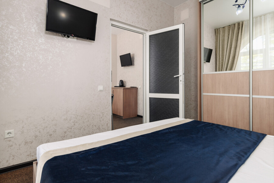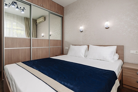 В номере: диван раскладной, зеркало, кровать двуспальная, прикроватные тумбочки, стол, стулья, шкаф, кондиционер, телевизор ЖК, холодильник, чайный набор посуды, электрочайник