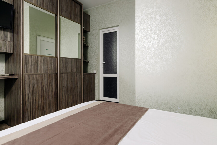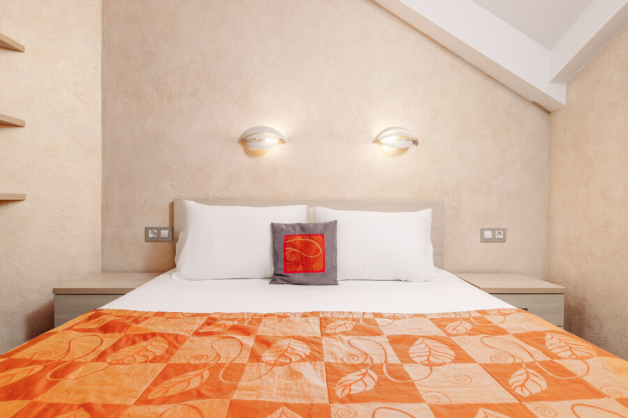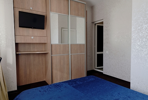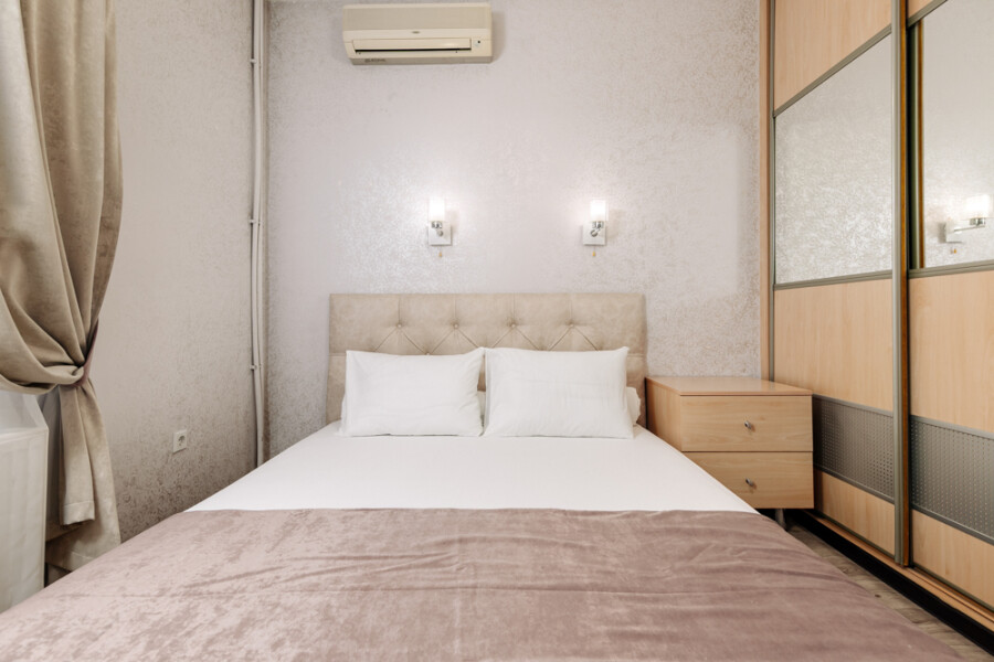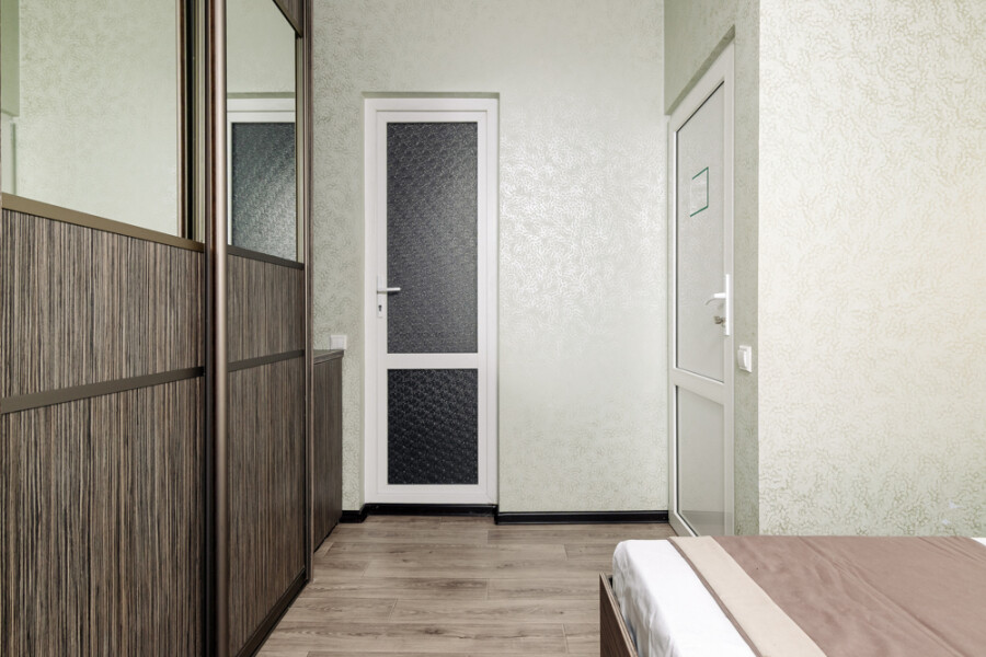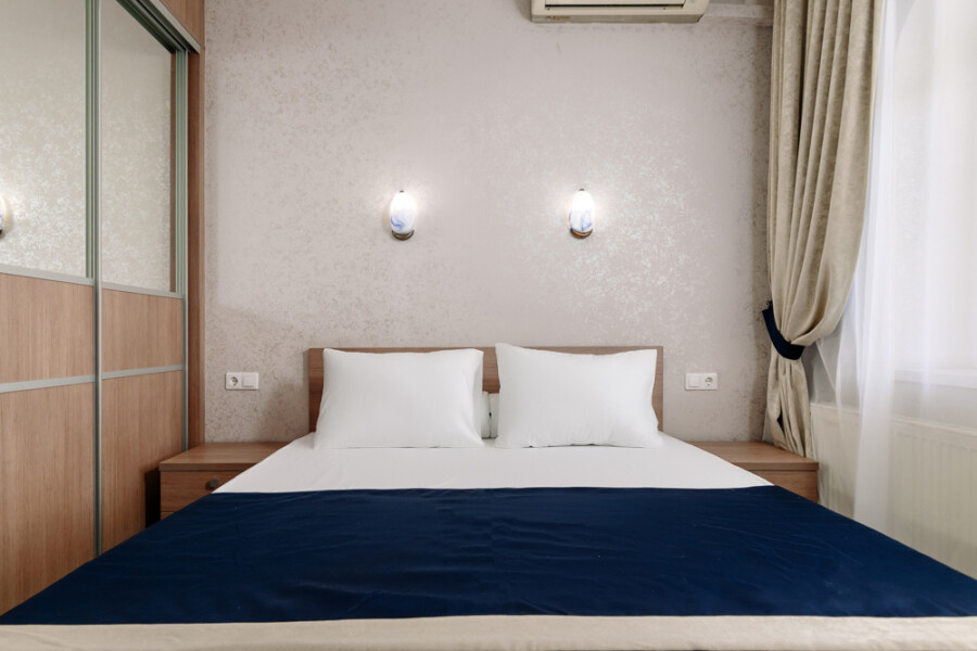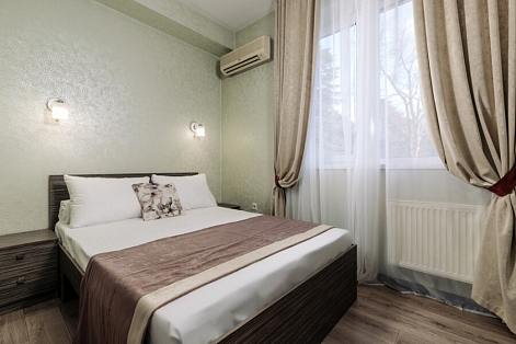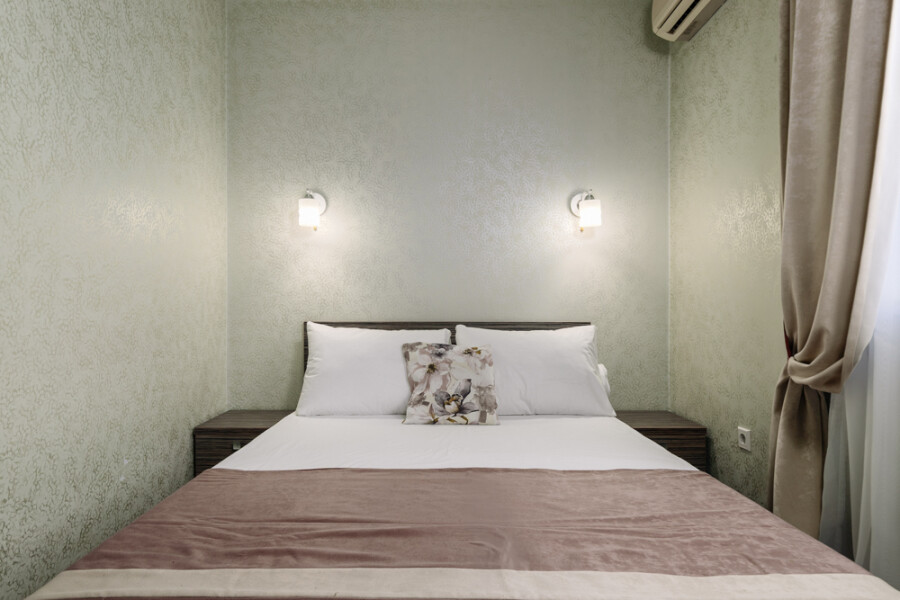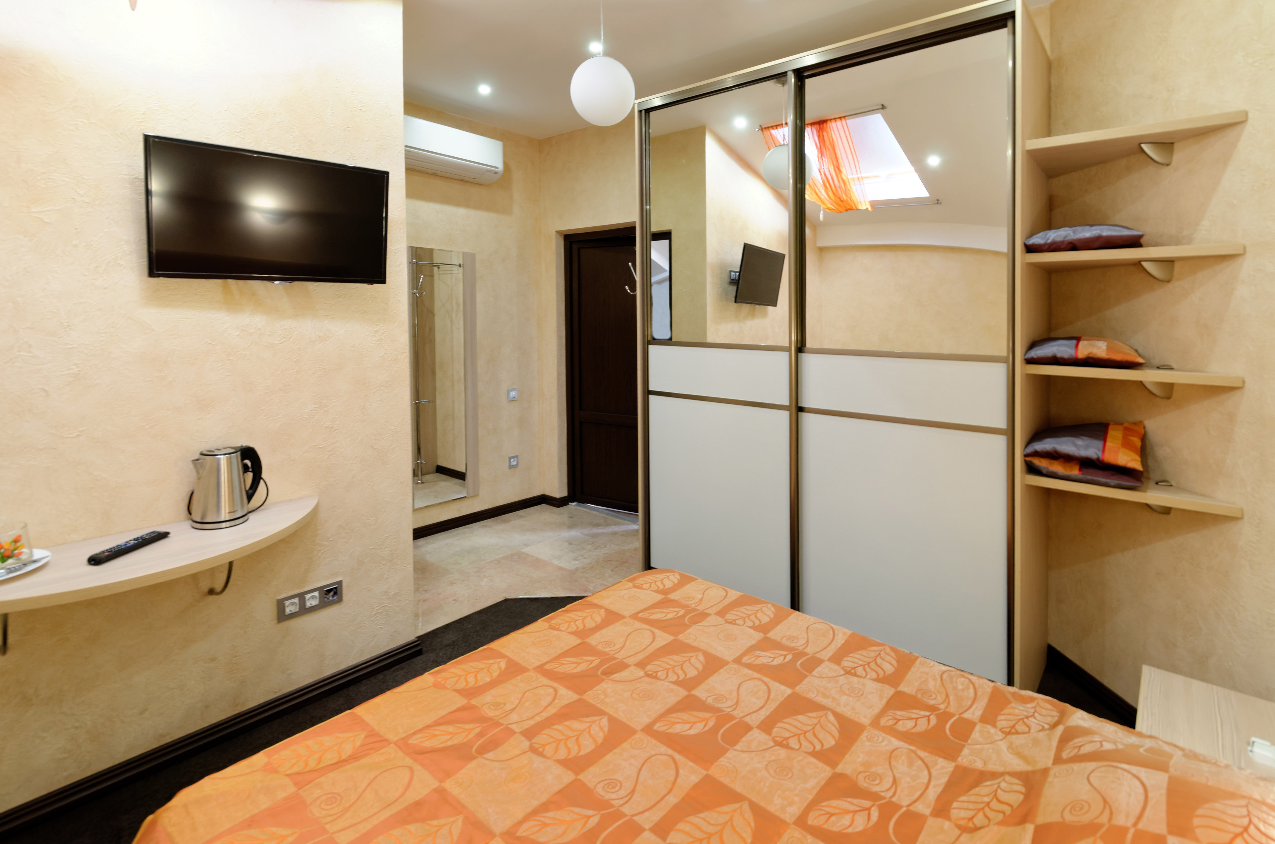 В номере: диван раскладной, зеркало, кровать двуспальная, прикроватные тумбочки, стол, стулья, шкаф, кондиционер, телевизор ЖК, холодильник, чайный набор посуды, электрочайник