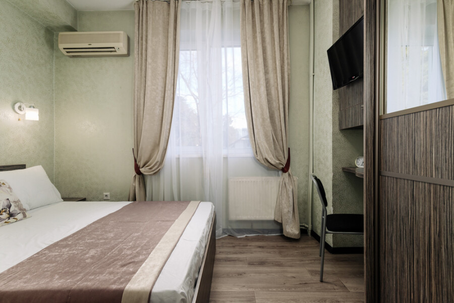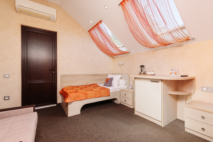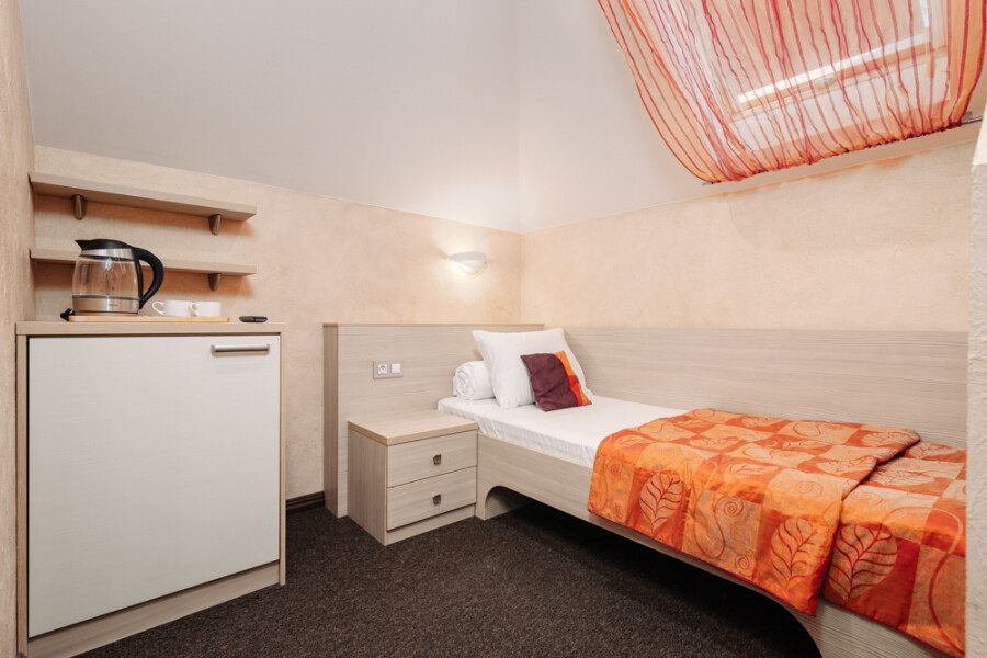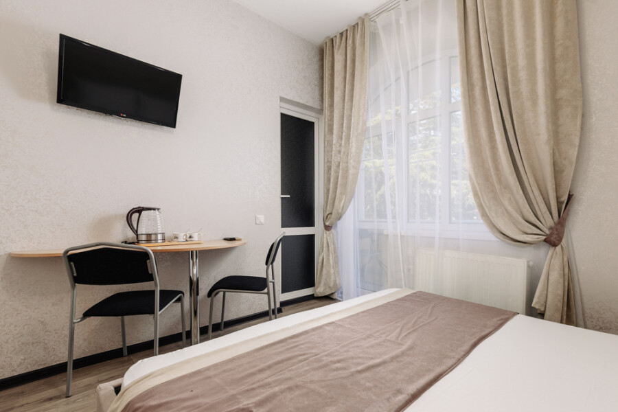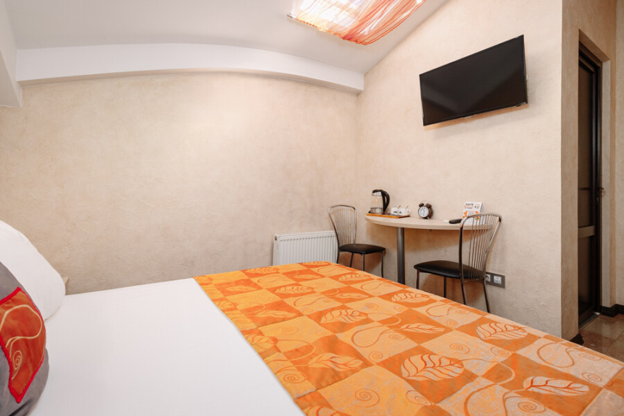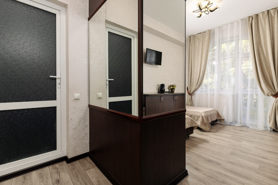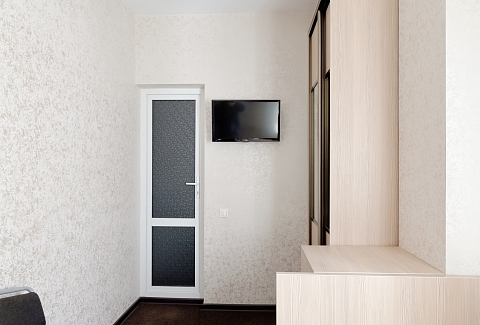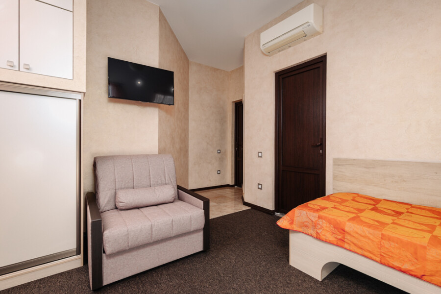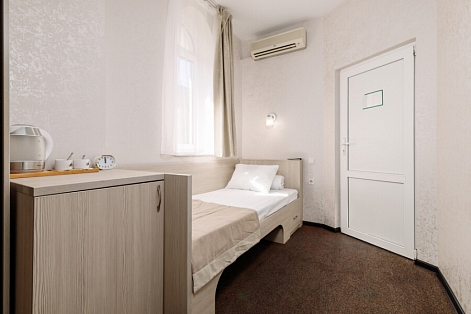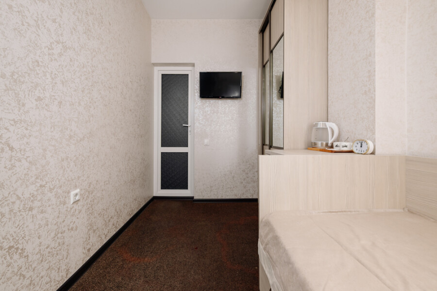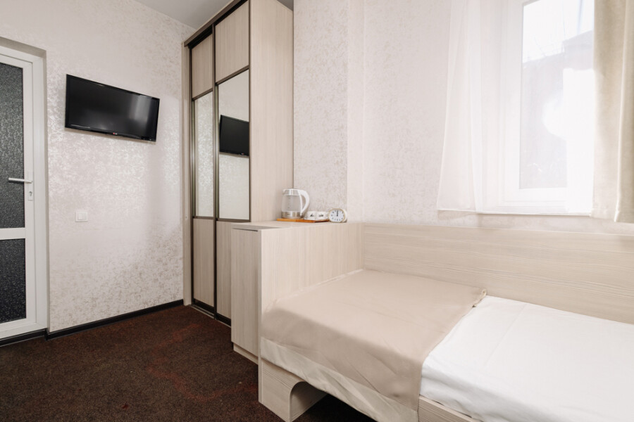 В номере: зеркало, кровать односпальная, стол, стул, шкаф, кондиционер, телевизор ЖК, холодильник, чайный набор посуды, электрочайник