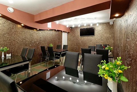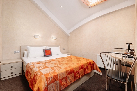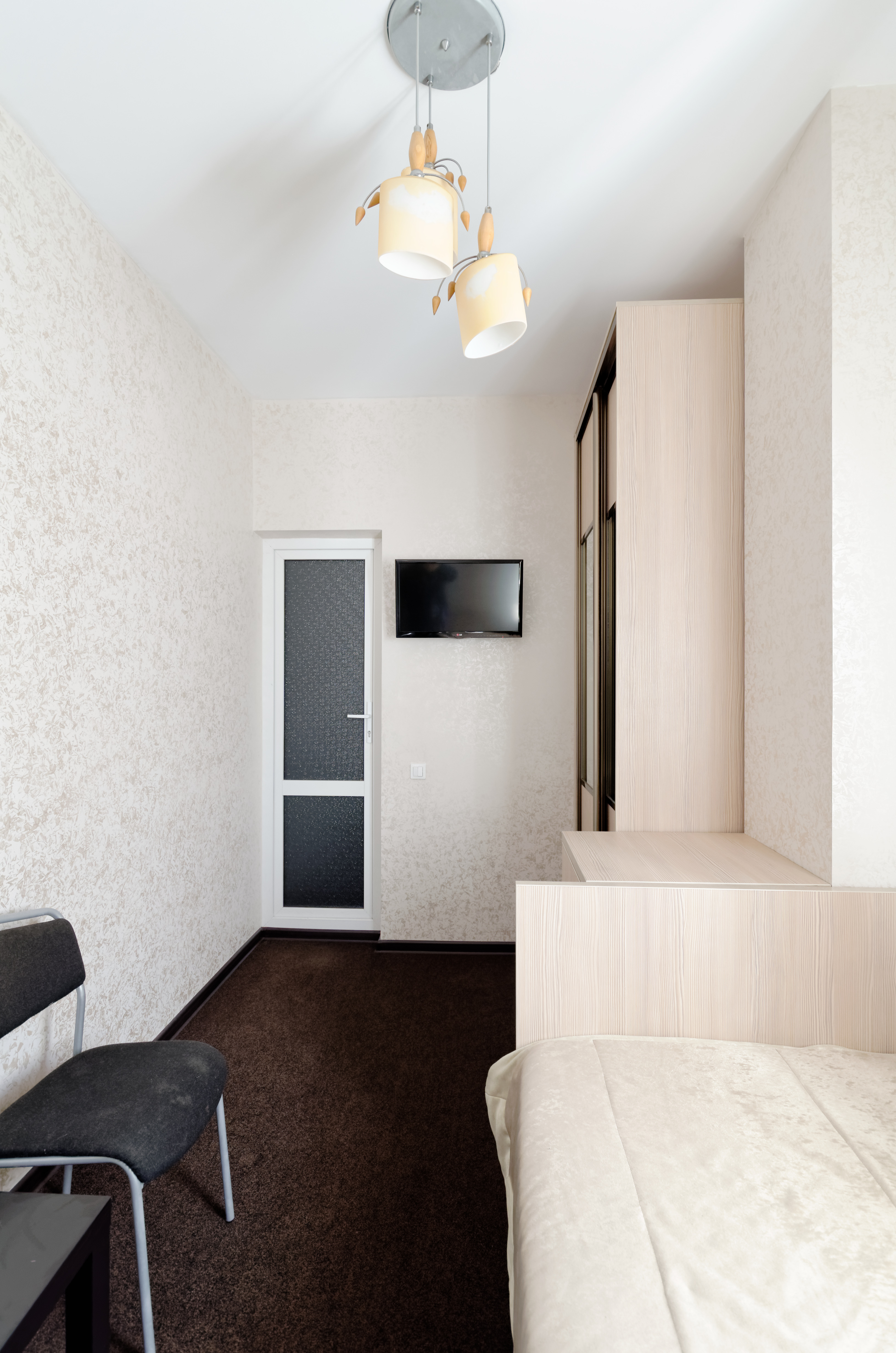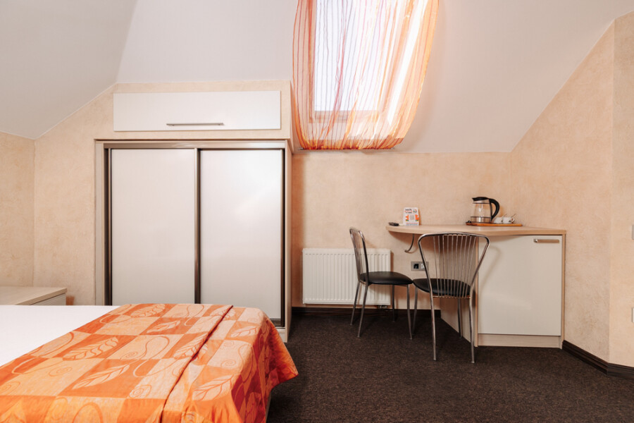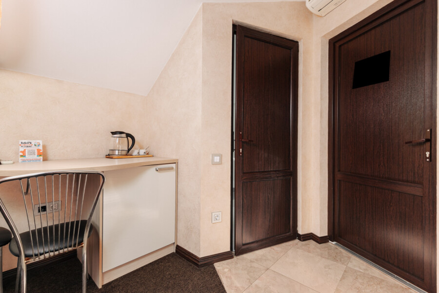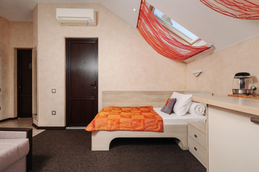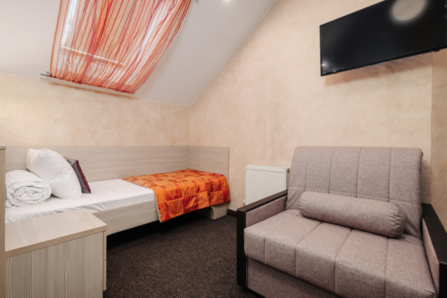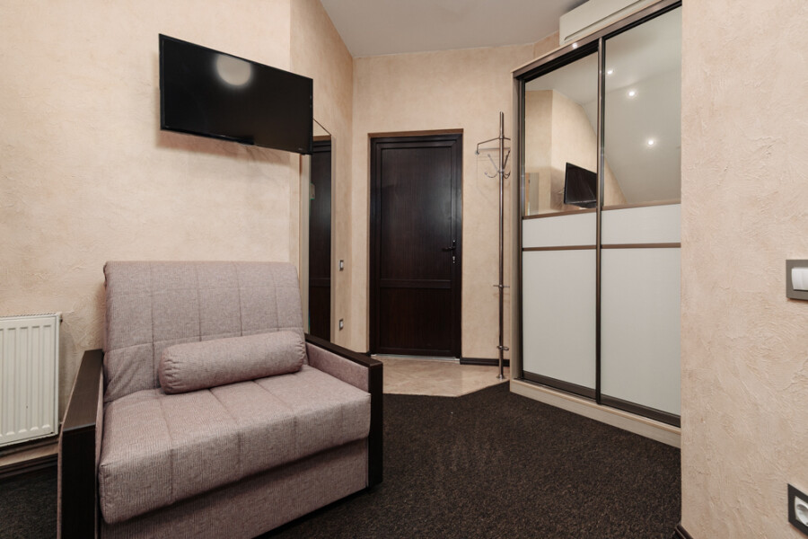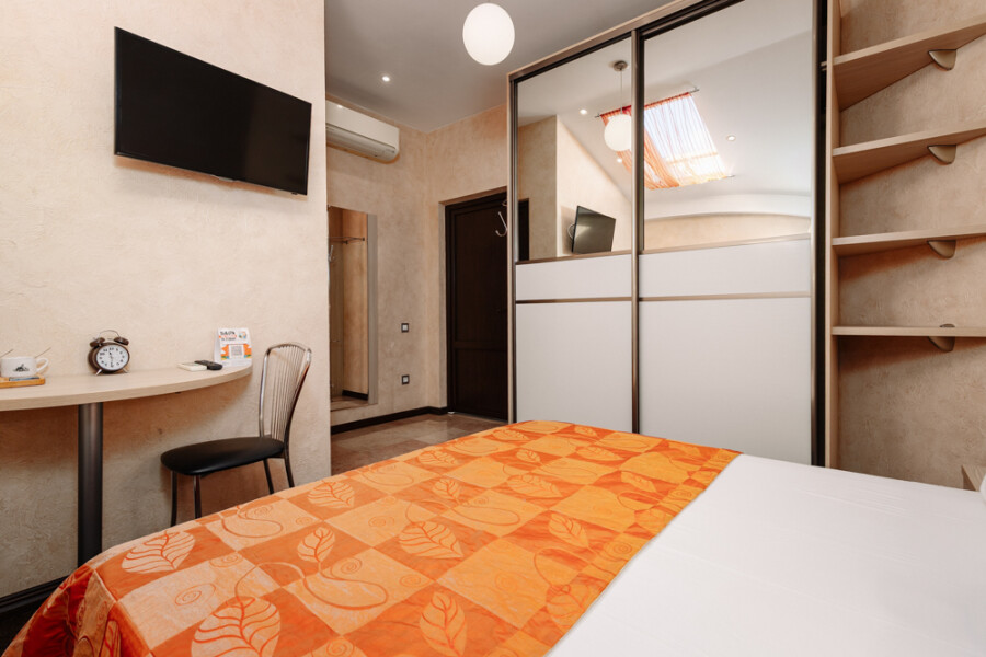 В номере: зеркало, кровать односпальная, стол, стул, шкаф, кондиционер, телевизор ЖК, холодильник, чайный набор посуды, электрочайник