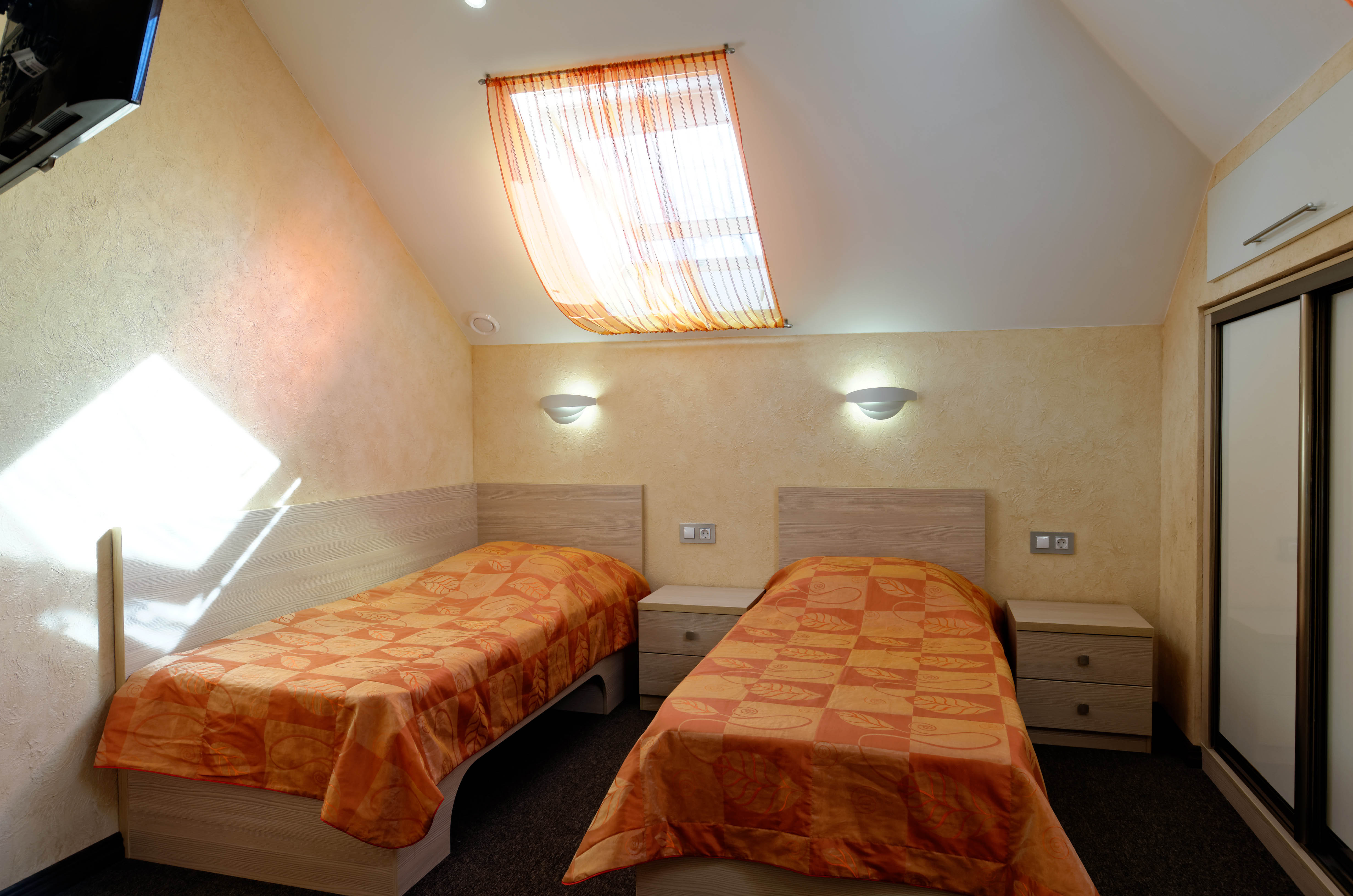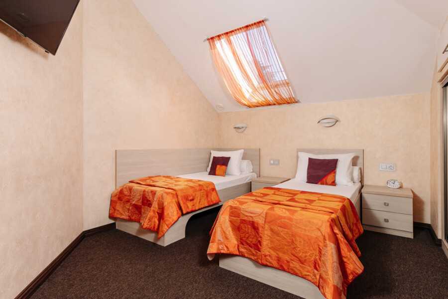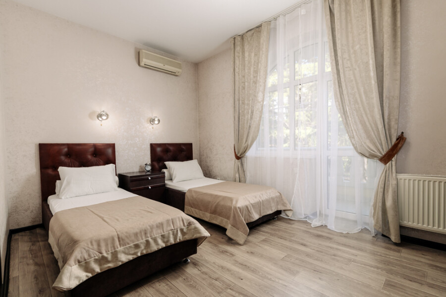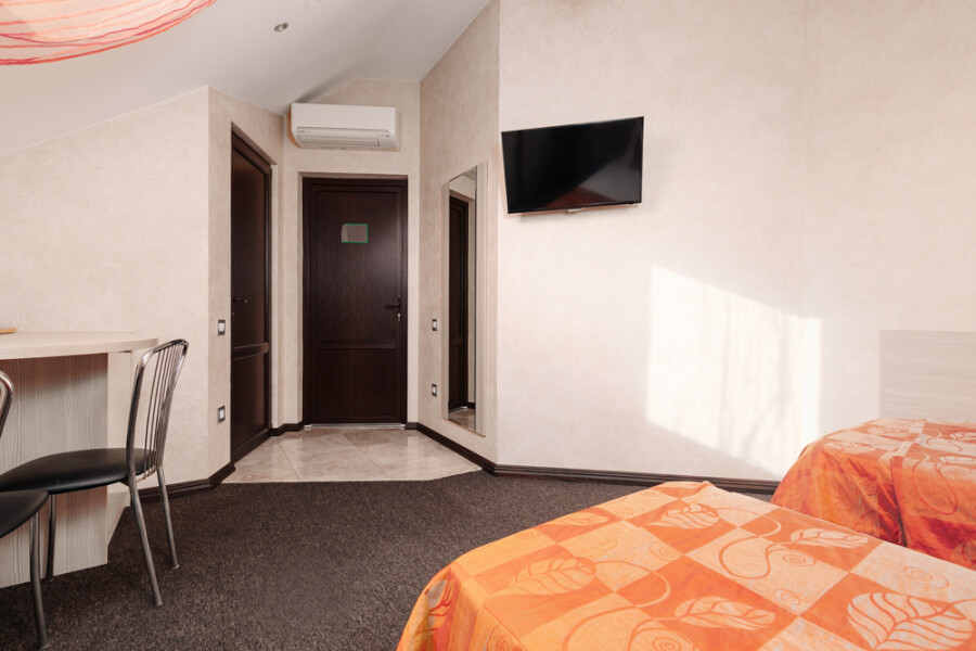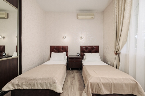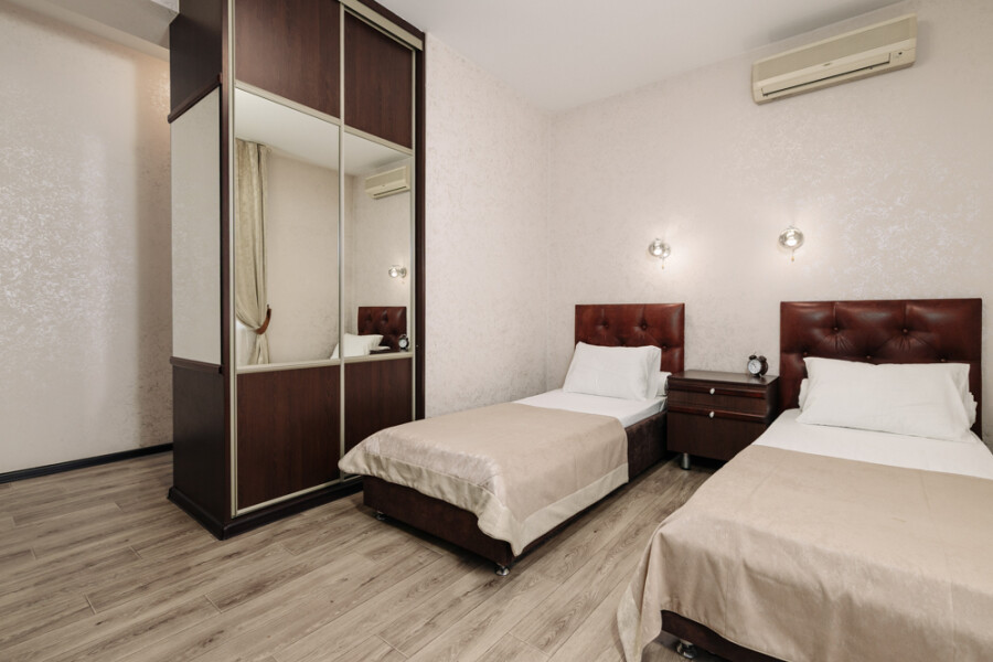 В номере: зеркало, кровати односпальные, прикроватные тумбочки, стол, стулья, шкаф, кондиционер, телевизор ЖК, холодильник, чайный набор посуды, электрочайник
