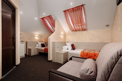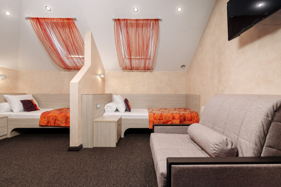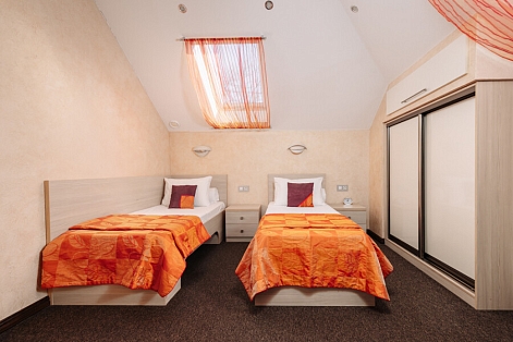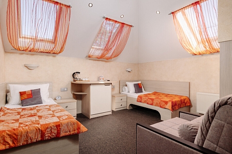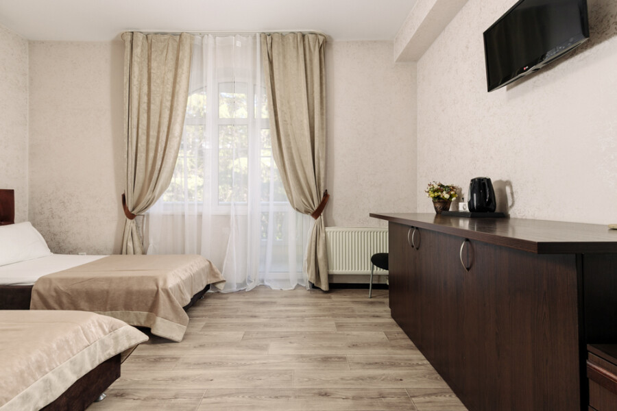 В номере: кресло-кровать, кровати односпальные, прикроватные тумбочки, стол, стулья, шкаф, кондиционер, телевизор ЖК, холодильник, чайный набор посуды, электрочайник