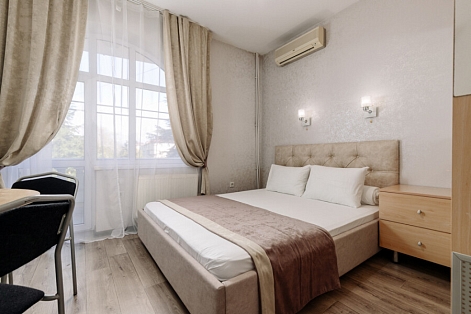 В номере: зеркало, кровать двуспальная, прикроватные тумбочки, стол, стулья, шкаф, кондиционер, телевизор ЖК, холодильник, чайный набор посуды, электрочайник