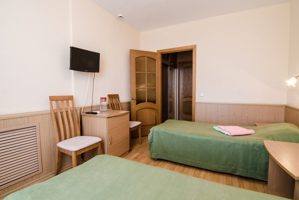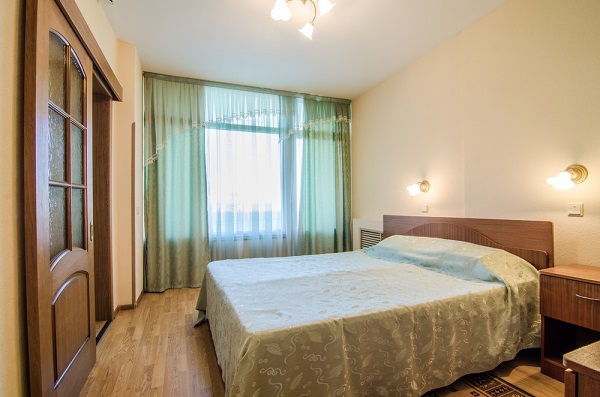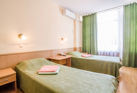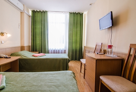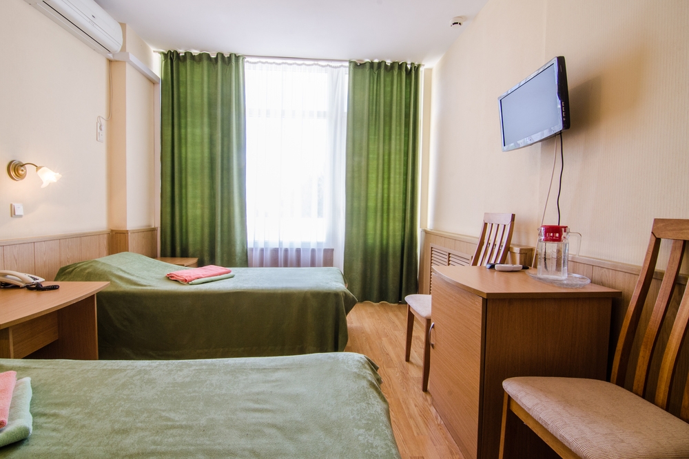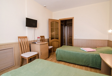 В номере: вешалка, зеркало, кровати односпальные /одна двуспальная кровать, прикроватные тумбочки, стол, стулья, шкаф-купе, кондиционер, мини-холодильник, набор посуды, телевизор ЖК, телефон, электрочайник