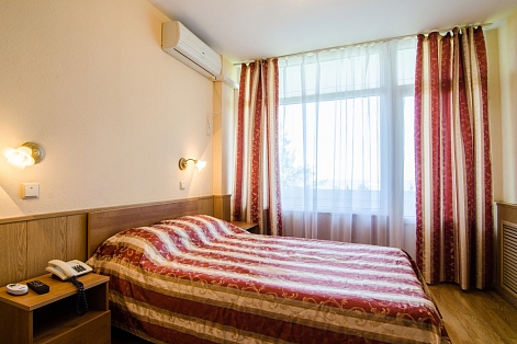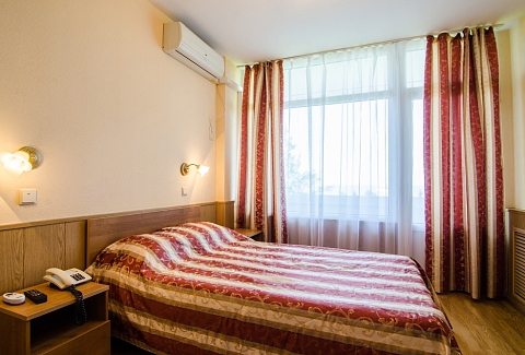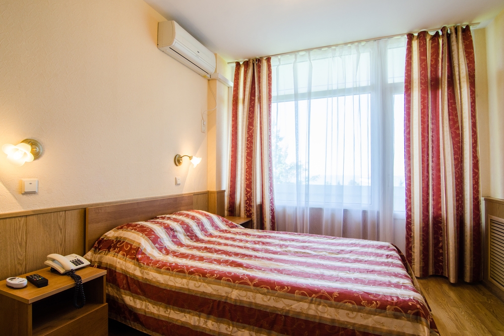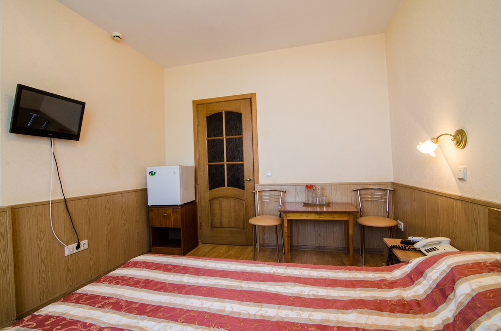 В номере: вешалка, зеркало, кровать полутороспальная, прикроватные тумбочки, стол, стулья, шкаф-купе, кондиционер, мини-холодильник, набор посуды, телевизор ЖК, телефон, электрочайник