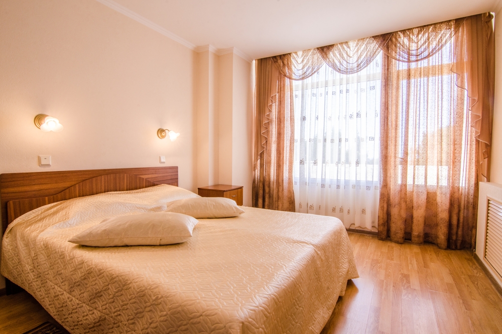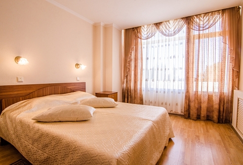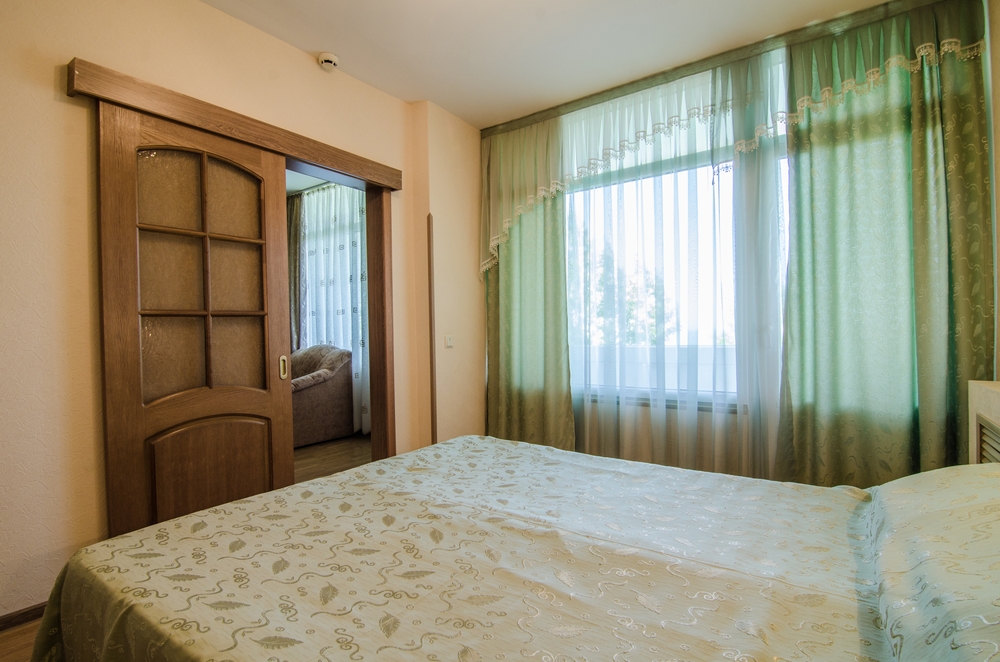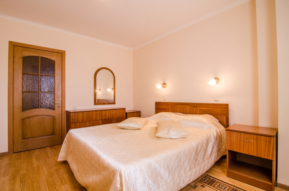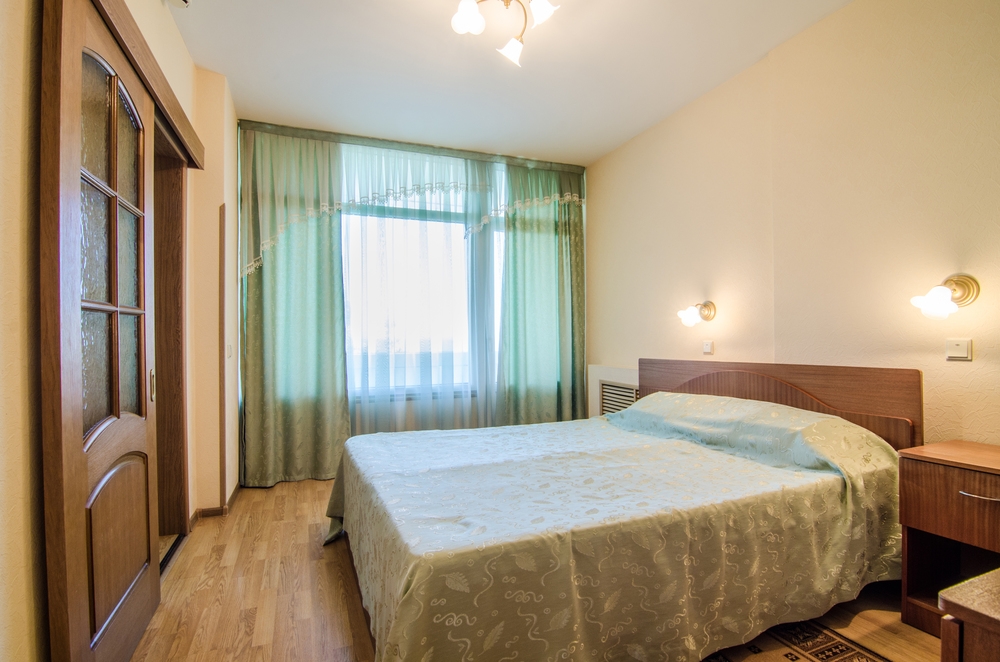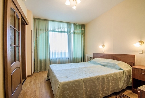 В номере: вешалка, зеркало, кровать двуспальная, набор мягкой мебели, прикроватные тумбочки, столик журнальный, столик туалетный, шкаф, кондиционер, мини-холодильник, набор посуды, телевизор ЖК, телефон, электрочайник