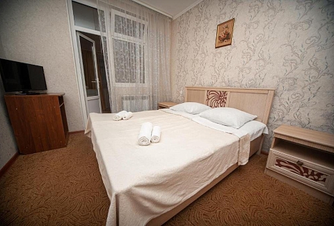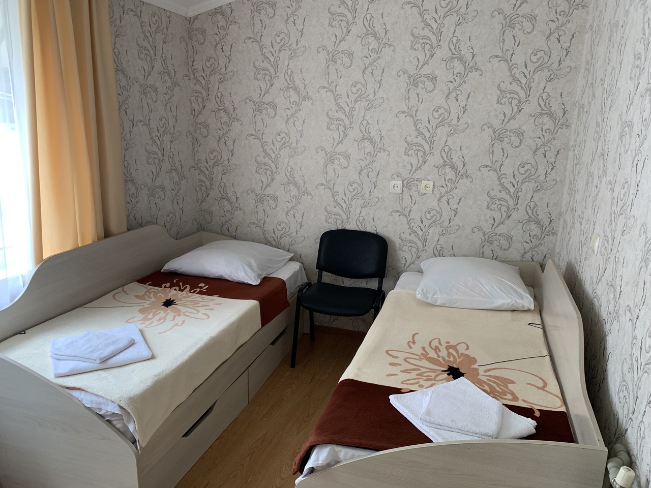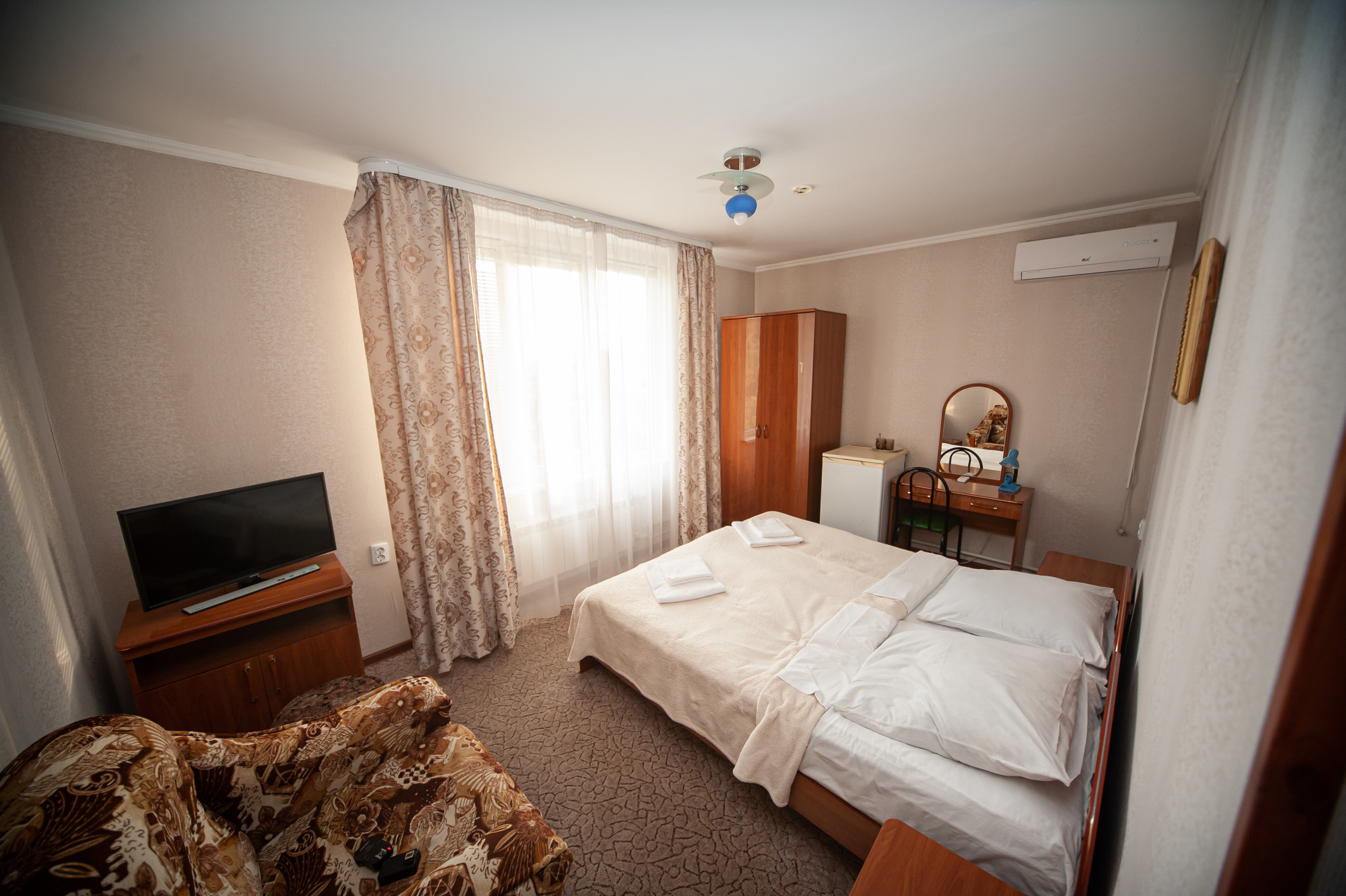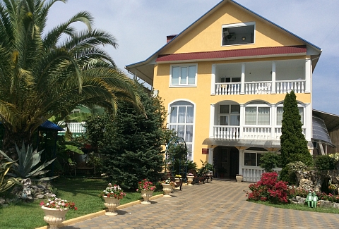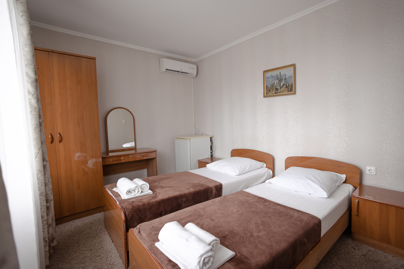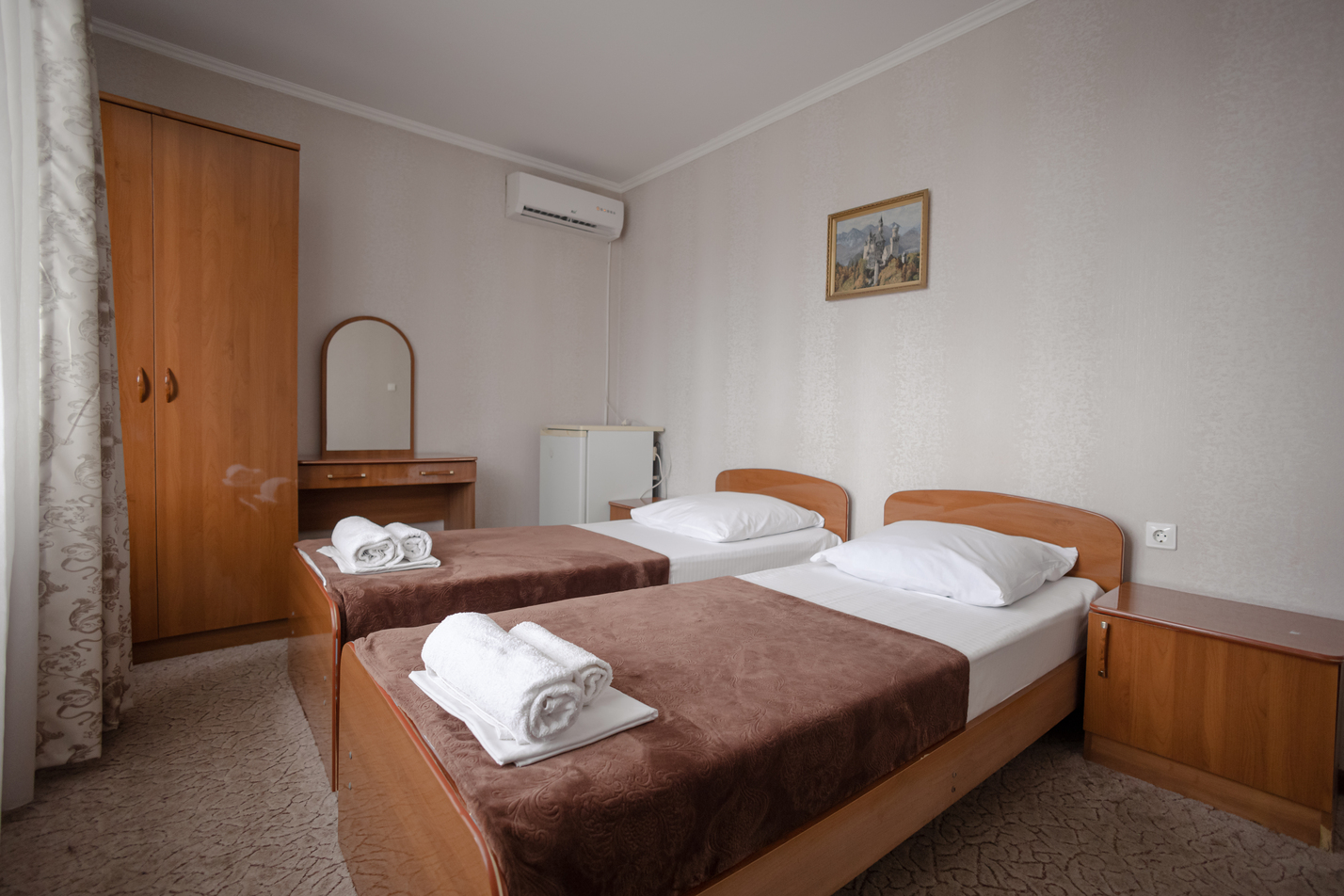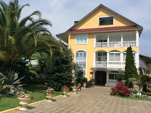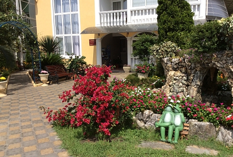 Отель занимает небольшую благоустроенную территорию в 400 метрах от моря. В распоряжении гостей однокомнатные и двухкомнатные номера с удобствами. В каждом номере предусмотрен индивидуальный санузел, есть кондиционер, электрочайник, мини-холодильник и телевизор. Для удобства отдыхающих в отеле есть микроволновая печь и термопод. В числе удобств — парковка возле корпуса и беспроводной интернет. До галечного пляжа — 5 минут ходьбы неспешным шагом. На побережье установлены лежаки, шезлонги, навесы, есть кабинки для переодевания.