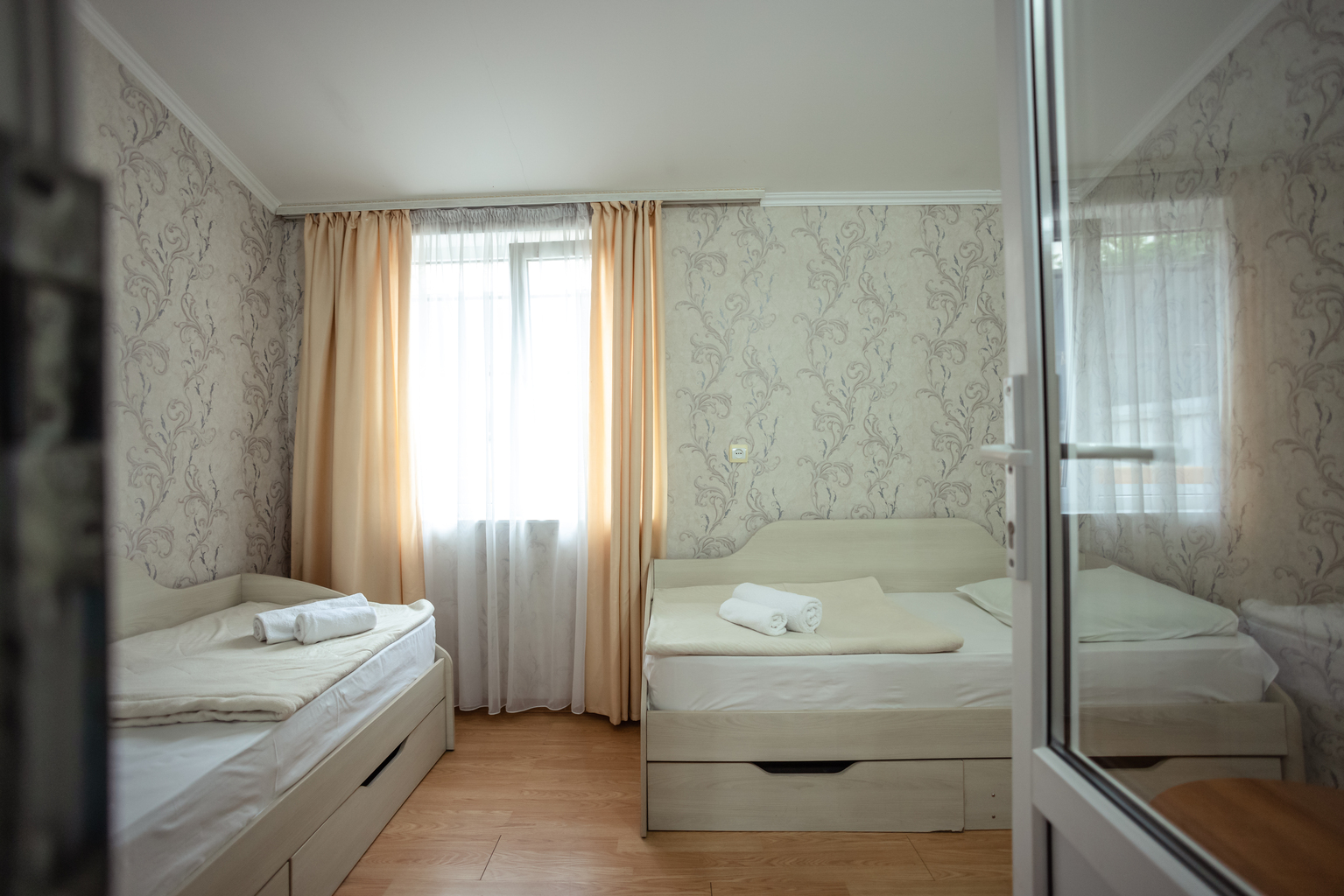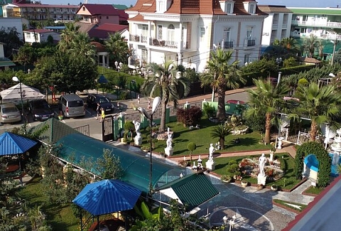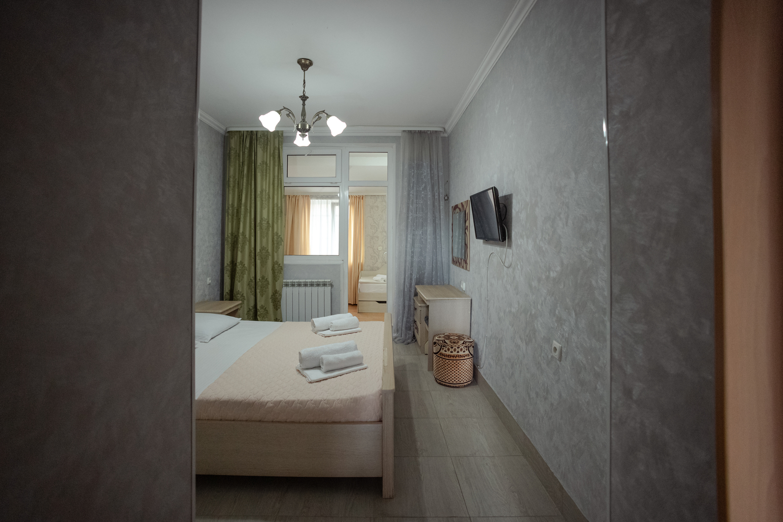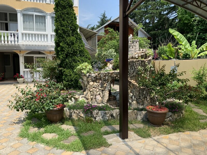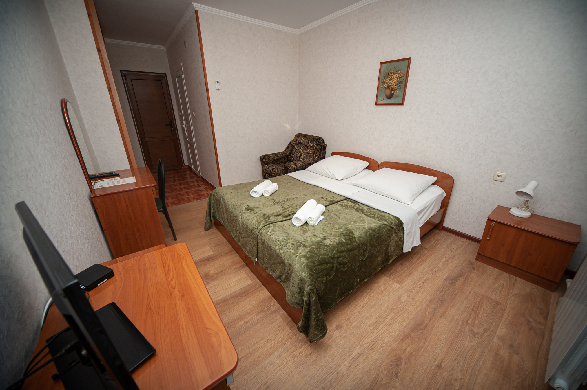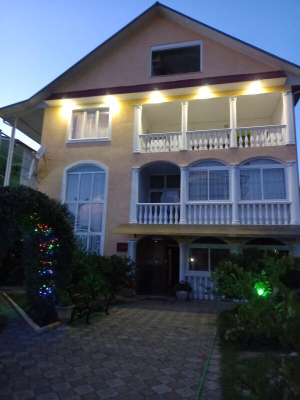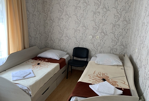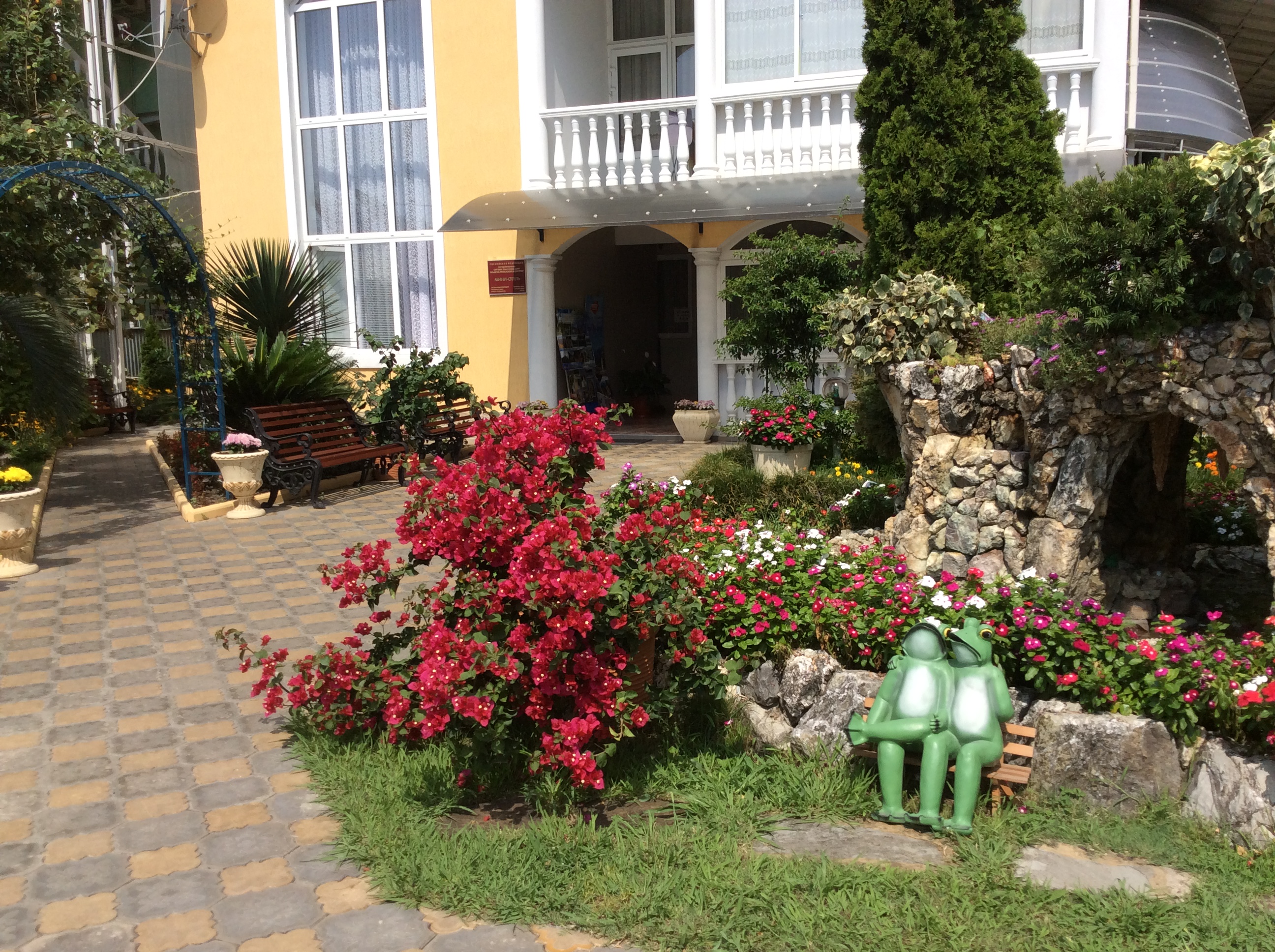 Отель занимает небольшую благоустроенную территорию в 400 метрах от моря. В распоряжении гостей однокомнатные и двухкомнатные номера с удобствами. В каждом номере предусмотрен индивидуальный санузел, есть кондиционер, электрочайник, мини-холодильник и телевизор. Для удобства отдыхающих в отеле есть микроволновая печь и термопод. В числе удобств — парковка возле корпуса и беспроводной интернет. До галечного пляжа — 5 минут ходьбы неспешным шагом. На побережье установлены лежаки, шезлонги, навесы, есть кабинки для переодевания.