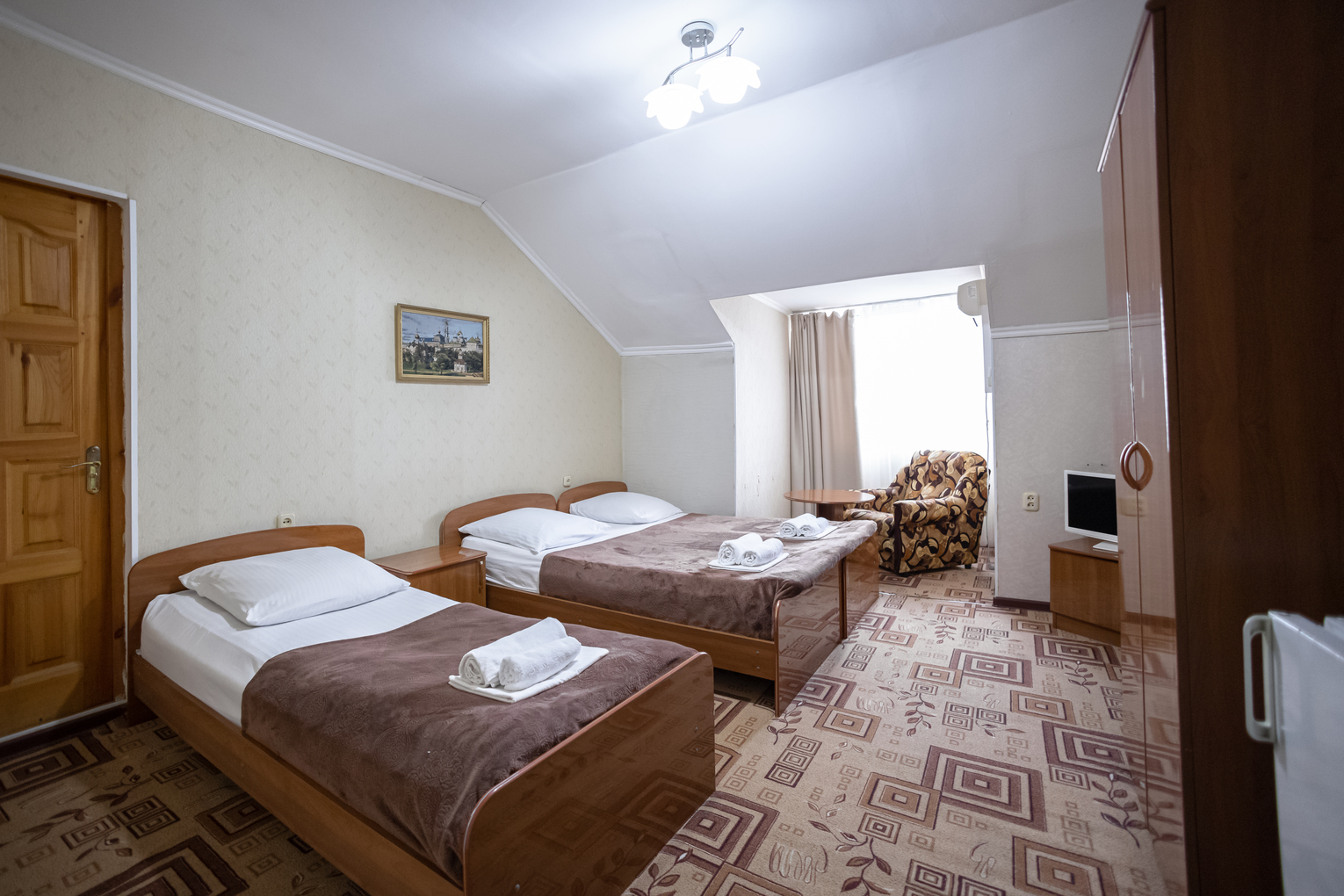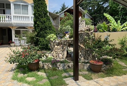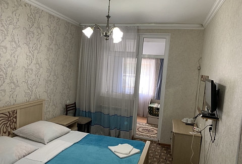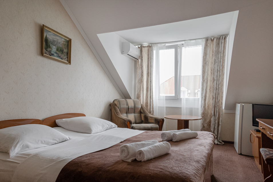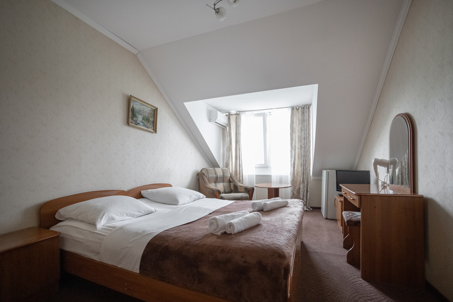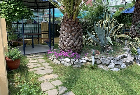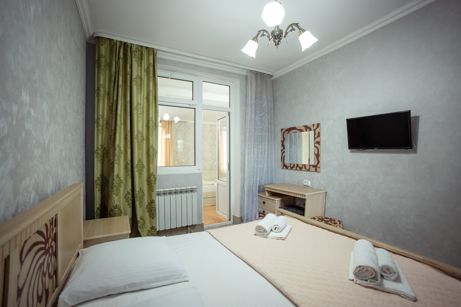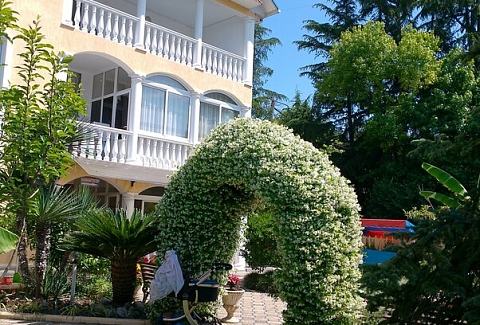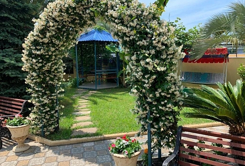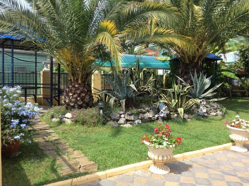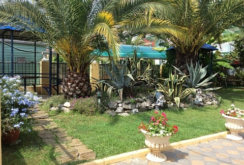 Отель занимает небольшую благоустроенную территорию в 400 метрах от моря. В распоряжении гостей однокомнатные и двухкомнатные номера с удобствами. В каждом номере предусмотрен индивидуальный санузел, есть кондиционер, электрочайник, мини-холодильник и телевизор. Для удобства отдыхающих в отеле есть микроволновая печь и термопод. В числе удобств — парковка возле корпуса и беспроводной интернет. До галечного пляжа — 5 минут ходьбы неспешным шагом. На побережье установлены лежаки, шезлонги, навесы, есть кабинки для переодевания.