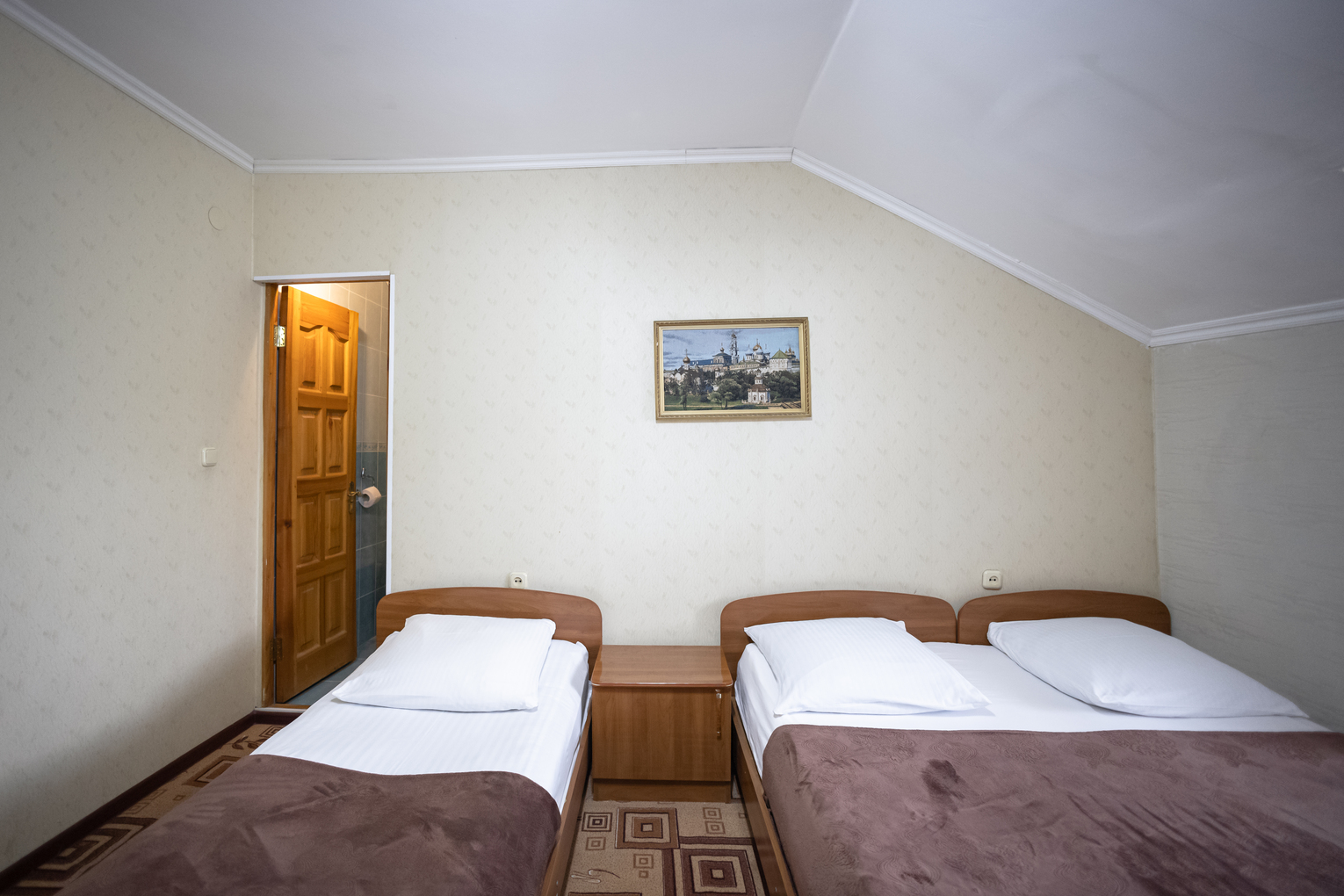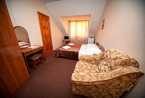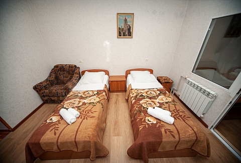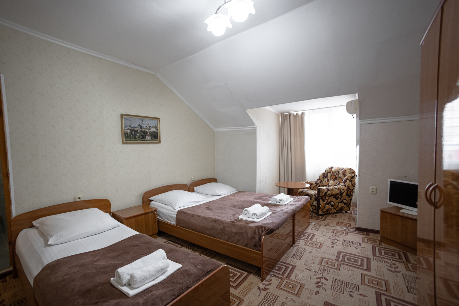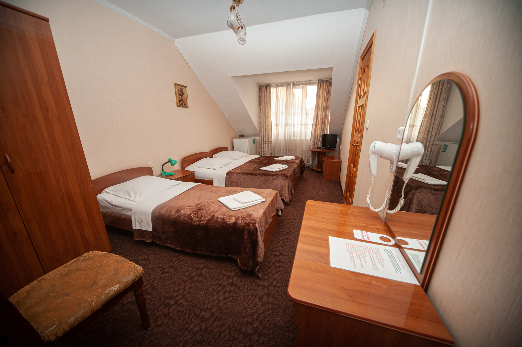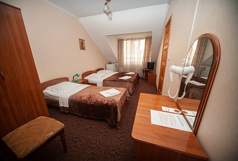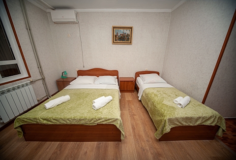 В номере: зеркало, кресло-кровать, кровати односпальные, кровать двуспальная, прикроватные тумбочки, пуфик, стол, стулья, шкаф, кондиционер, телевизор, холодильник, чайный набор посуды, электрочайник