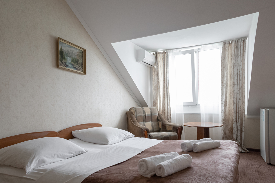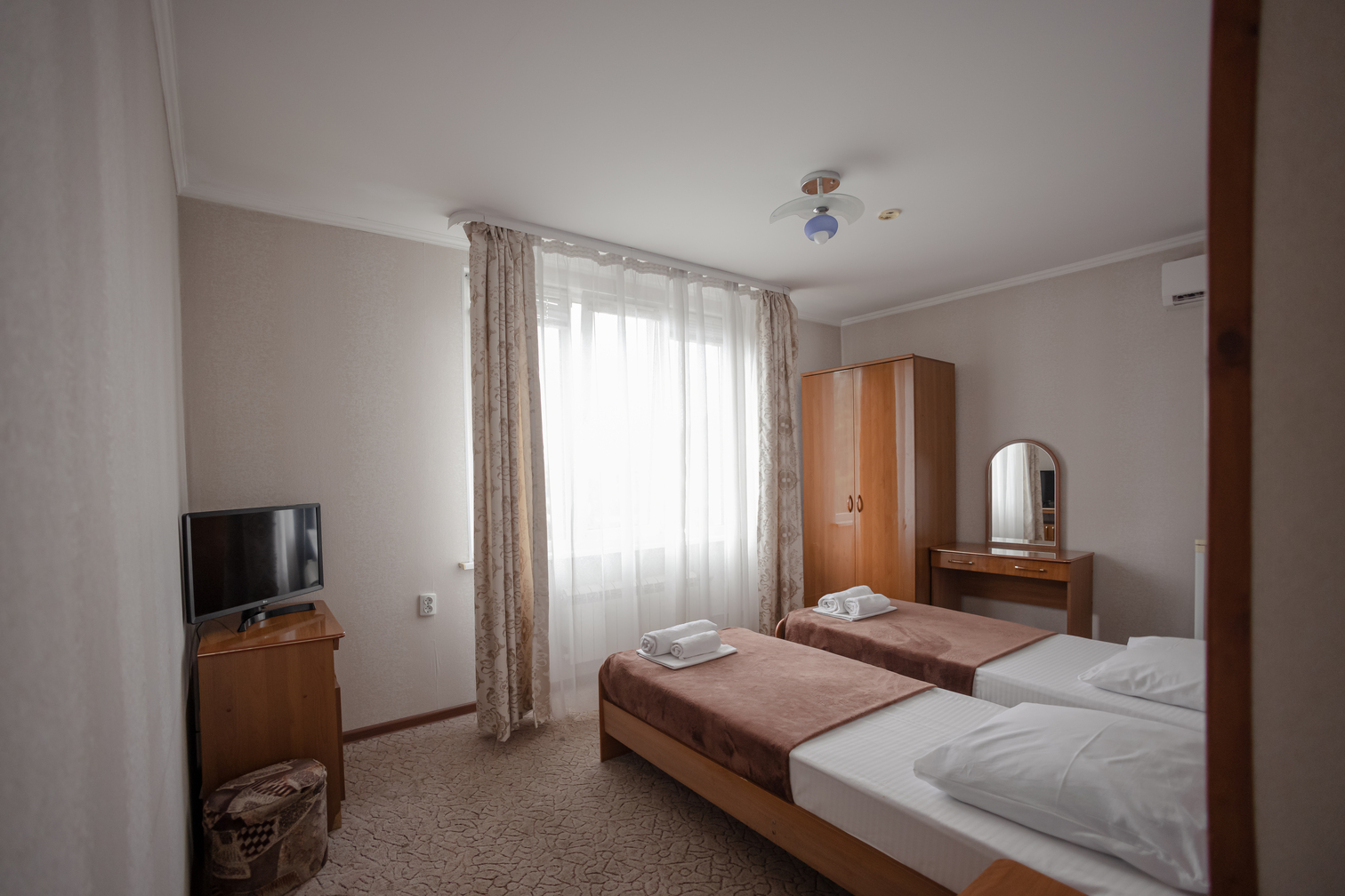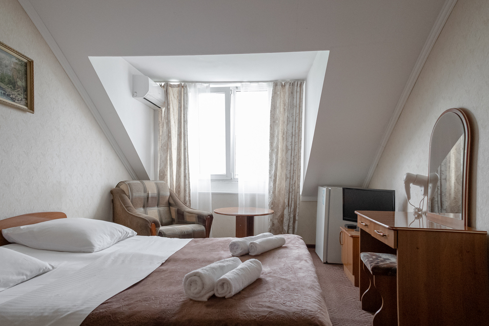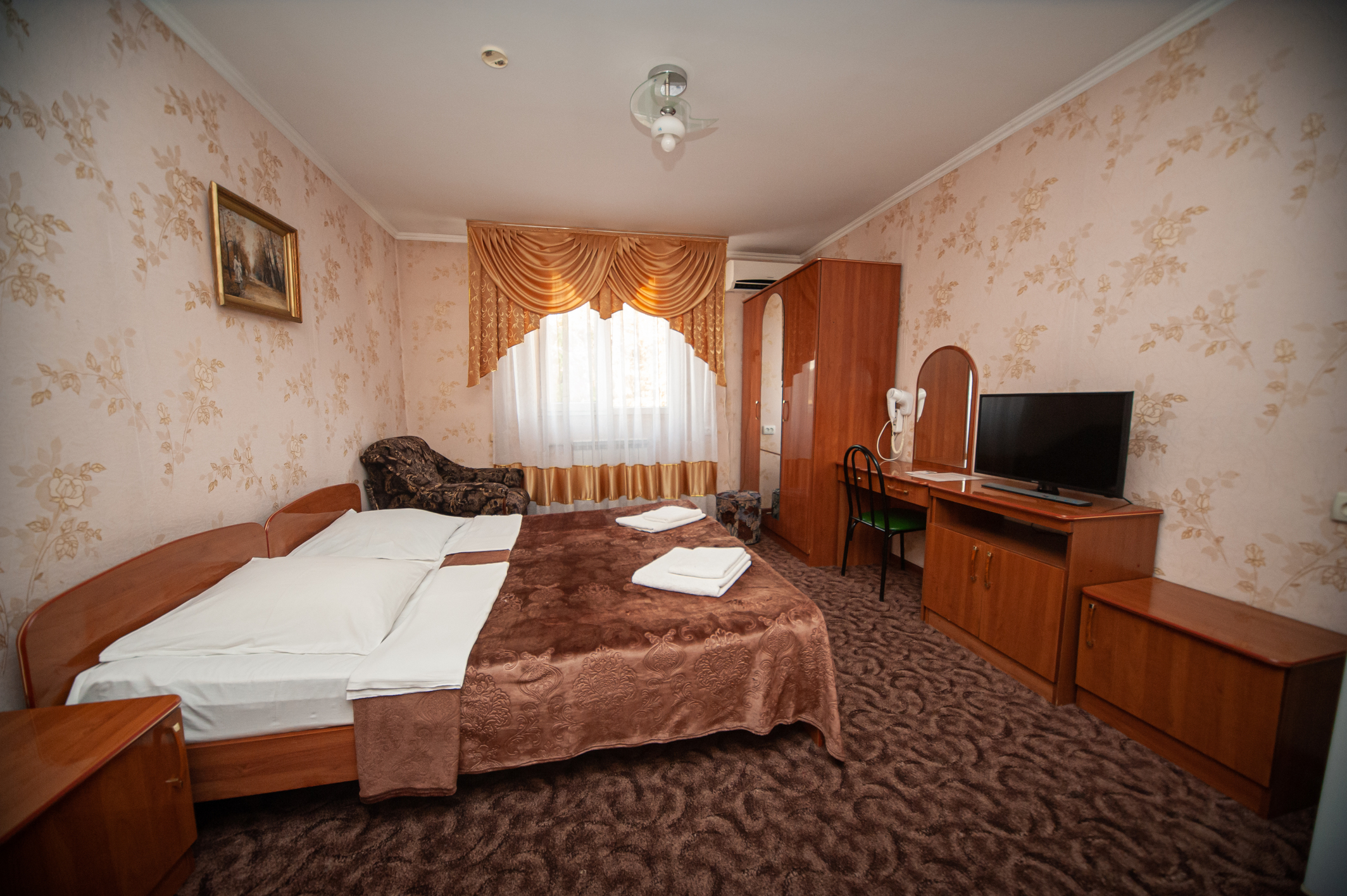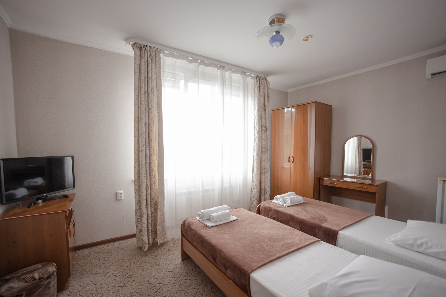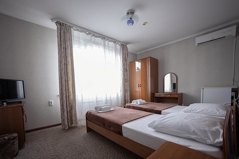 В номере: зеркало, кресло-кровать, кровати односпальные /одна двуспальная кровать, прикроватные тумбочки, пуфик, стул, шкаф, кондиционер, набор посуды, сейф, телевизор ЖК, холодильник