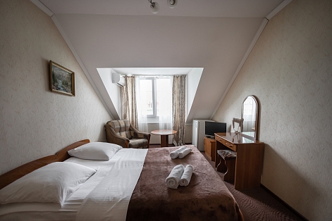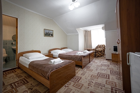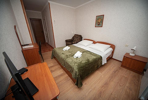 В номере: зеркало, кресло-кровать, кровати односпальные /одна двуспальная кровать, прикроватные тумбочки, пуфик, стол, стулья, шкаф, кондиционер, телевизор ЖК, холодильник, чайный набор посуды, электрочайник