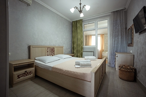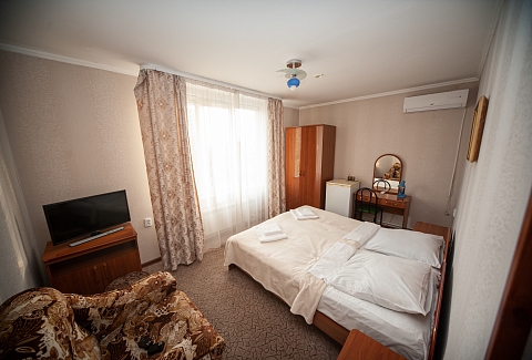 В номере: зеркало, кресло-кровать, кровать двуспальная, прикроватные тумбочки, пуфик, стул, шкаф, кондиционер, набор посуды, телевизор ЖК, холодильник