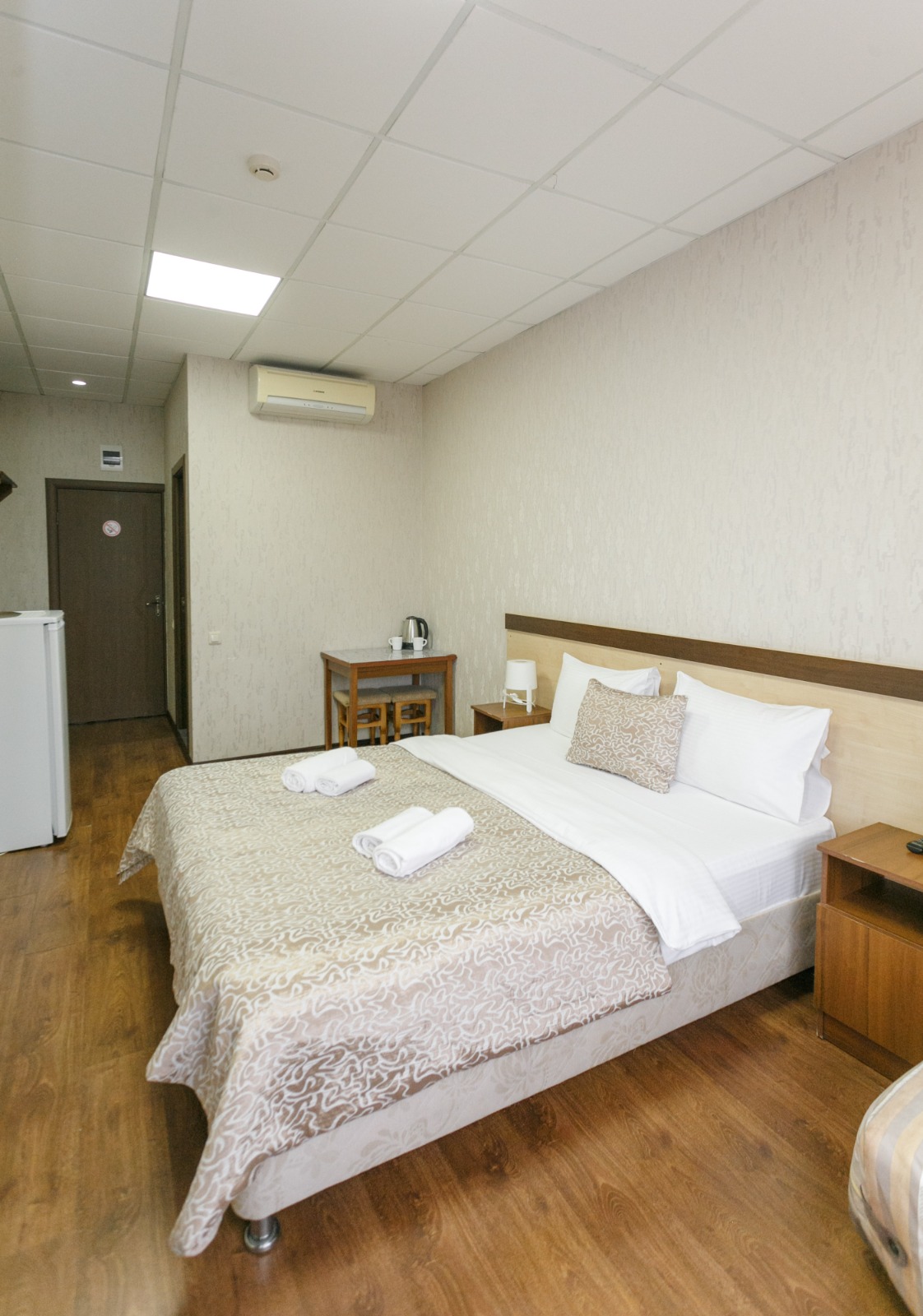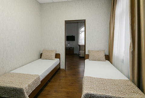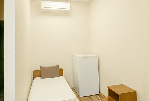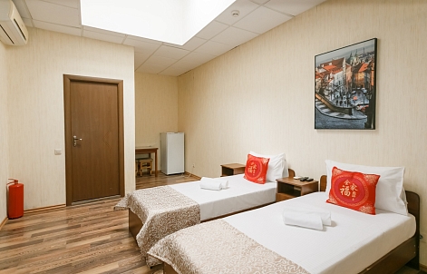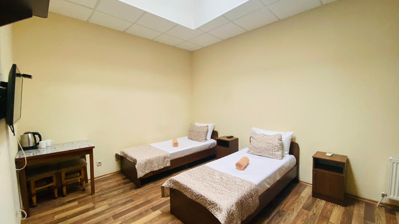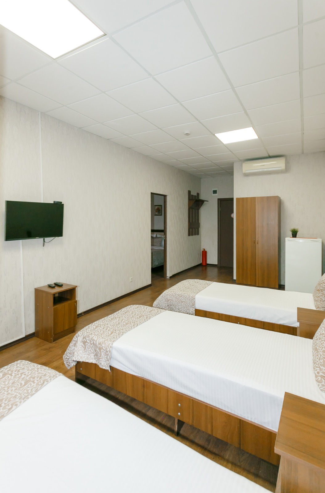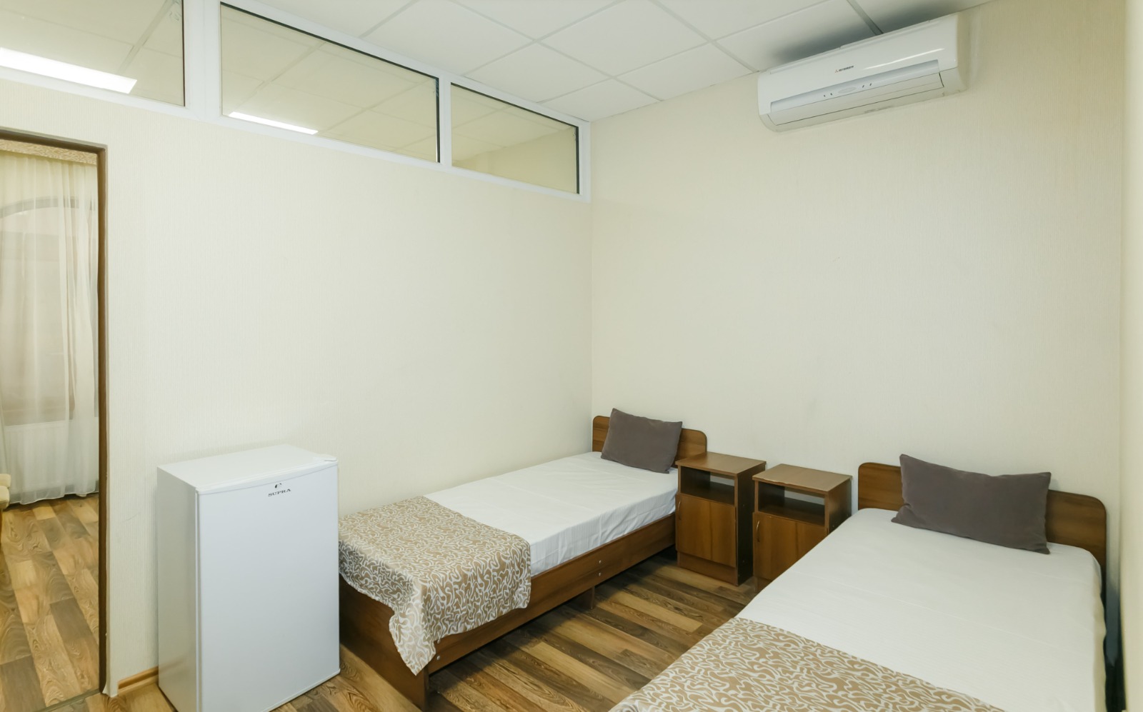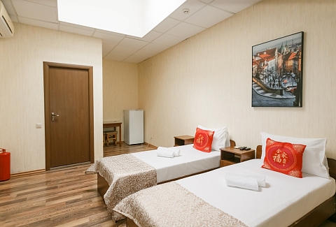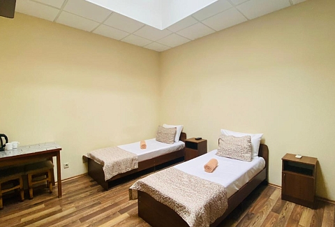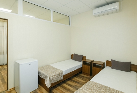 В номере: вешалка, кровати односпальные, прикроватные тумбочки, стол, шкаф, кондиционер, телевизор ЖК, холодильник, электрочайник