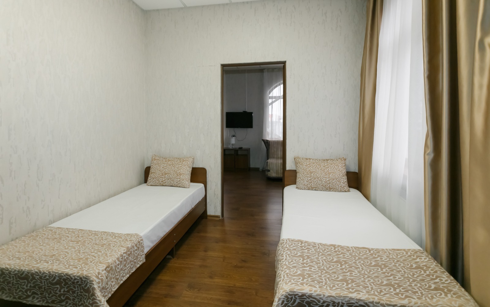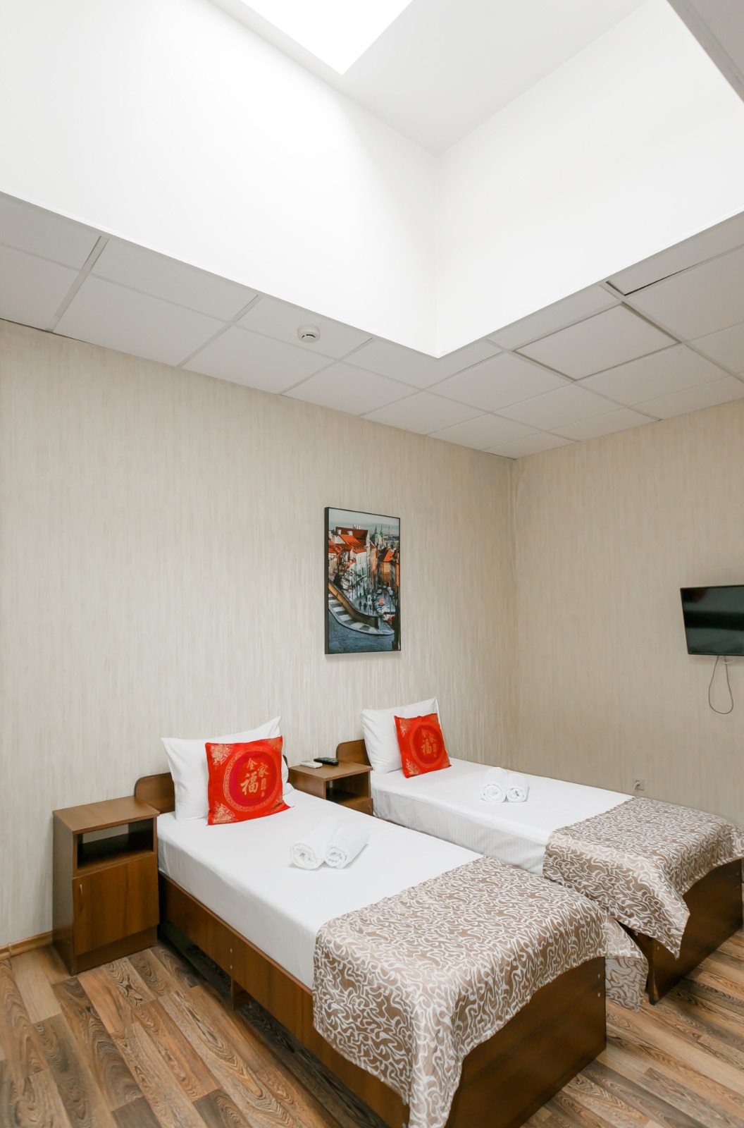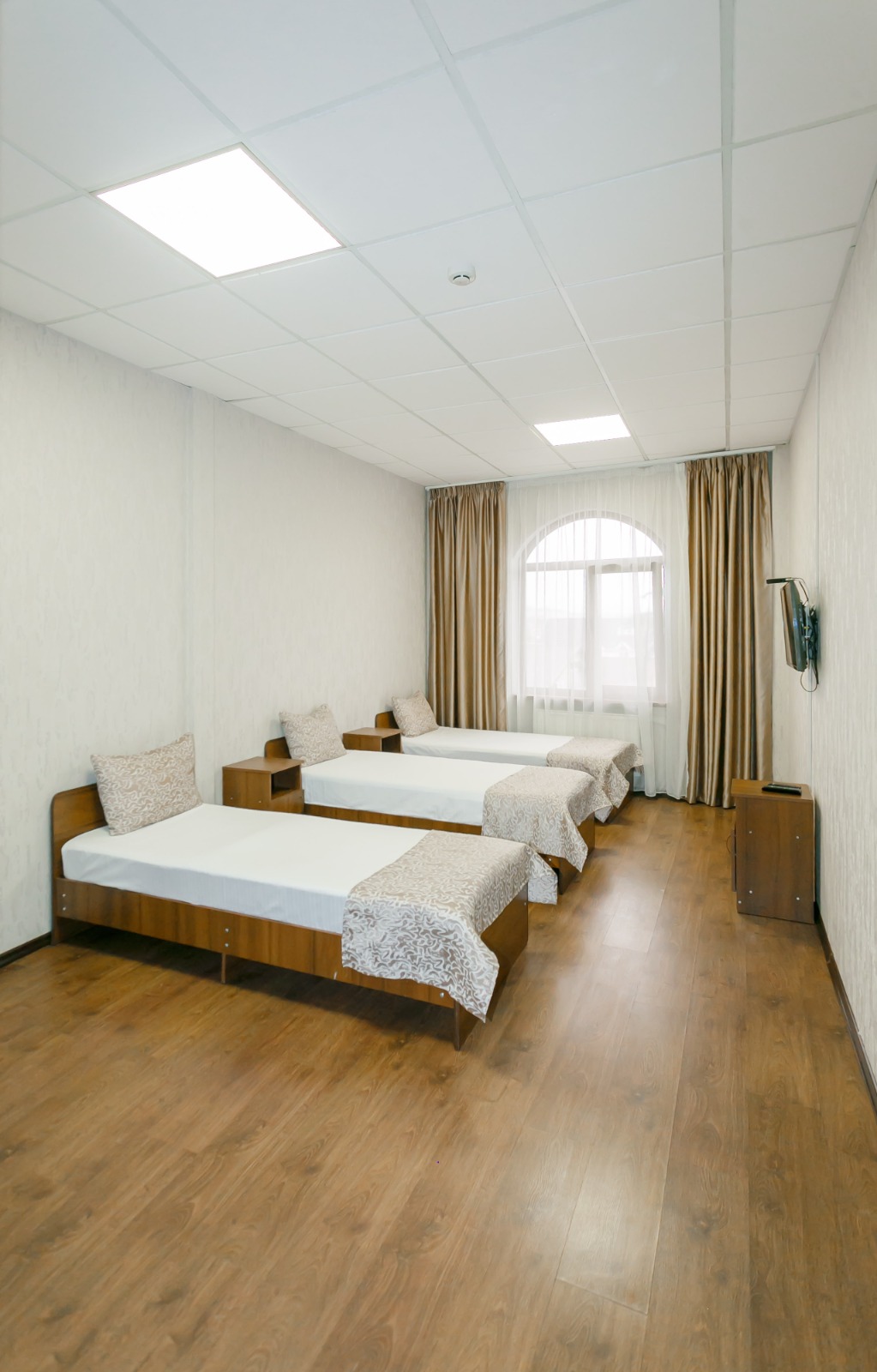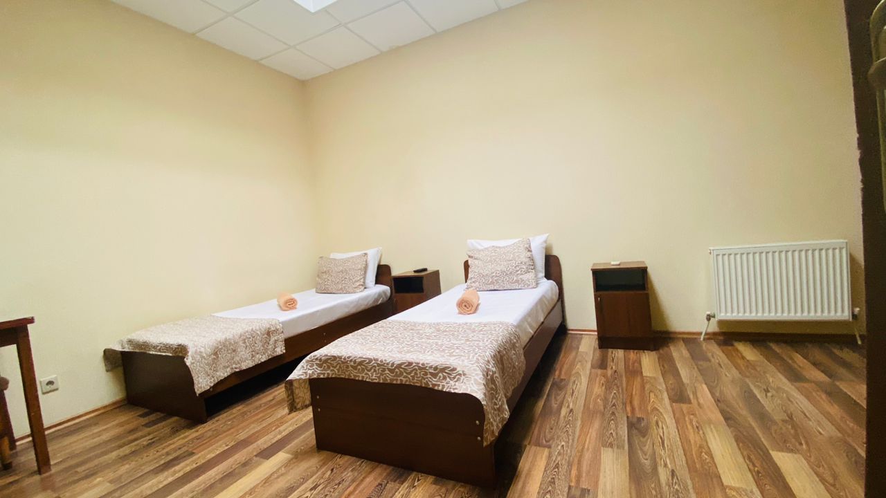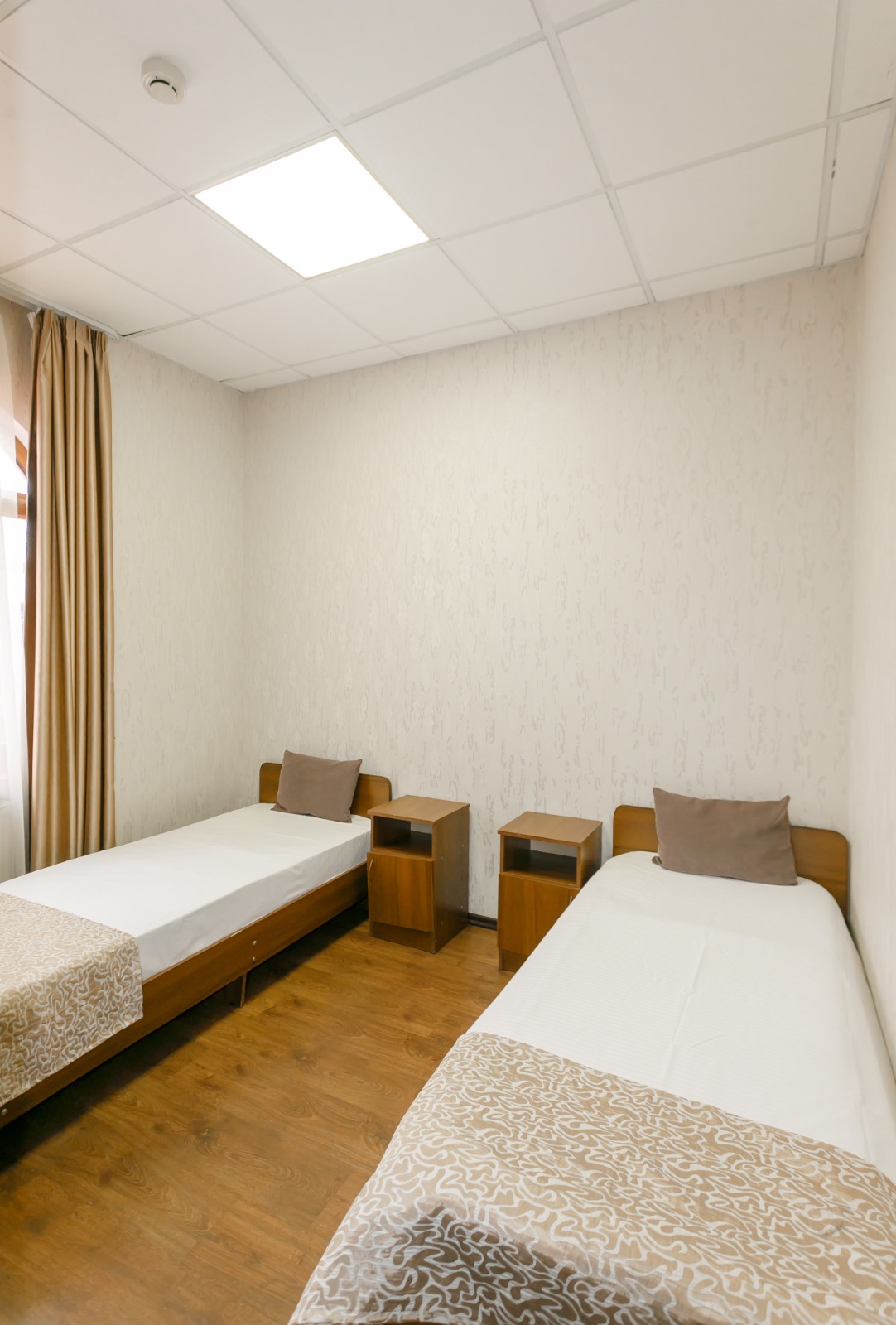 В номере: вешалка, кровати односпальные, прикроватные тумбочки, стол, шкаф, кондиционер, телевизор ЖК, холодильник, электрочайник