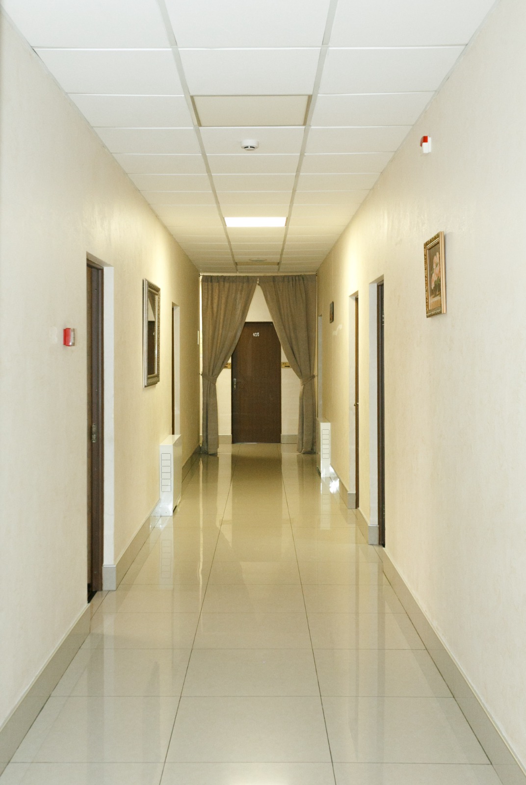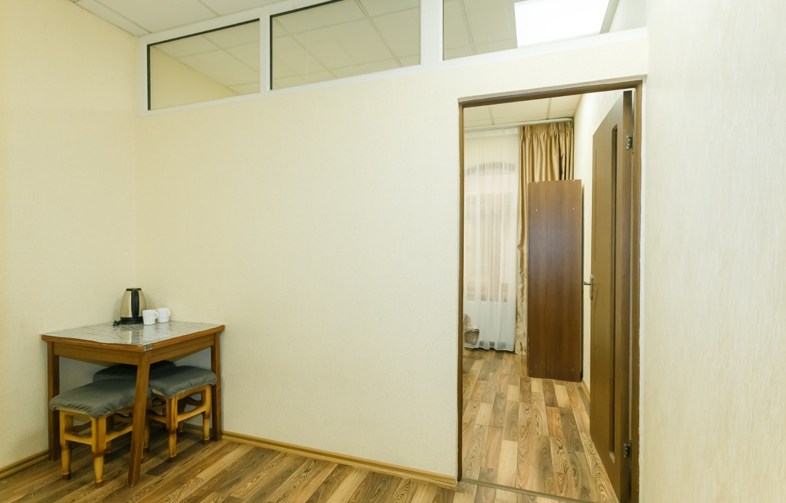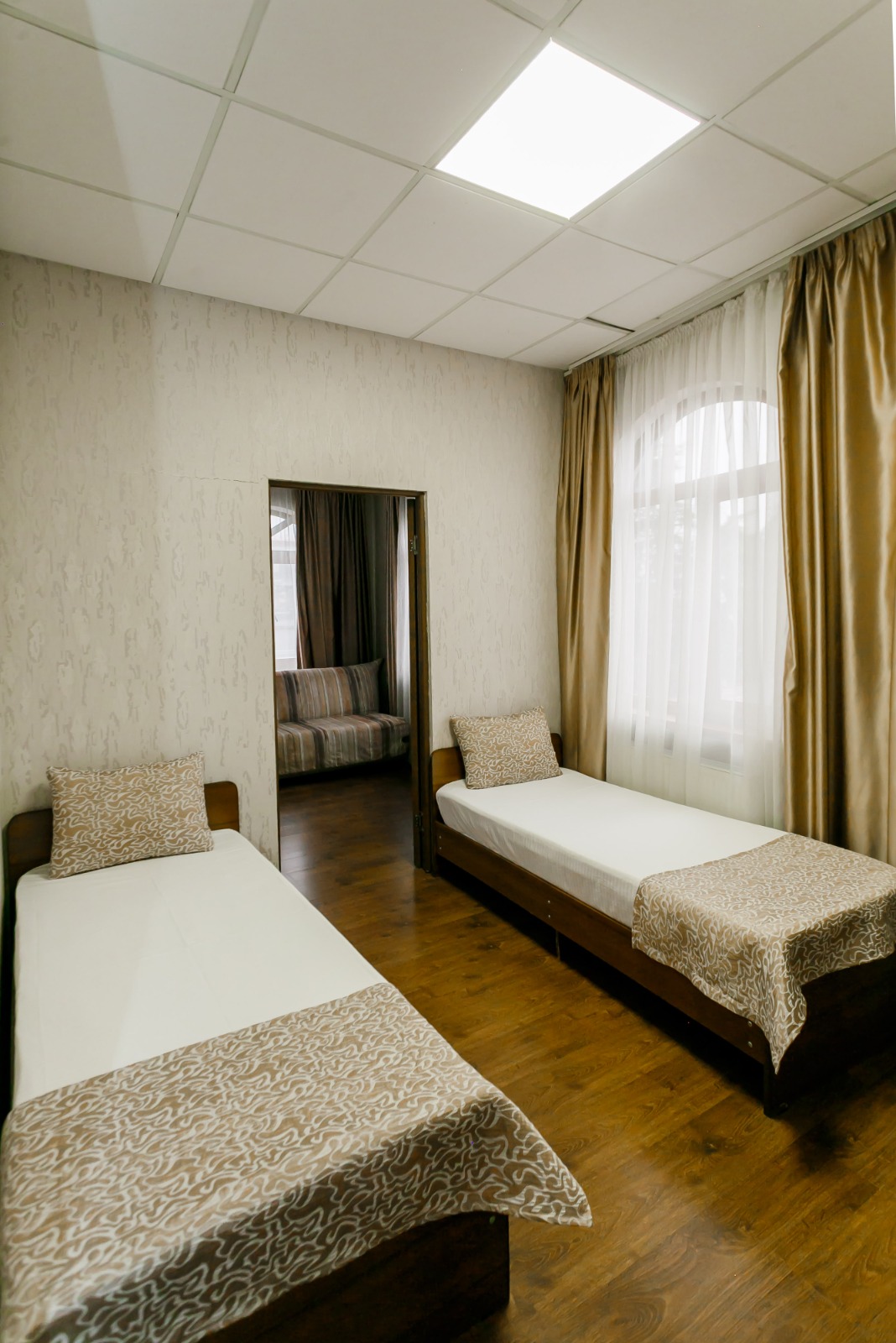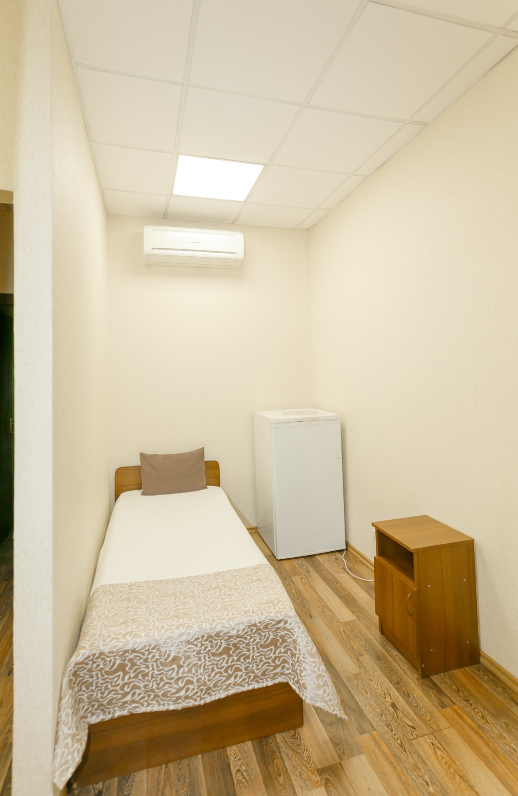 В номере: вешалка, кровати односпальные, прикроватные тумбочки, стол, шкаф, кондиционер, телевизор ЖК, холодильник, электрочайник
