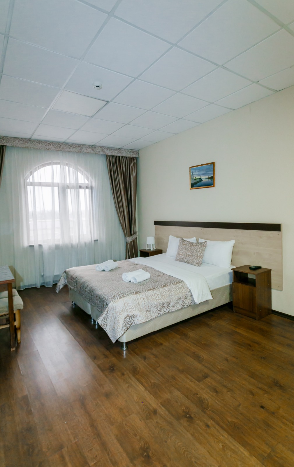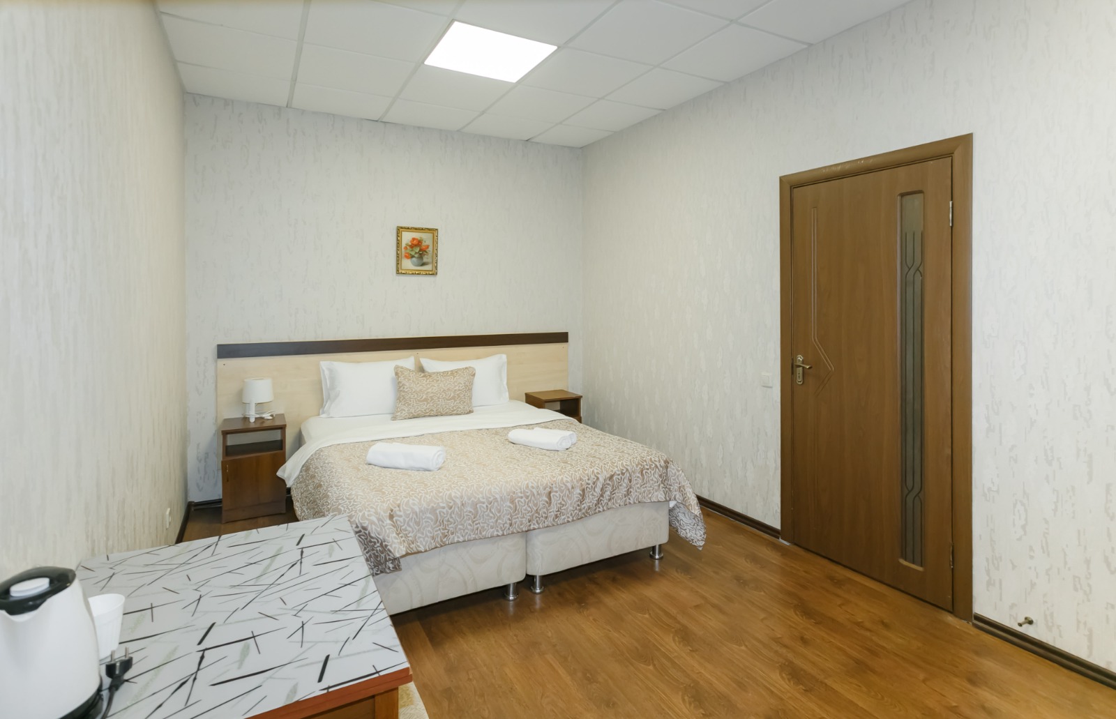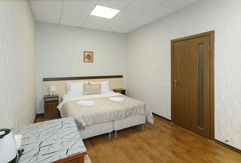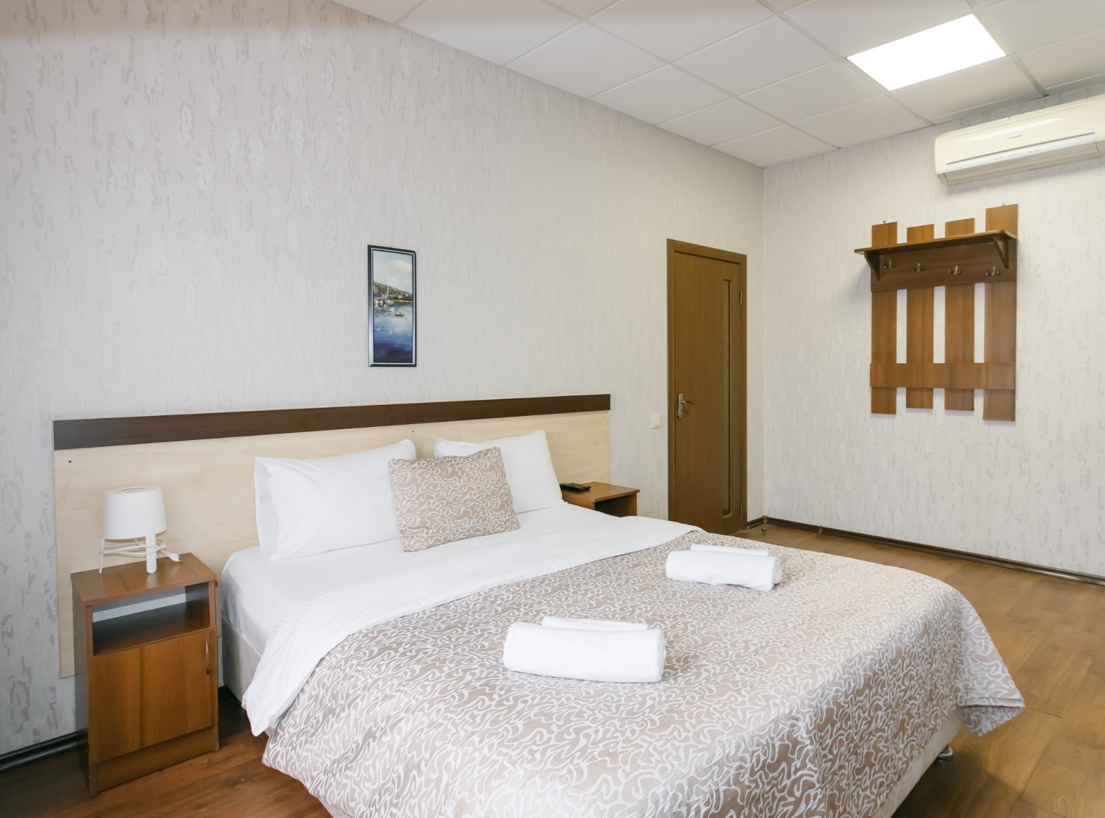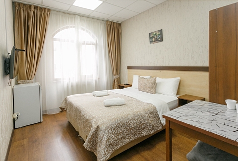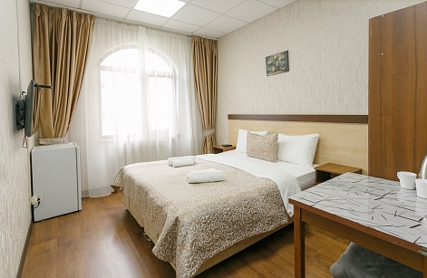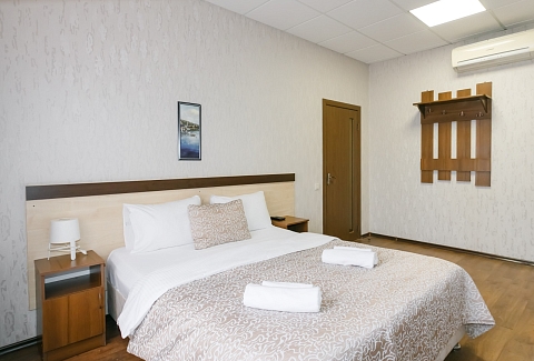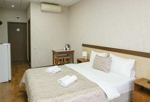В номере: вешалка, кровать двуспальная, прикроватные тумбочки, стол, шкаф, кондиционер, телевизор ЖК, холодильник, электрочайник
