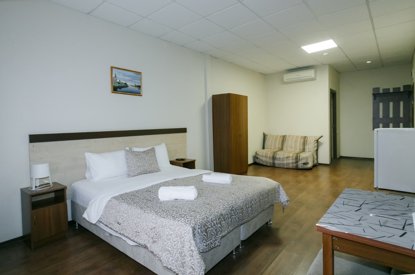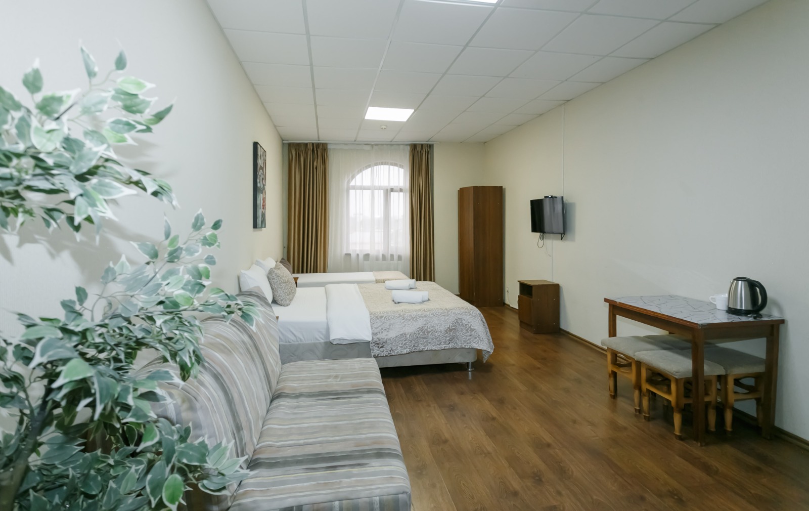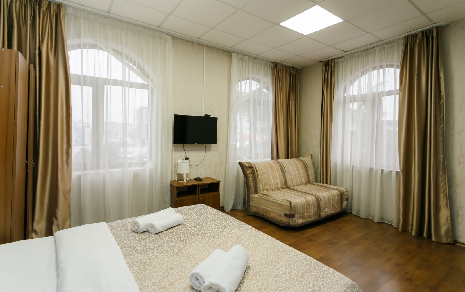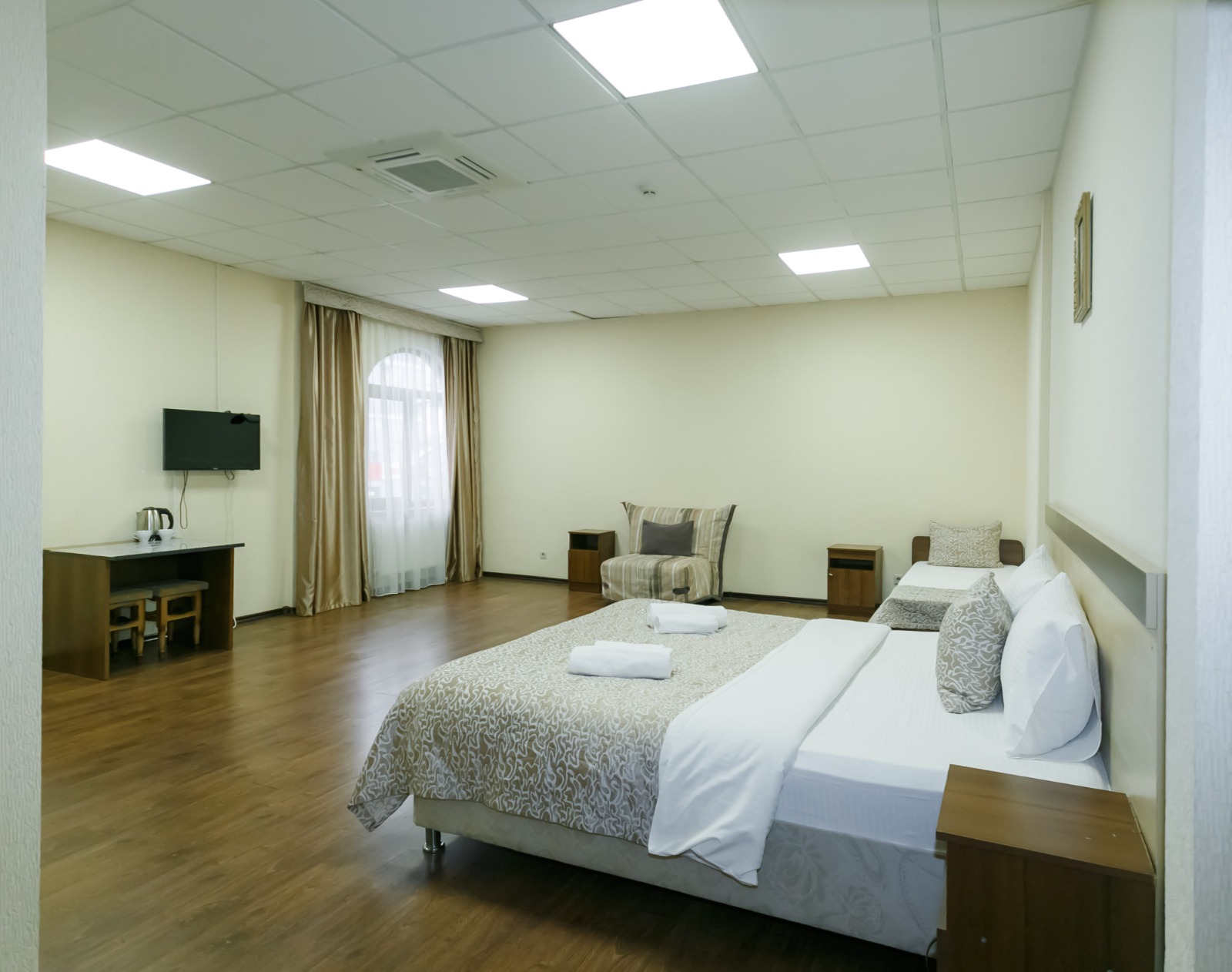 В номере: вешалка, диван, кровать двуспальная, кровать односпальная, прикроватные тумбочки, стол, шкаф, кондиционер, телевизор, холодильник, электрочайник