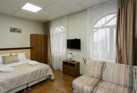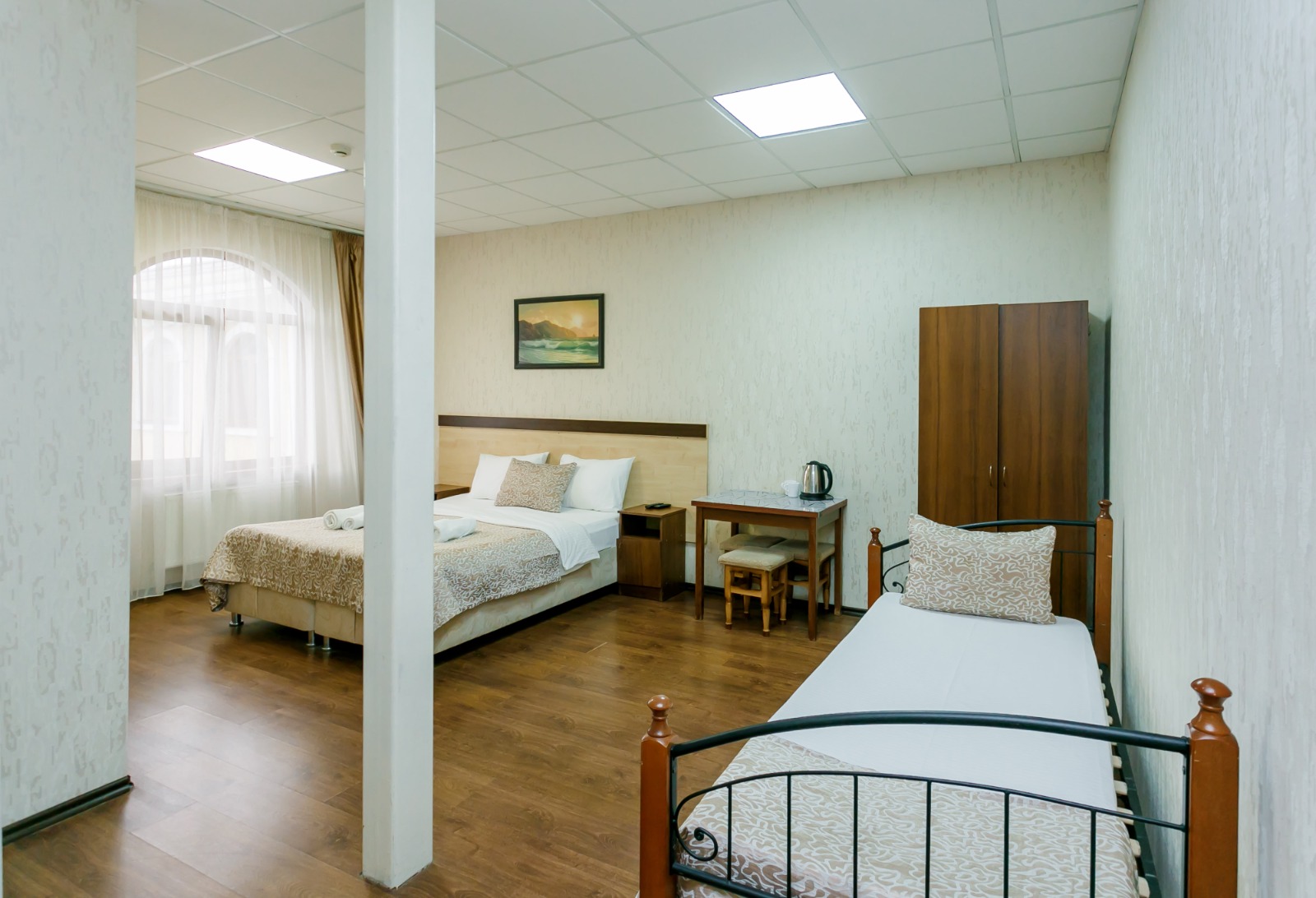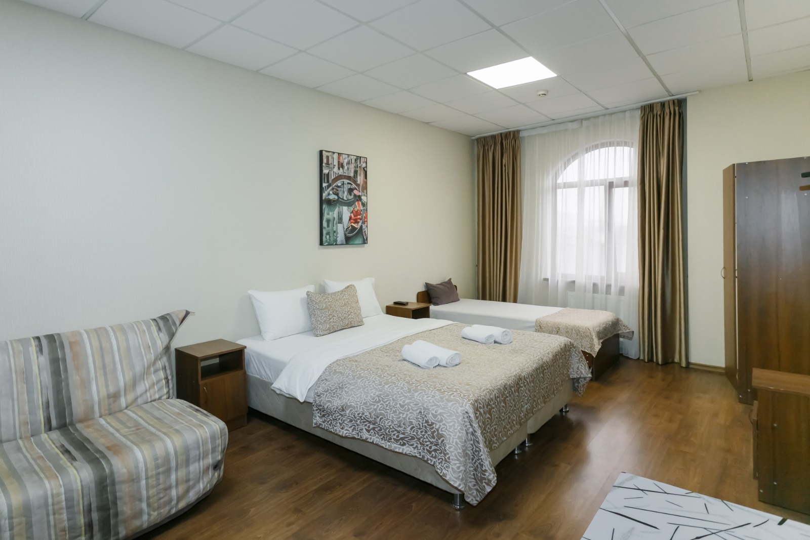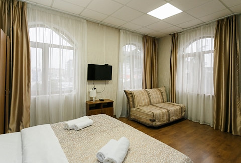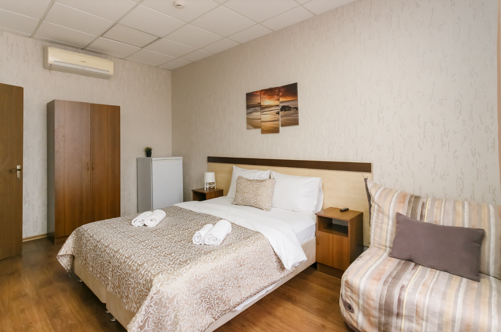 В номере: вешалка, диван, кровать двуспальная, кровать односпальная, прикроватные тумбочки, стол, шкаф, кондиционер, телевизор, холодильник, электрочайник