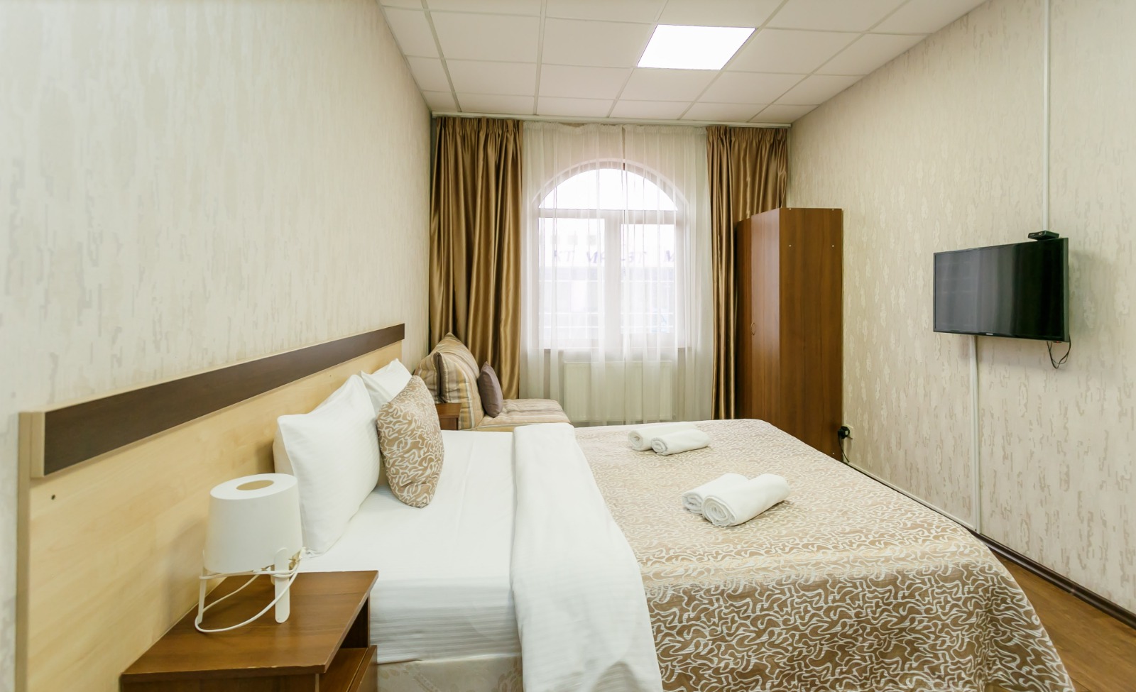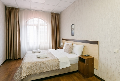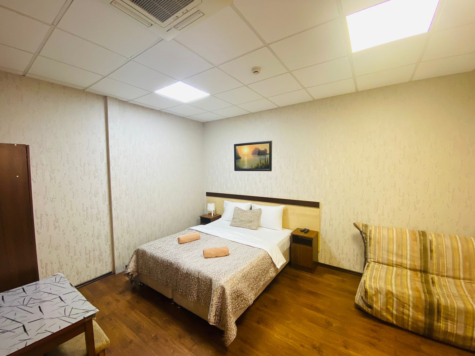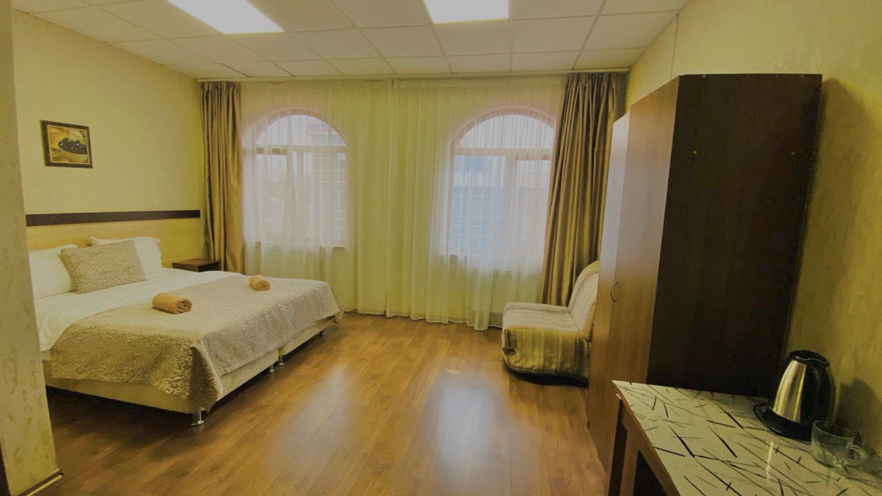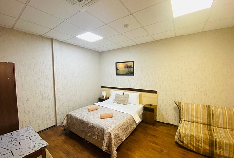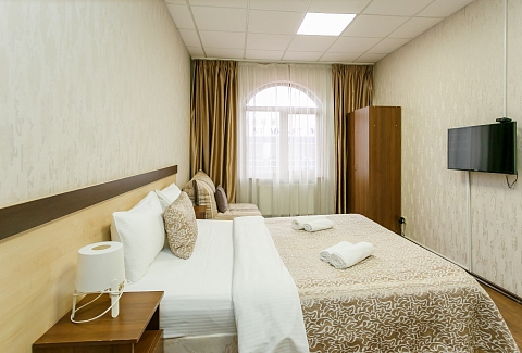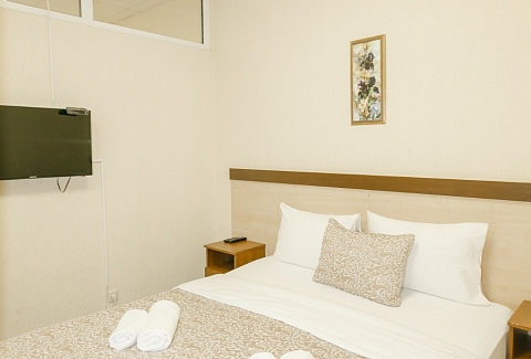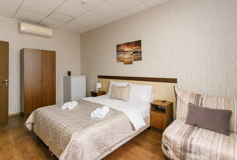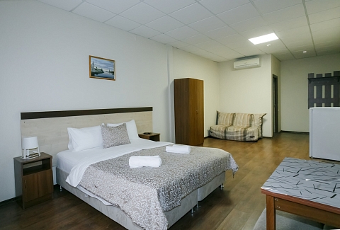 В номере: вешалка, кресло-кровать, кровать двуспальная, прикроватные тумбочки, стол, шкаф, кондиционер, телевизор ЖК, холодильник, электрочайник