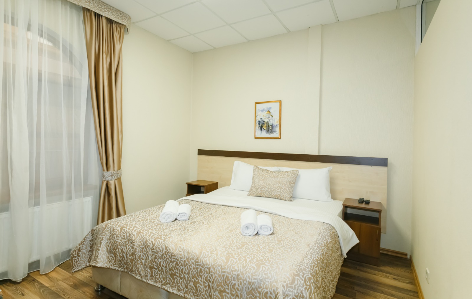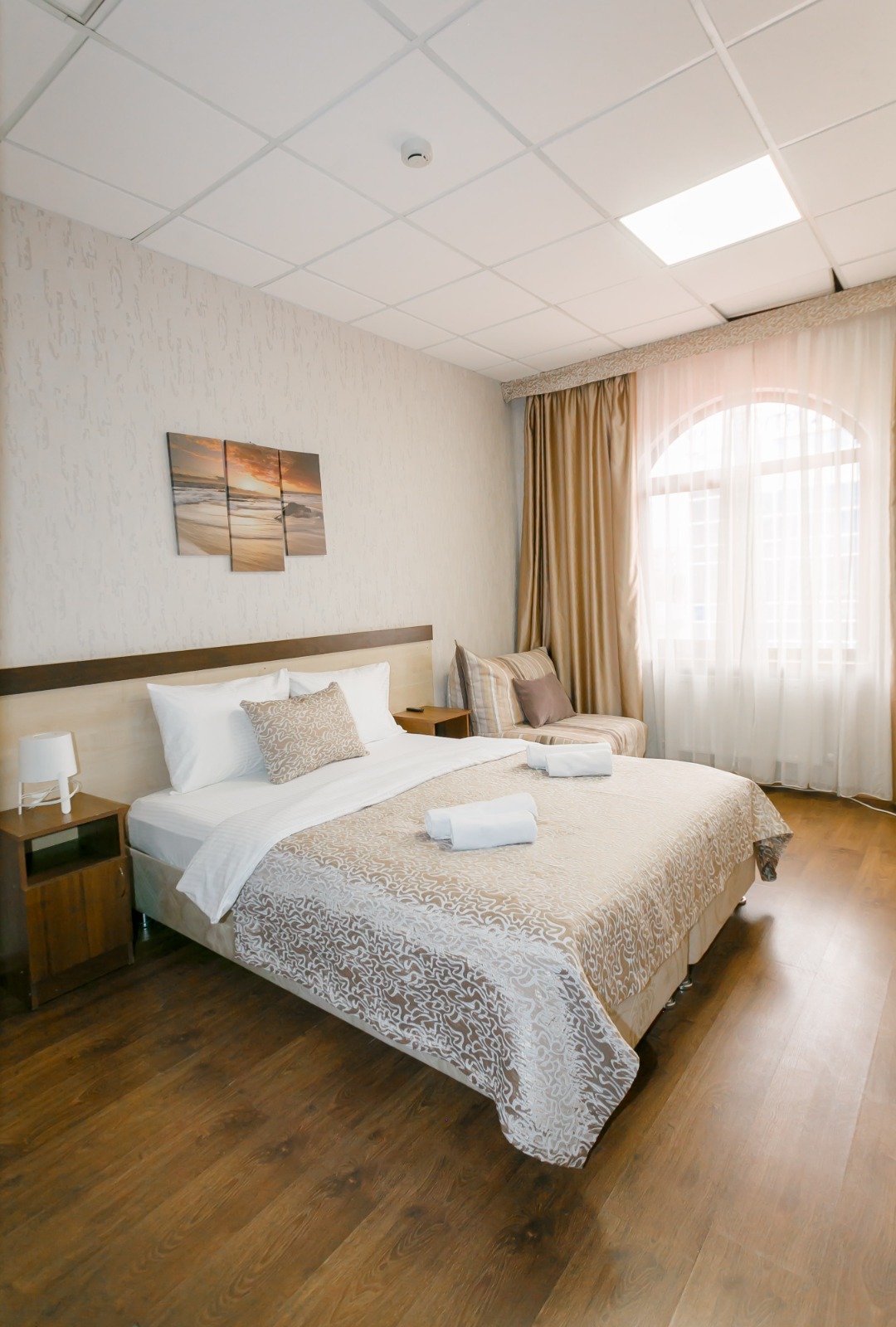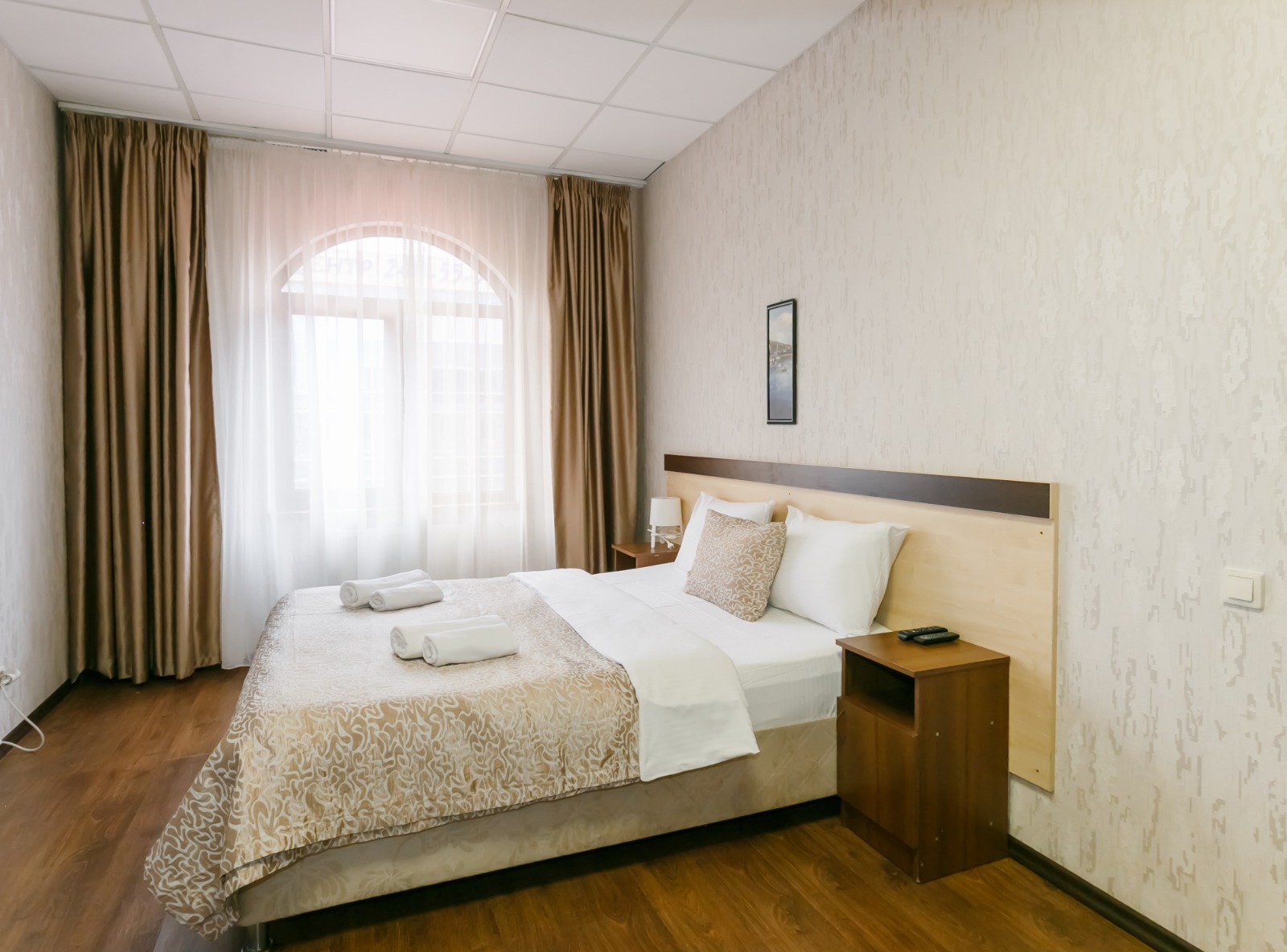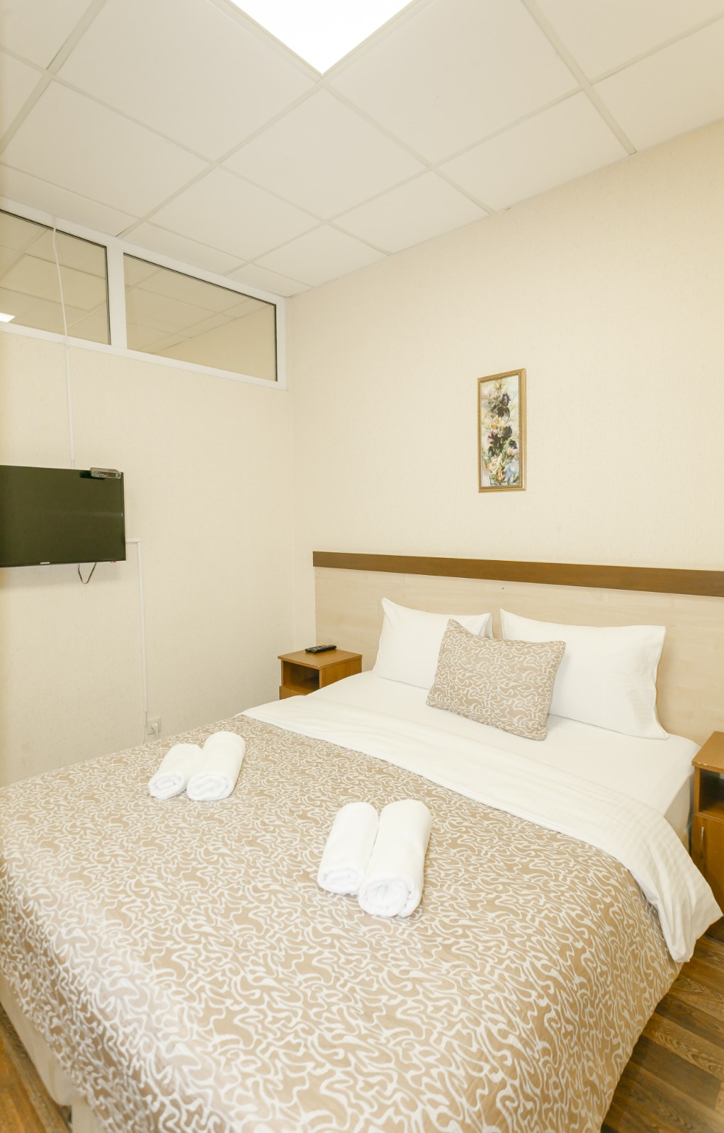 В номере: вешалка, кресло-кровать, кровать двуспальная, прикроватные тумбочки, стол, шкаф, кондиционер, телевизор ЖК, холодильник, электрочайник
