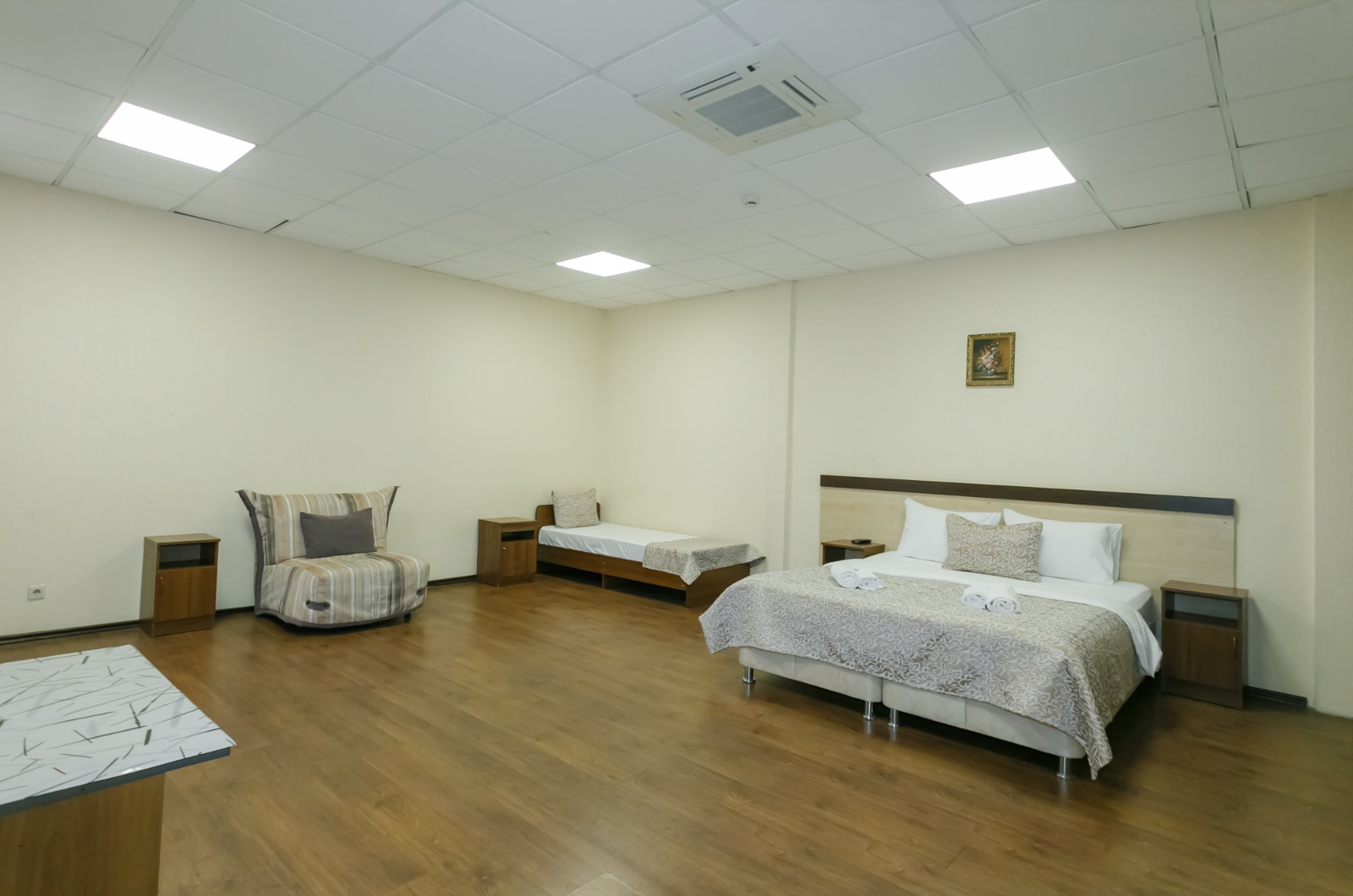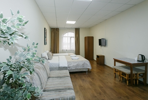 В номере: вешалка, диван, кровати односпальные, кровать двуспальная, прикроватные тумбочки, стол, шкаф, кондиционер, телевизор ЖК, холодильник, электрочайник