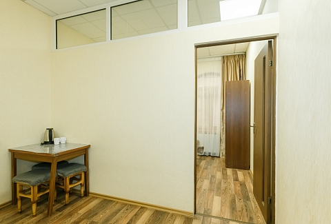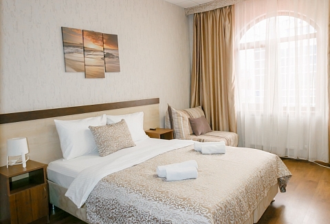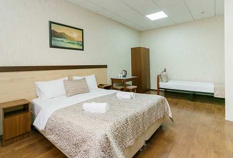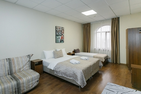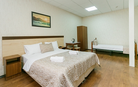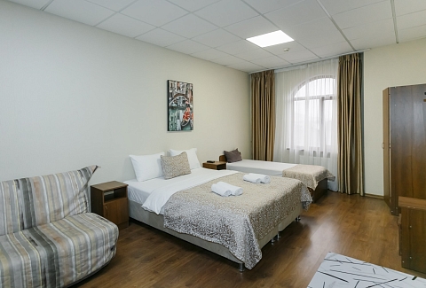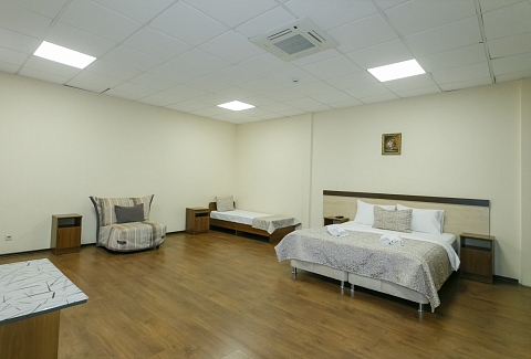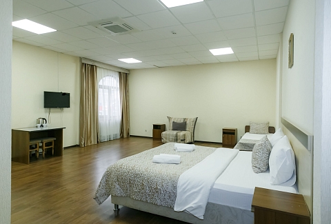 В номере: вешалка, диван, кровати односпальные, кровать двуспальная, прикроватные тумбочки, шкаф, кондиционер, телевизор ЖК, холодильник, электрочайник