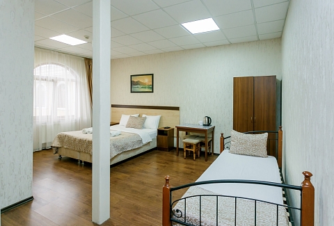 В номере: диван, кровати односпальные, кровать двуспальная, прикроватные тумбочки, стол, шкаф, кондиционер, телевизор ЖК, холодильник, электрочайник