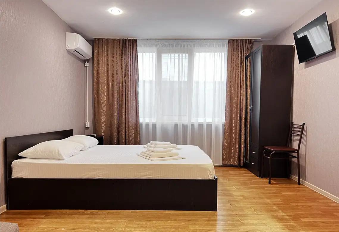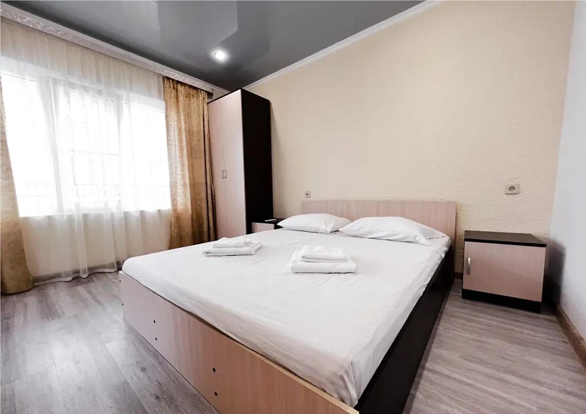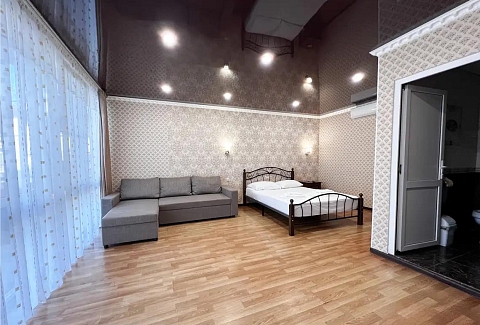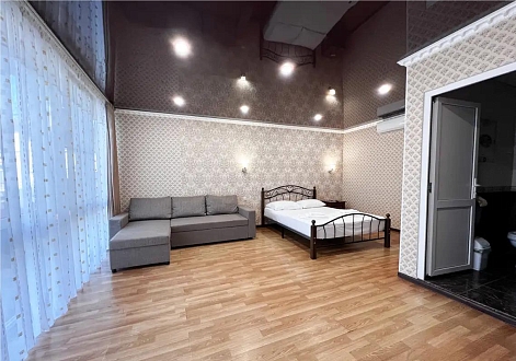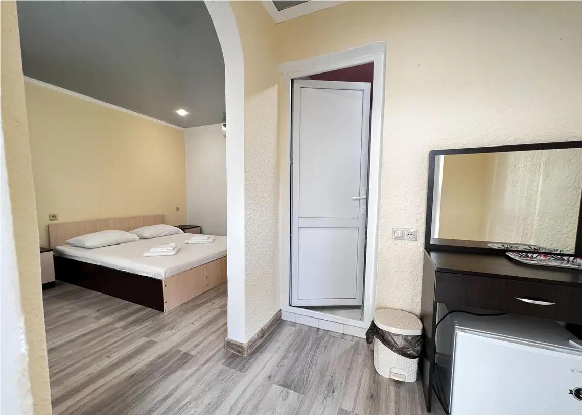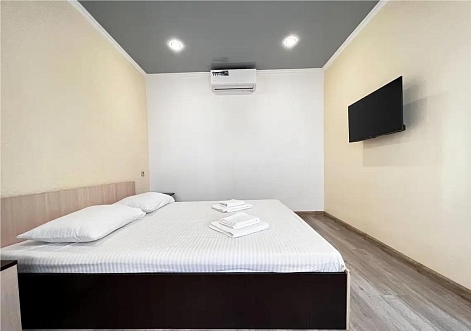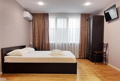 В номере: диван раскладной, кровать двуспальная, стол, стулья, шкаф, кондиционер, микроволновая печь, набор посуды, плита электрическая, телевизор, холодильник