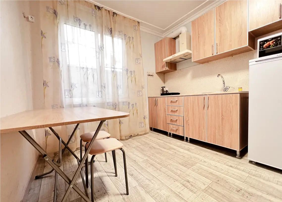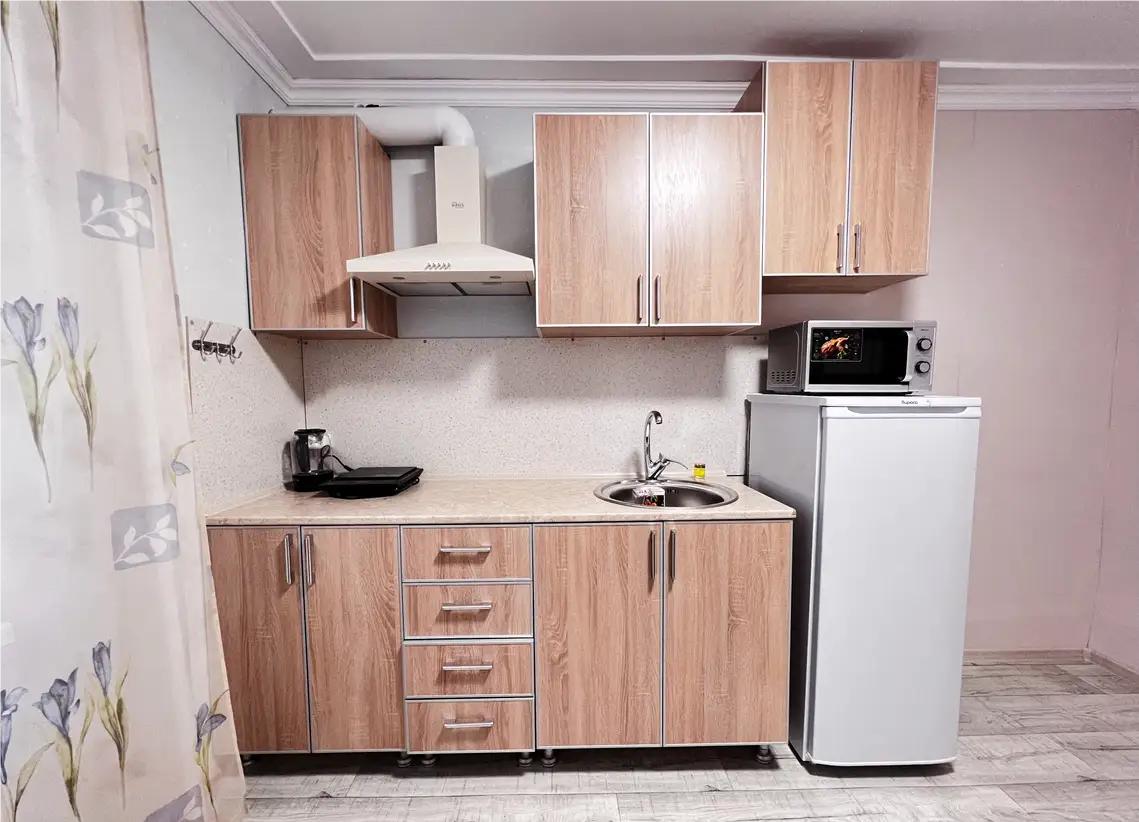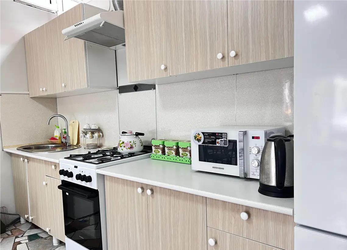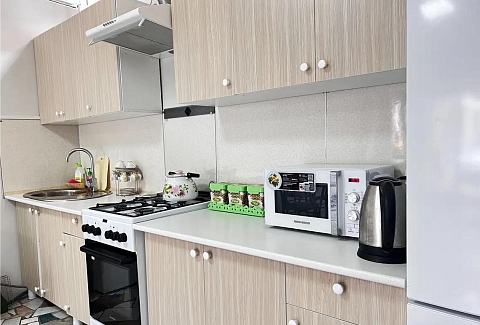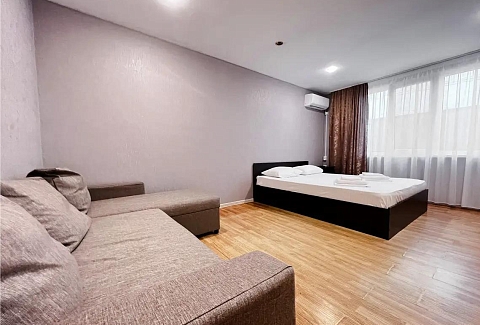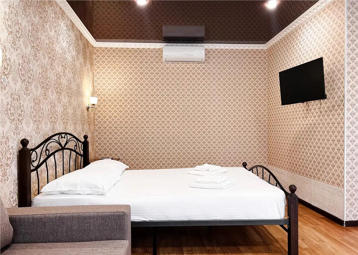 В номере: диван раскладной, кровать двуспальная, стол, стулья, шкаф, кондиционер, микроволновая печь, набор посуды, плита электрическая, телевизор, холодильник
