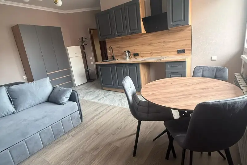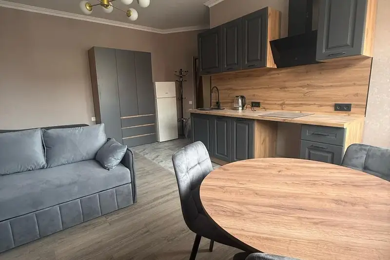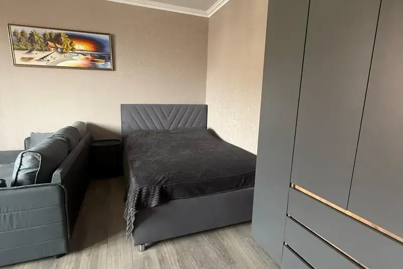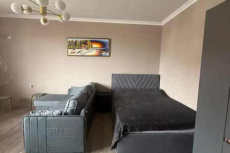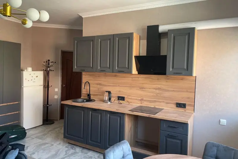 В номере: вешалка, диван раскладной, кровать двуспальная, кухонная мебель, прикроватная тумбочка, стол, стулья, шкаф, кондиционер, набор посуды, плита электрическая, телевизор ЖК, холодильник, электрочайник