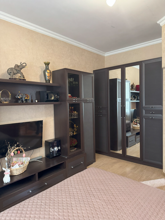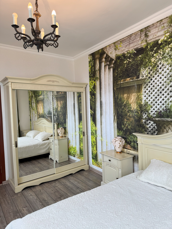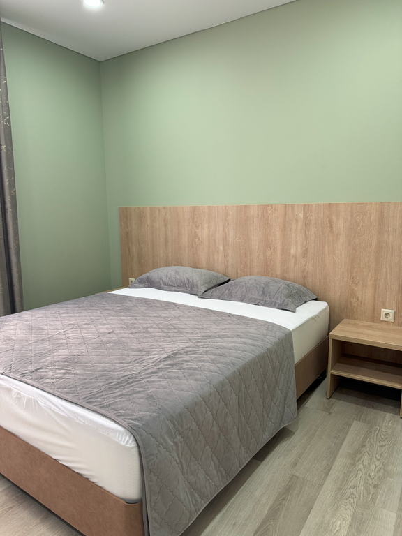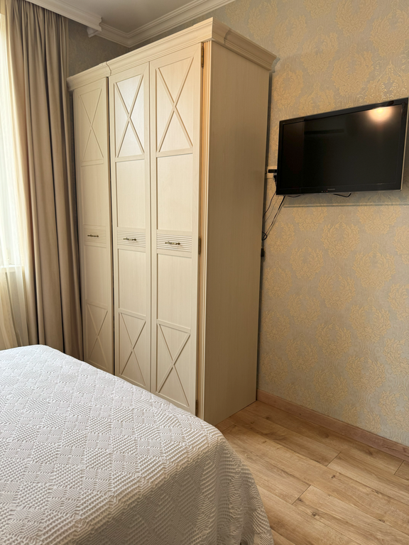 В номере: вешалка, зеркало, кровать двуспальная, прикроватные тумбочки, шкаф, кондиционер, телевизор