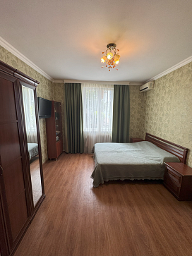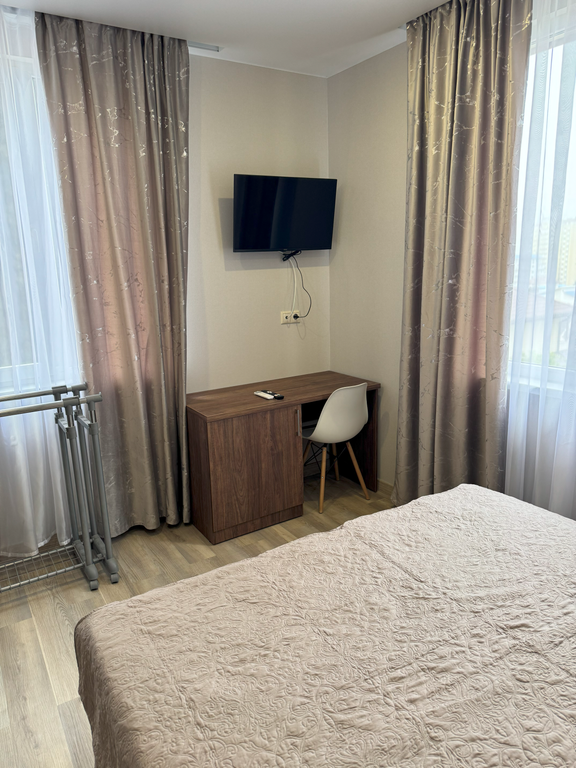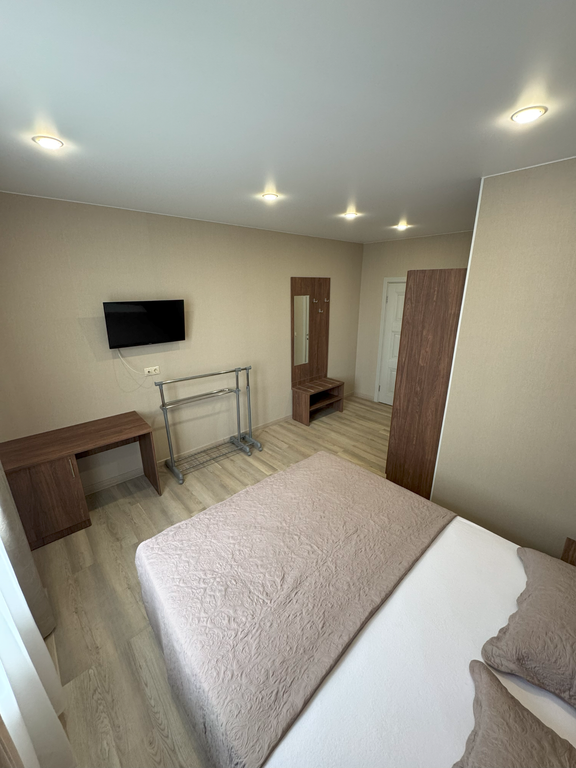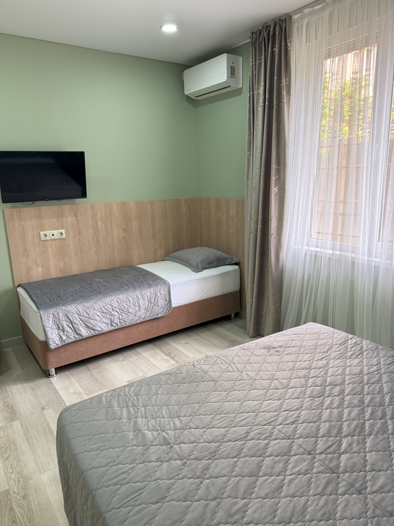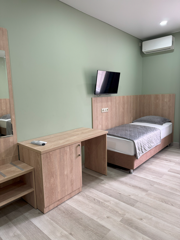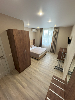 В номере: вешалка, зеркало, кровать двуспальная, кровать односпальная, стол, шкаф, кондиционер, телевизор