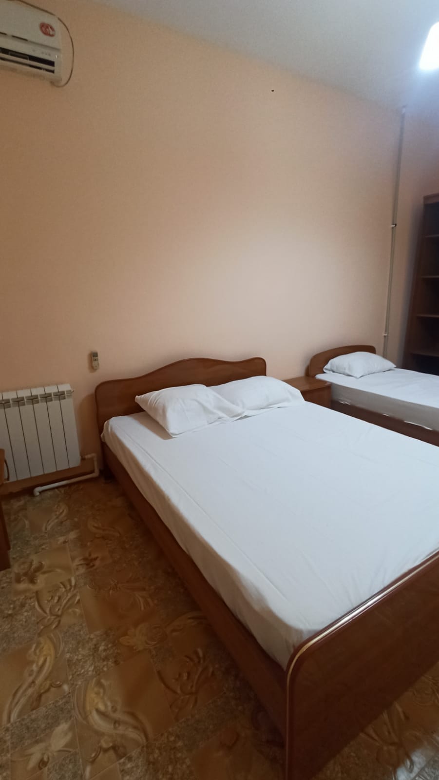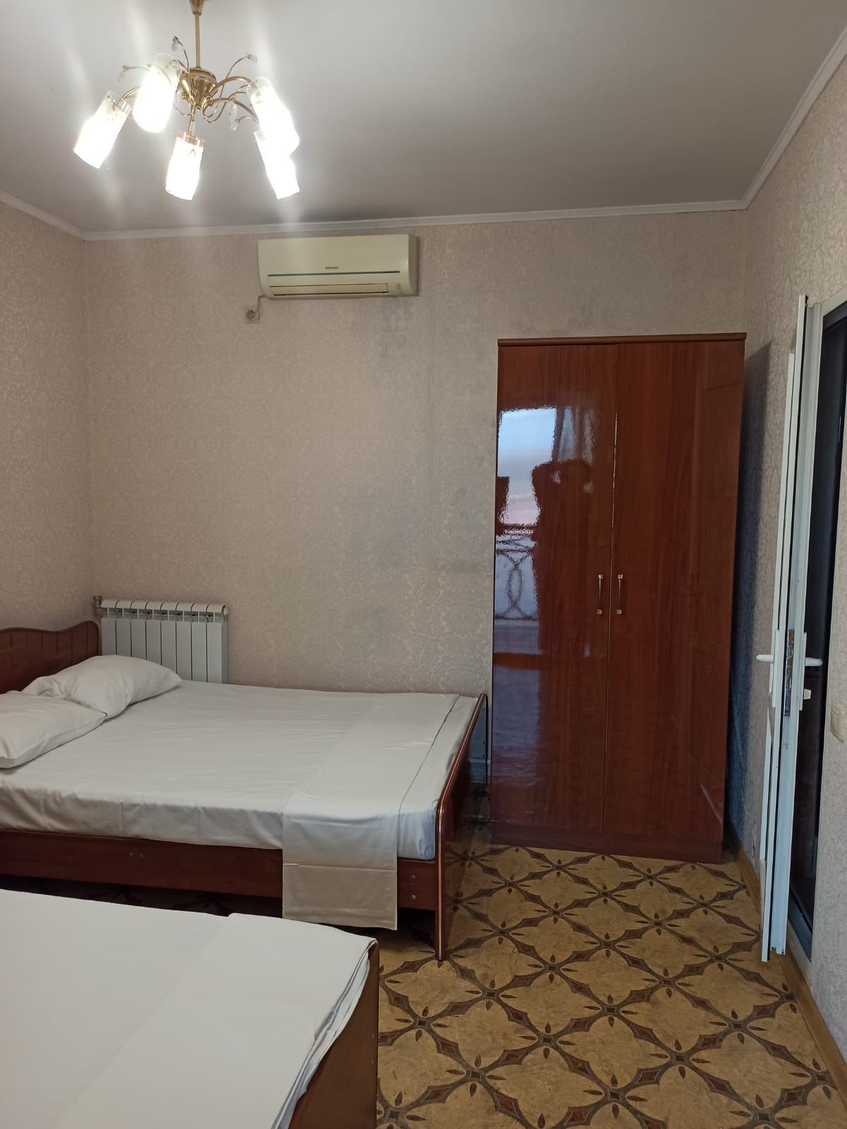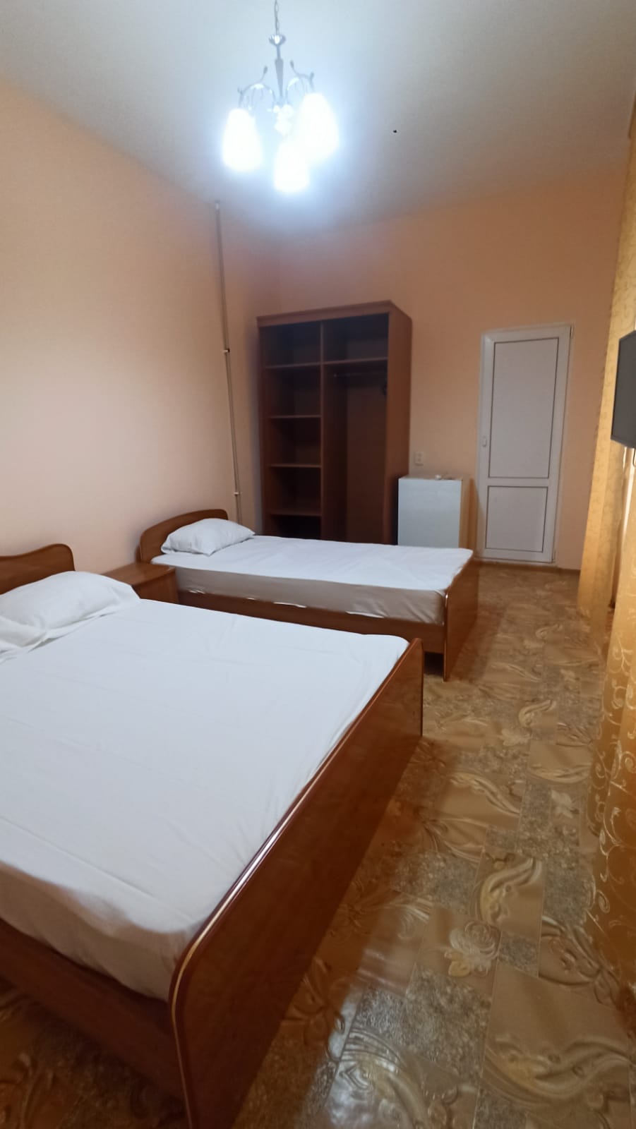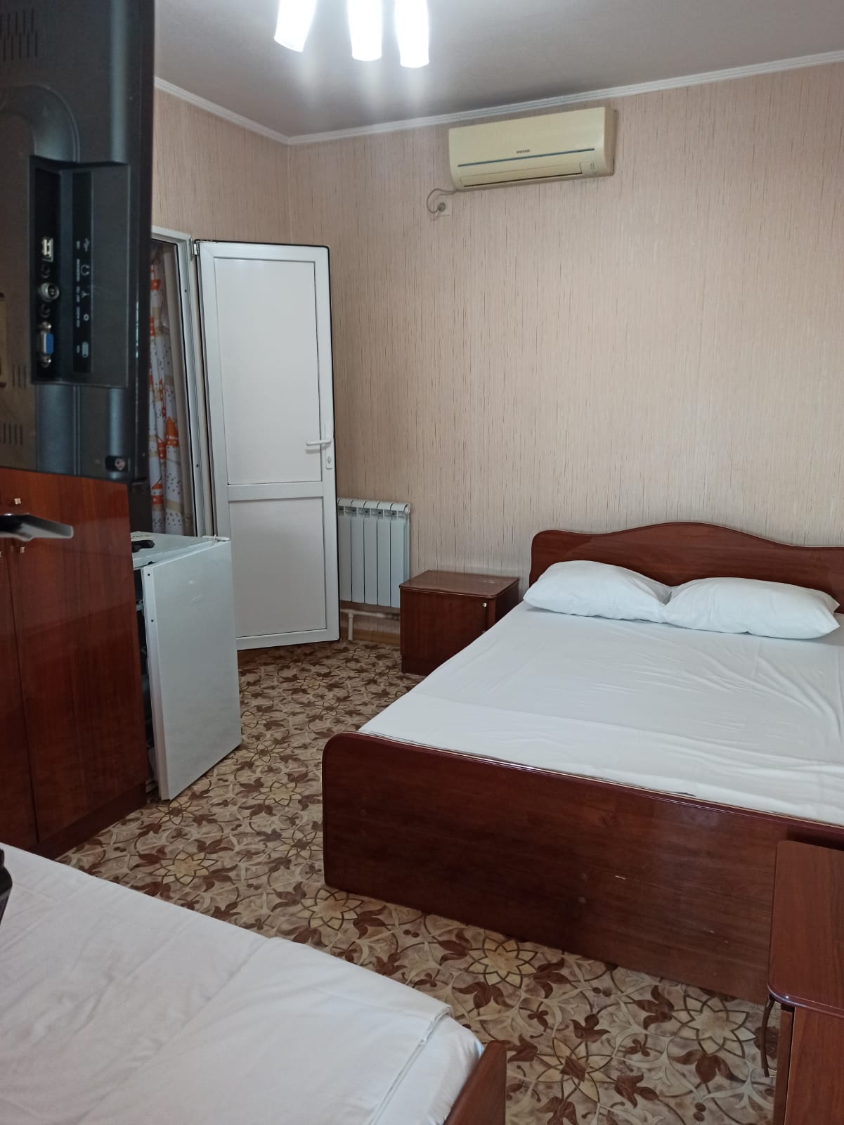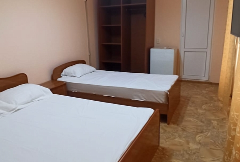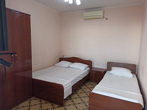 В номере: вешалка, кровать двуспальная, кровать односпальная, стол, стулья, шкаф, кондиционер, телевизор