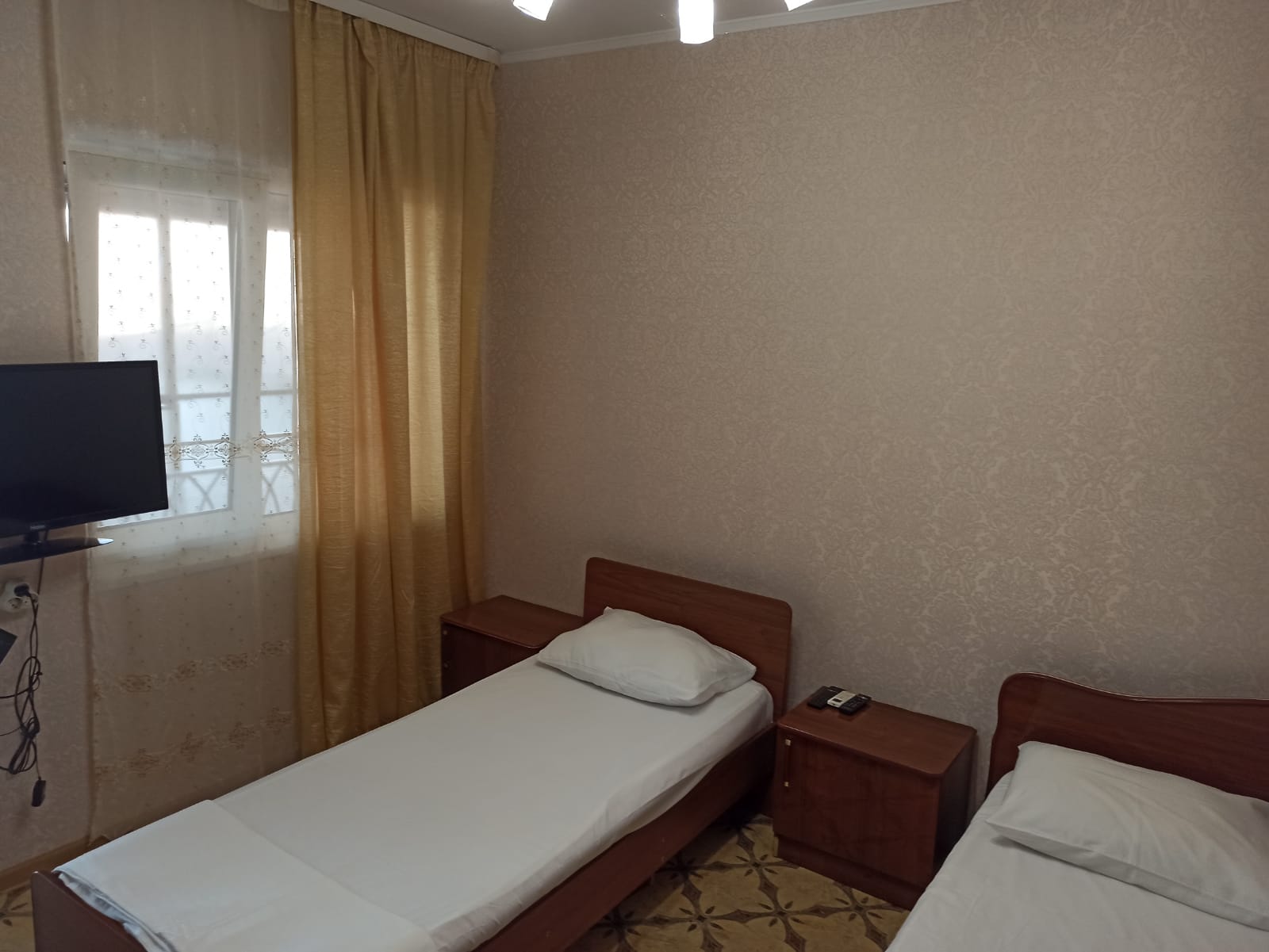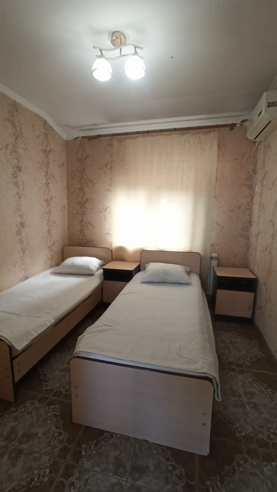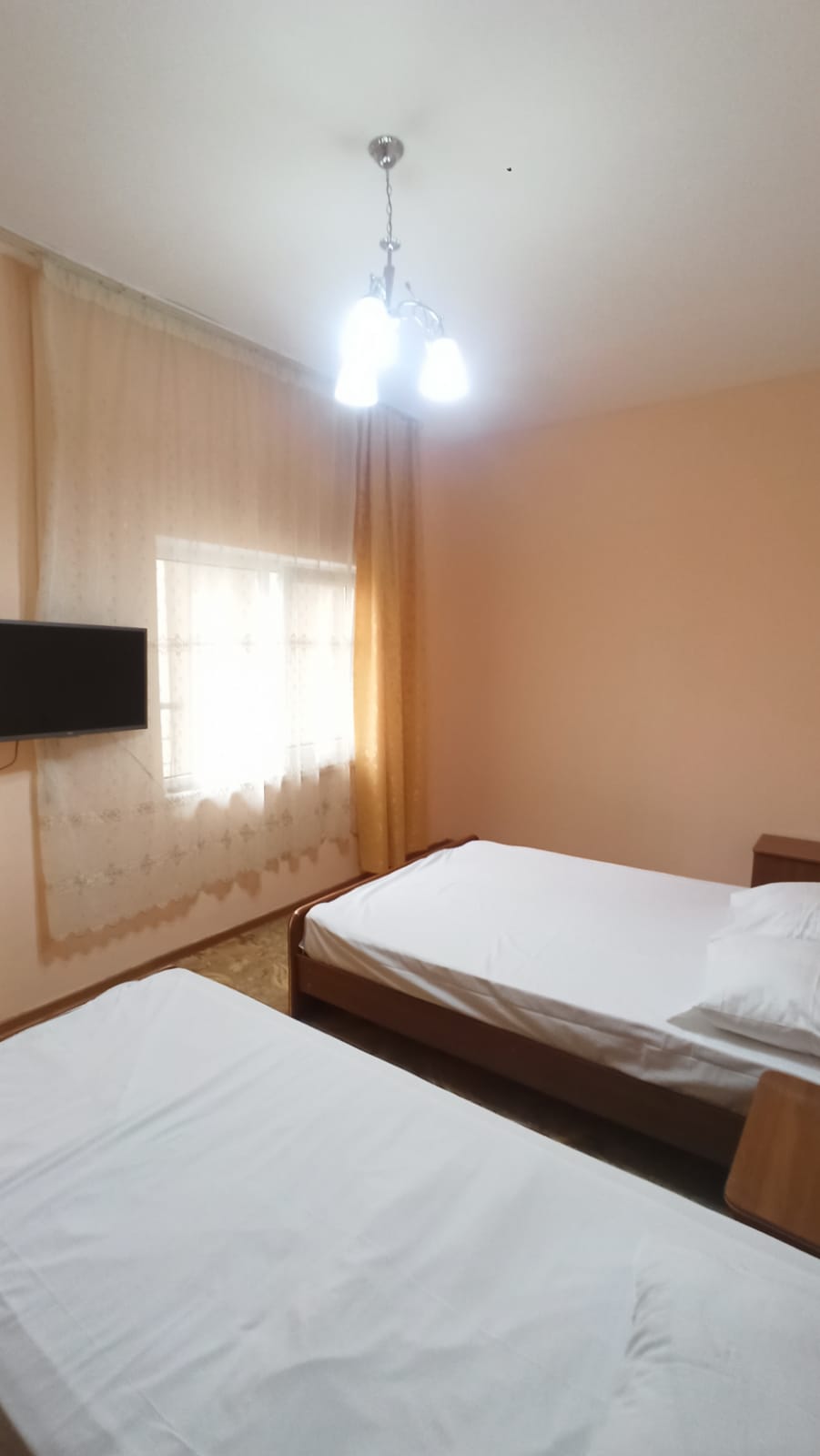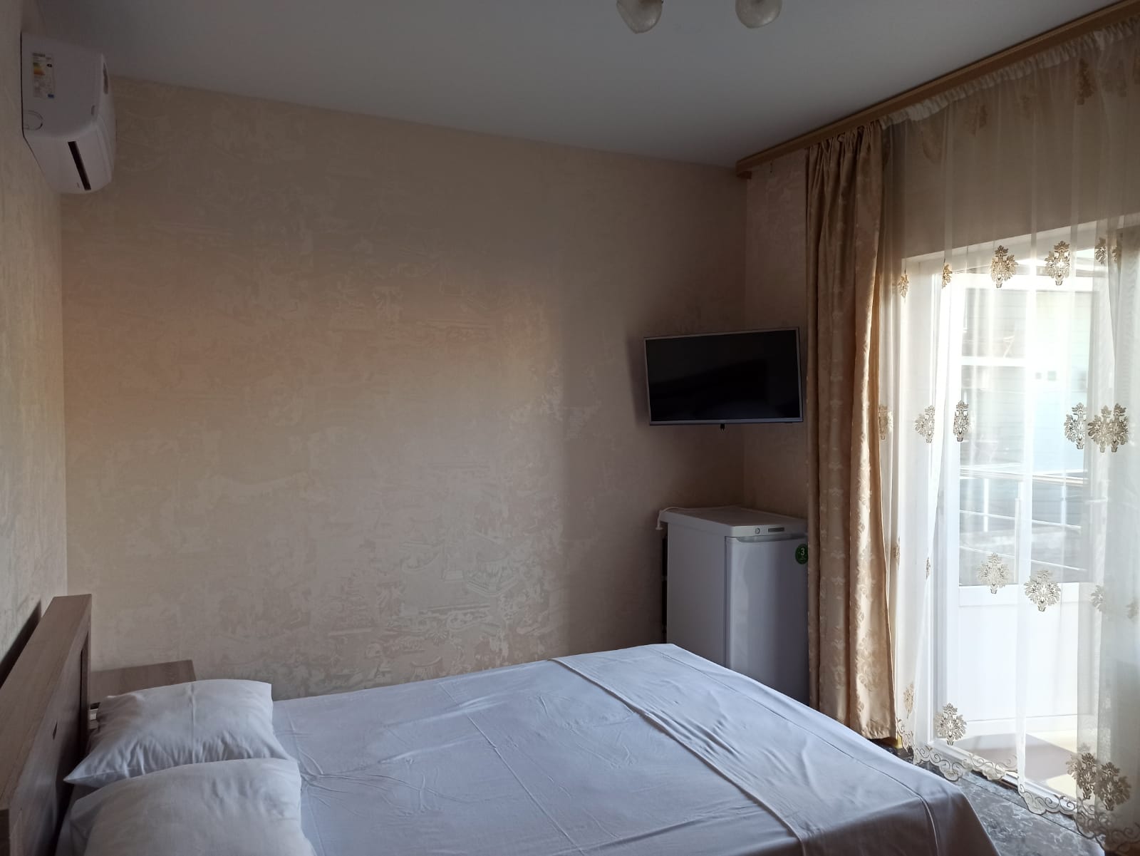 В номере: вешалка, кровать двуспальная, кровать односпальная, стол, стулья, шкаф, кондиционер, телевизор