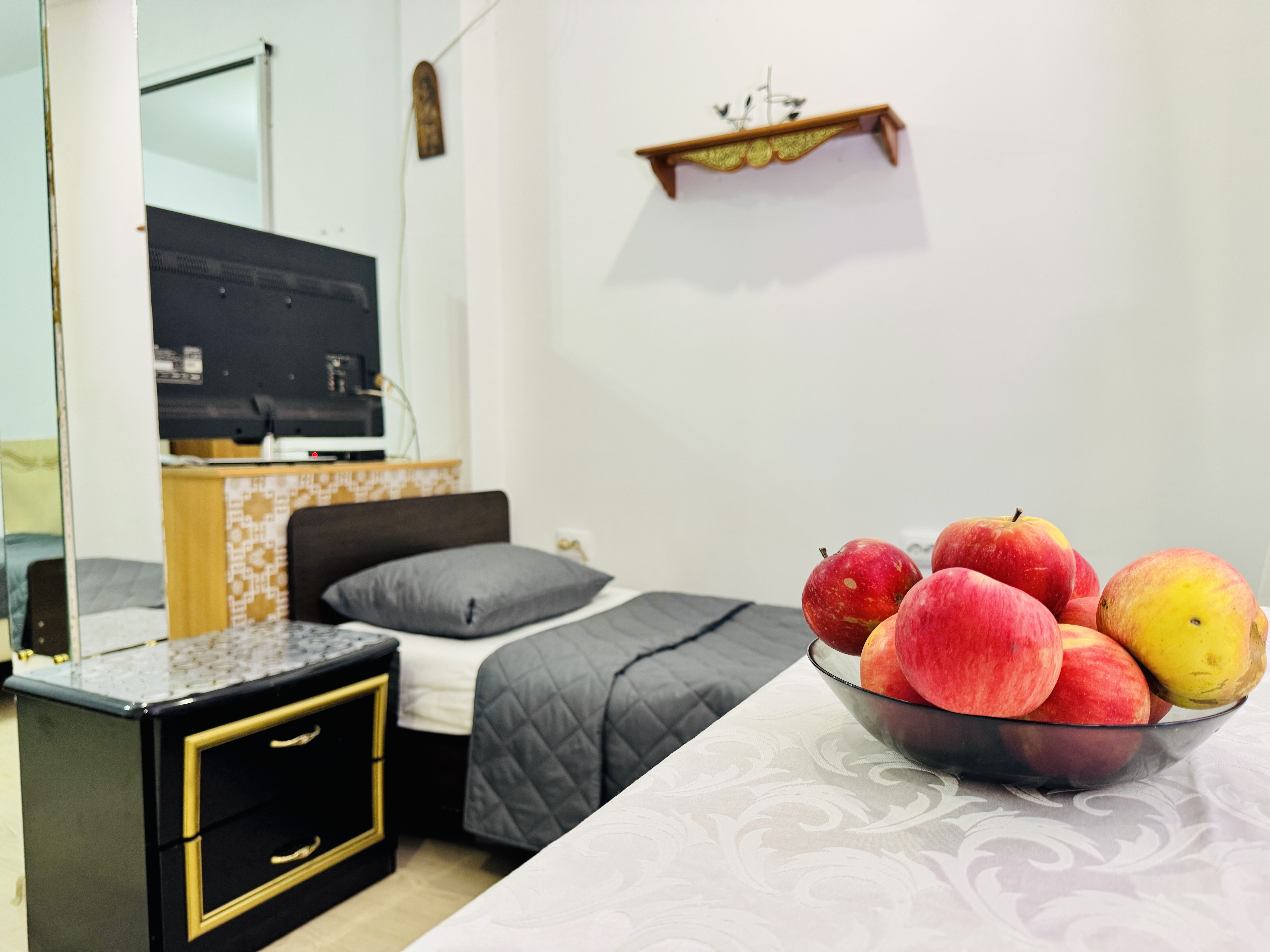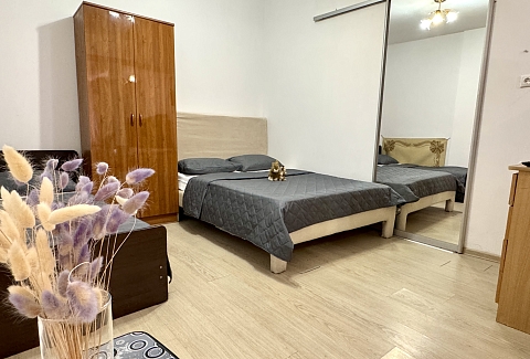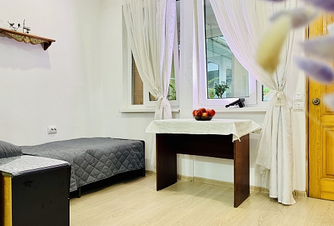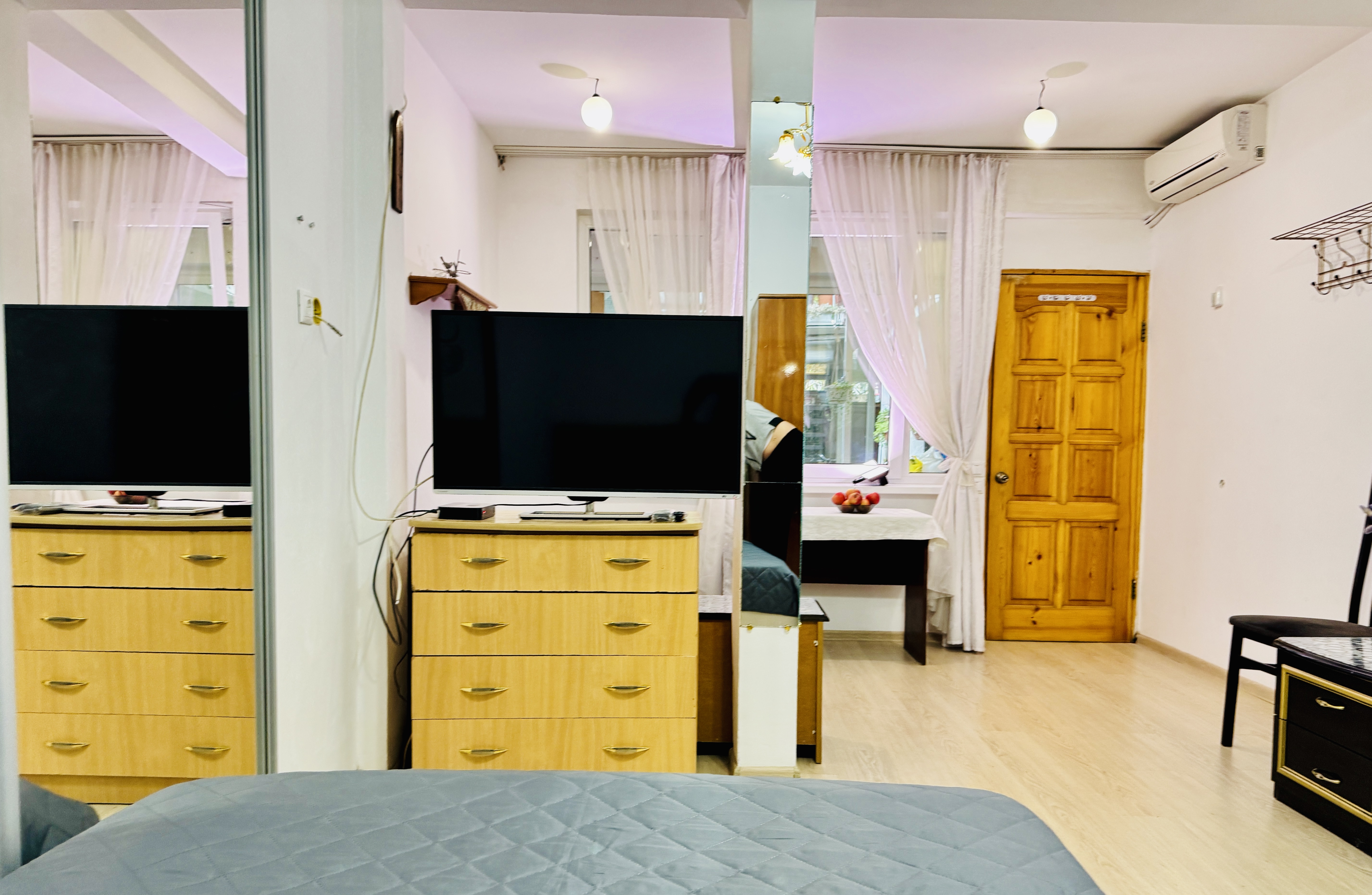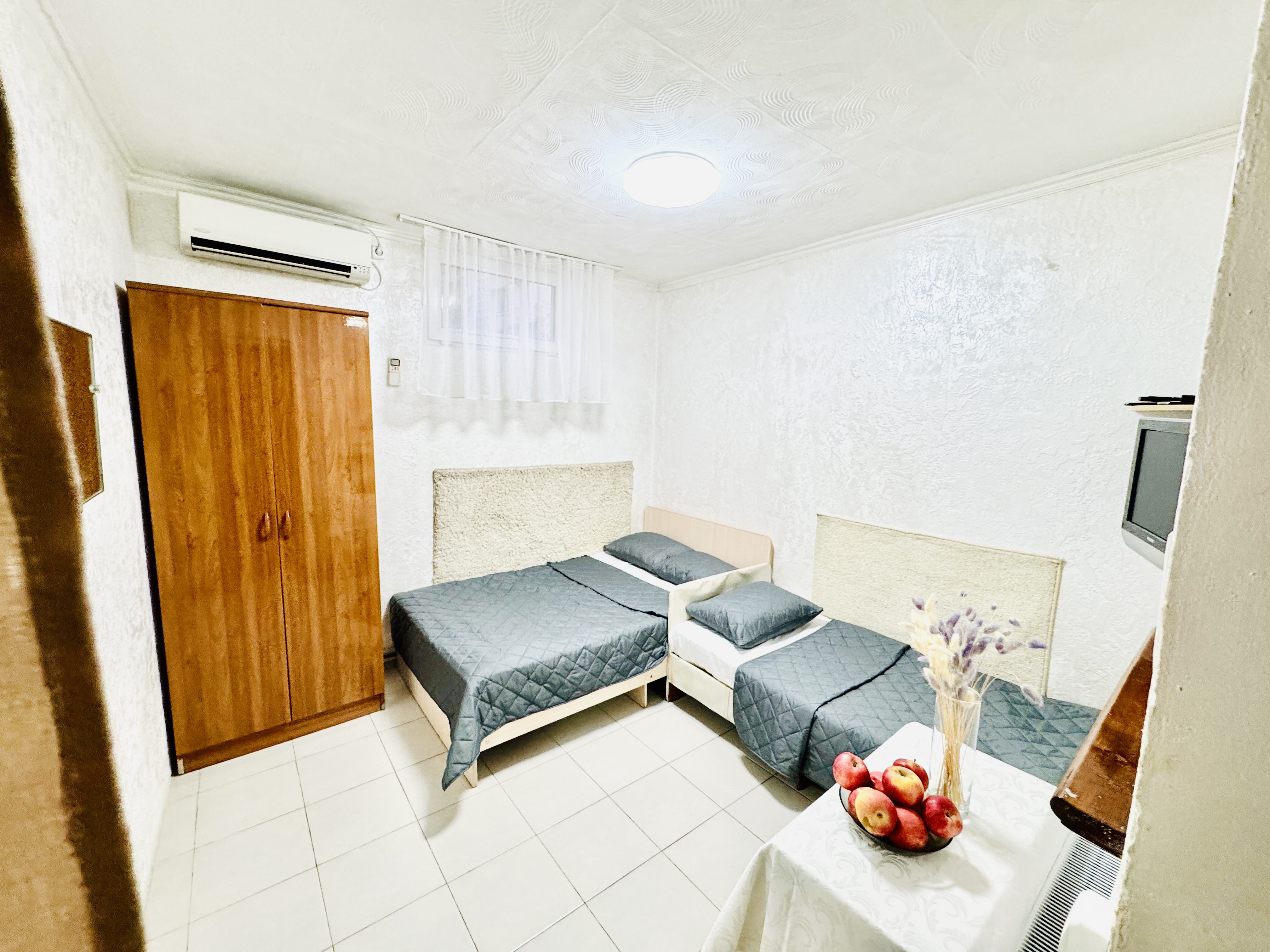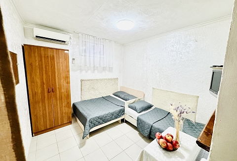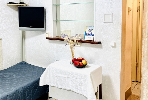В номере: вешалка, зеркало, кровать односпальная, кровать полутороспальная, прикроватная тумбочка, стол, шкаф, кондиционер, телевизор ЖК, холодильник