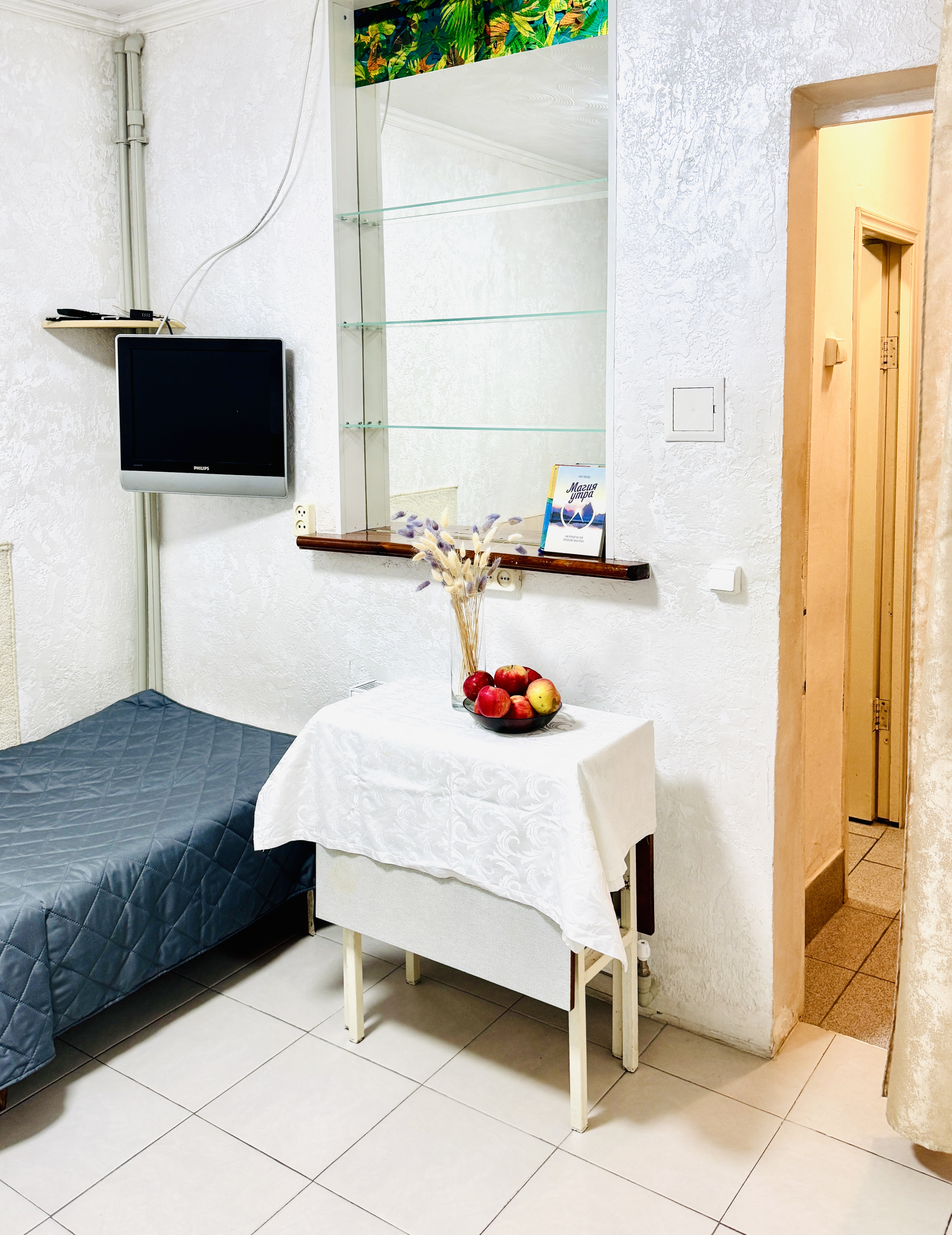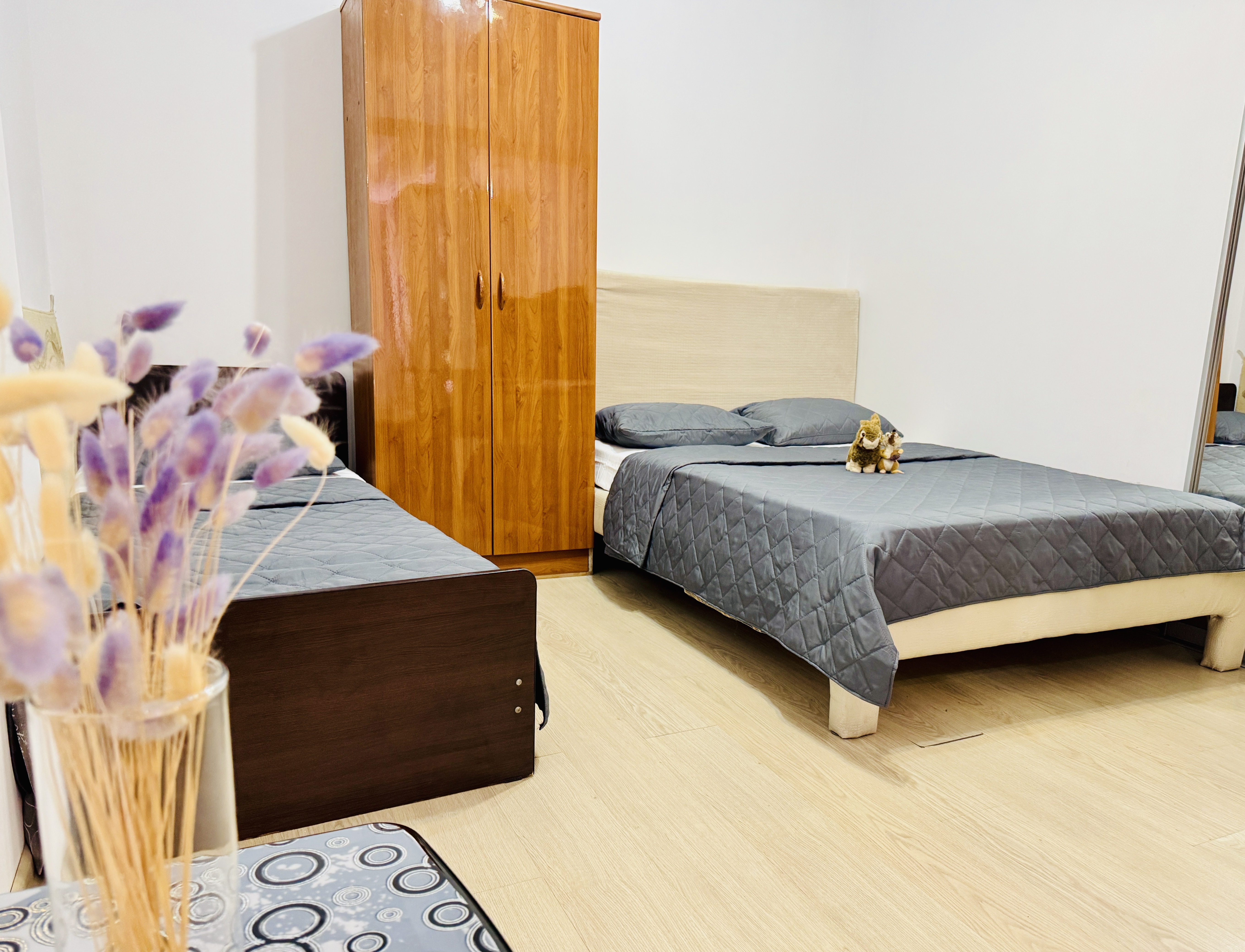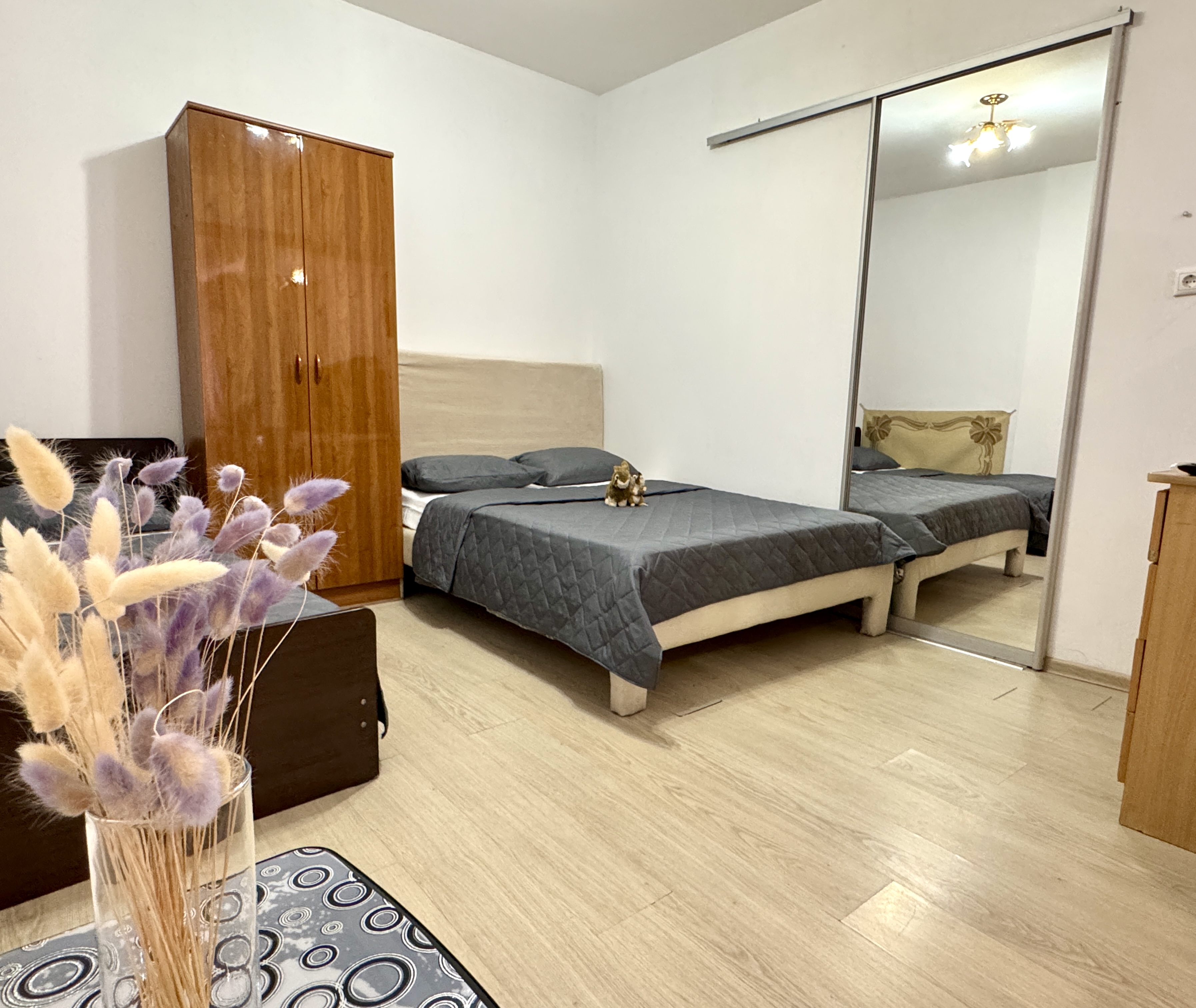 В номере: вешалка, зеркало, кровать односпальная, кровать полутороспальная, прикроватная тумбочка, стол, шкаф, кондиционер, телевизор ЖК, холодильник