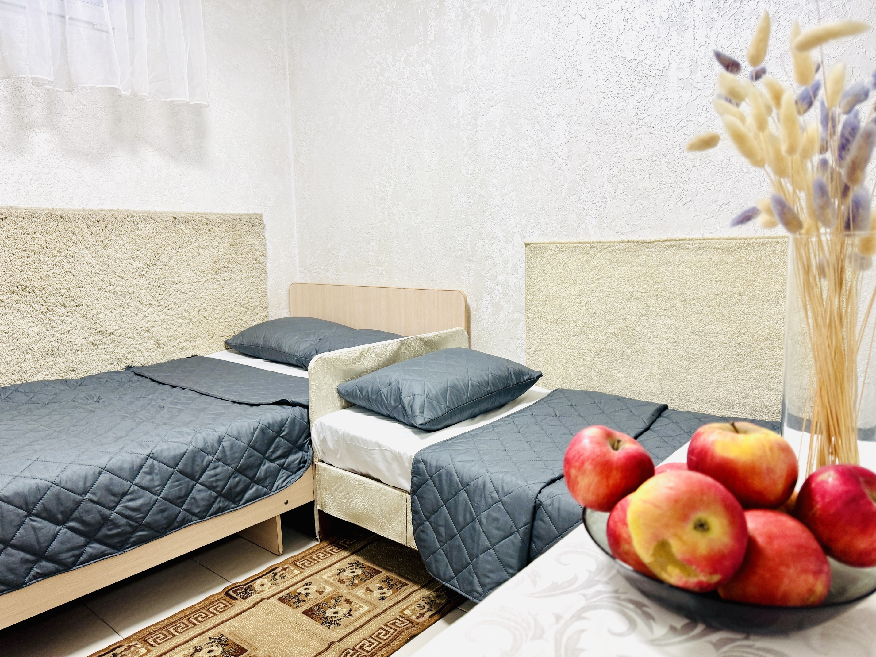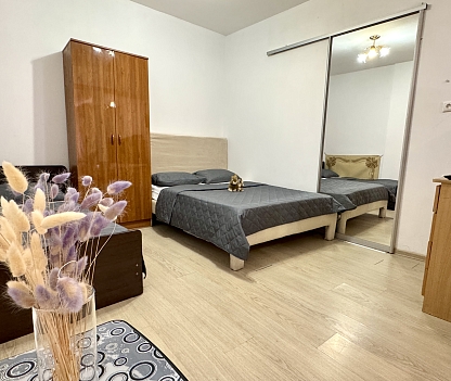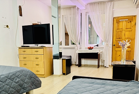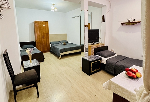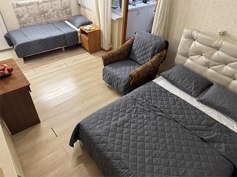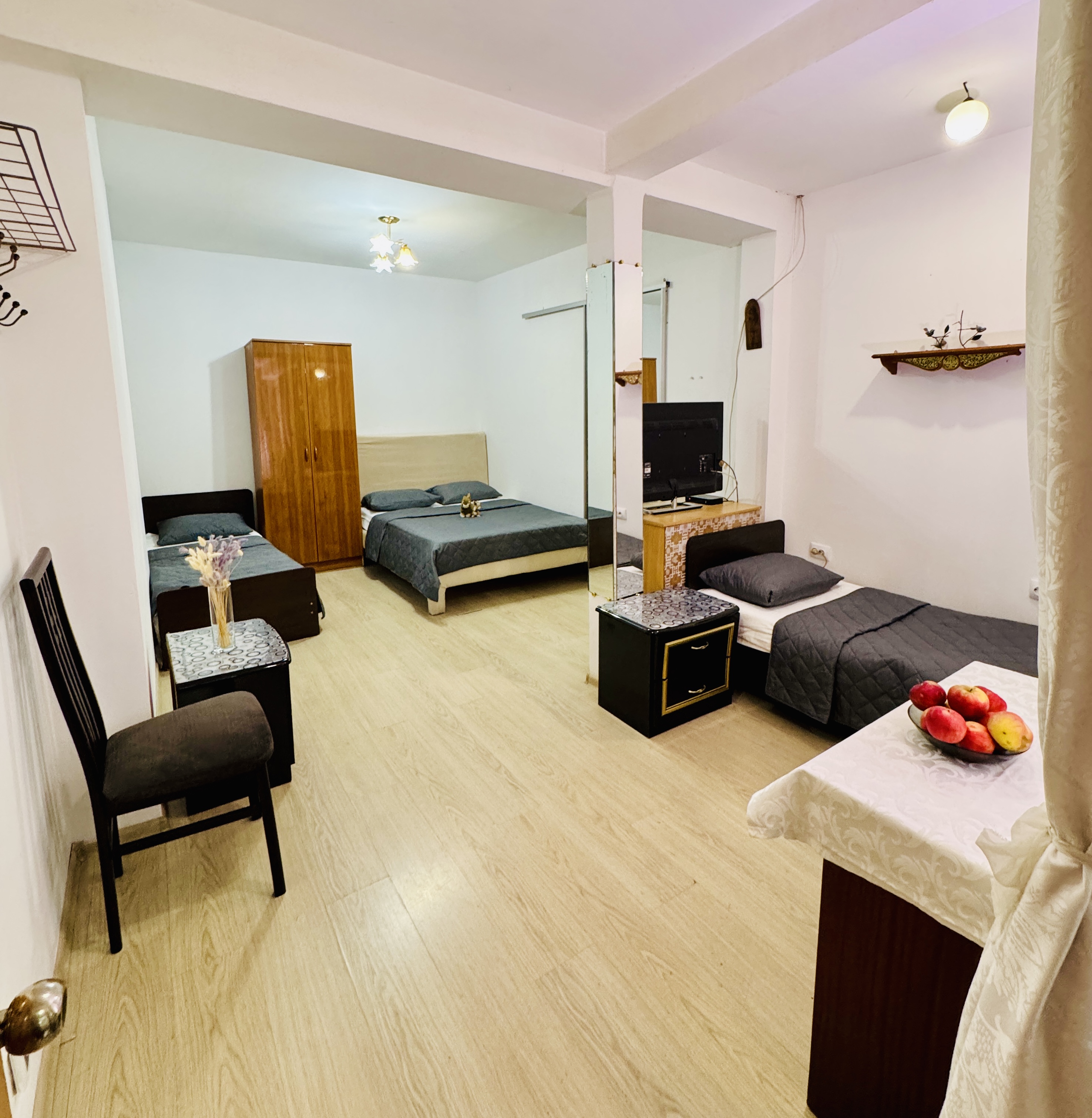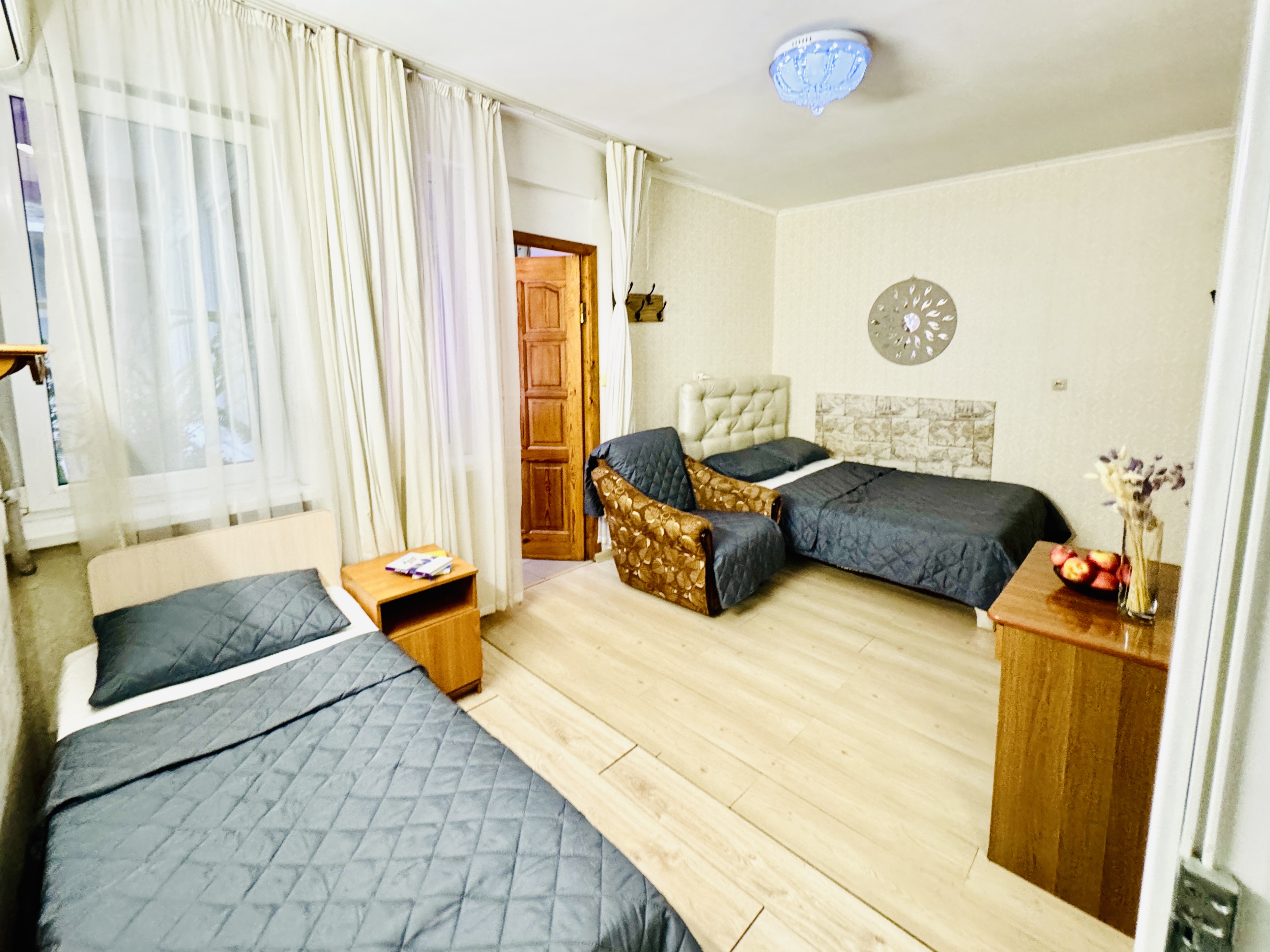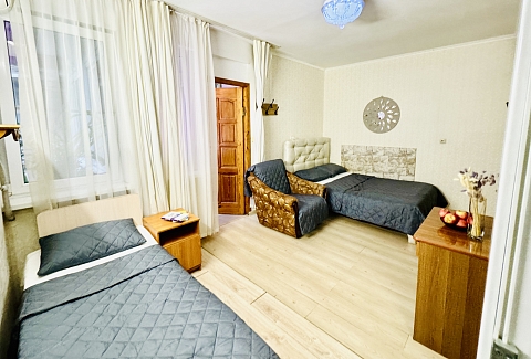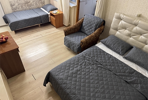 В номере: вешалка, зеркало, кровати односпальные, кровать двуспальная, прикроватные тумбочки, стол, стул, шкаф, кондиционер, телевизор ЖК, холодильник